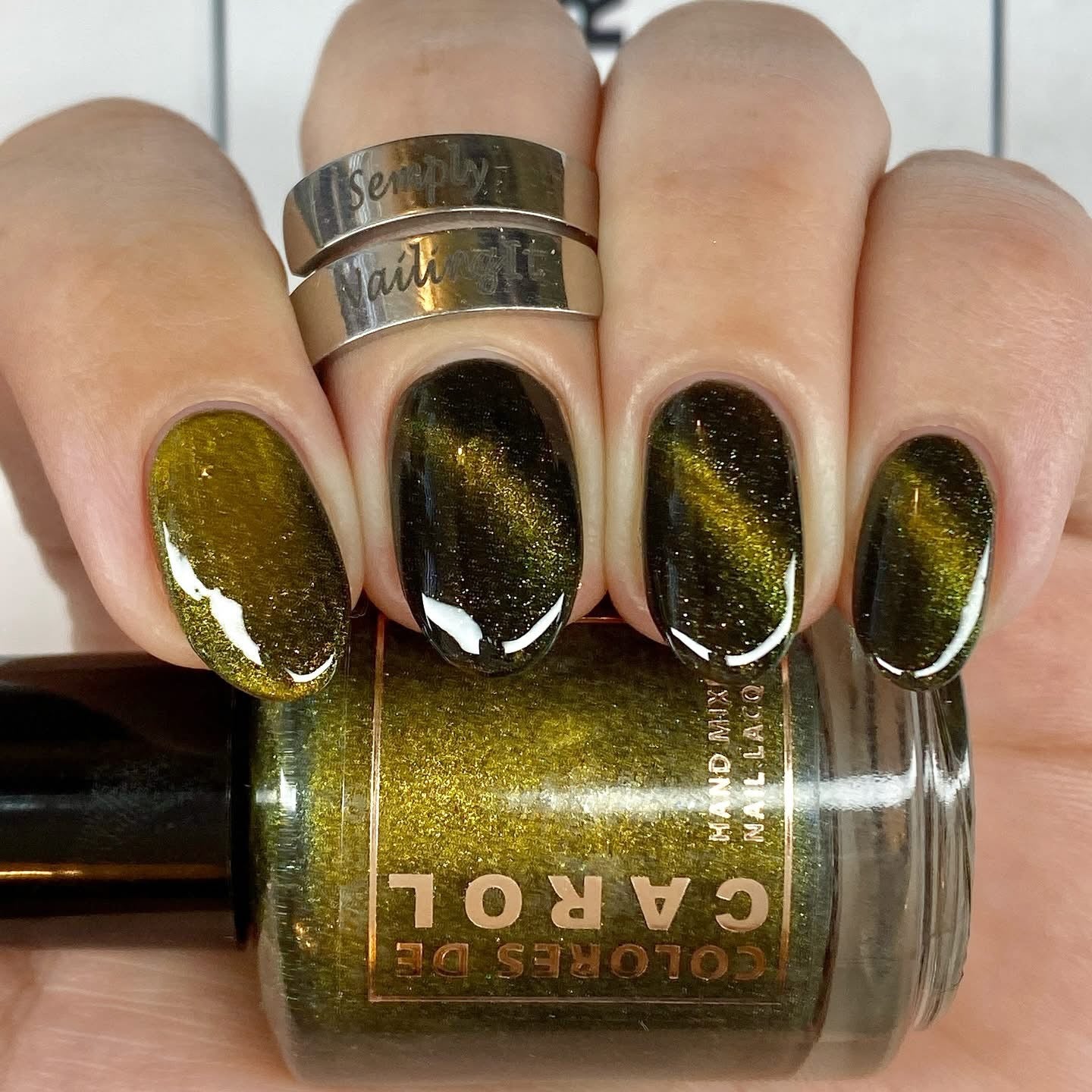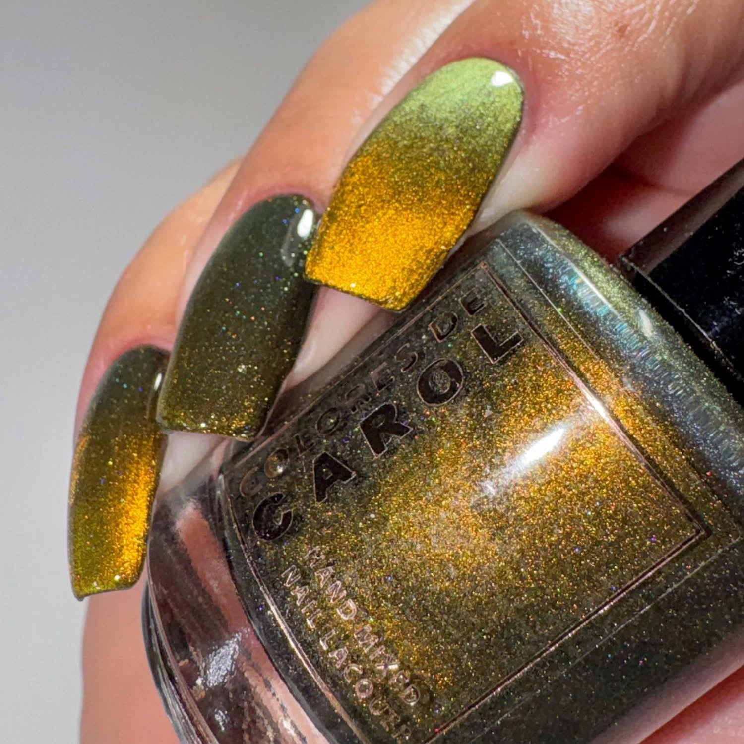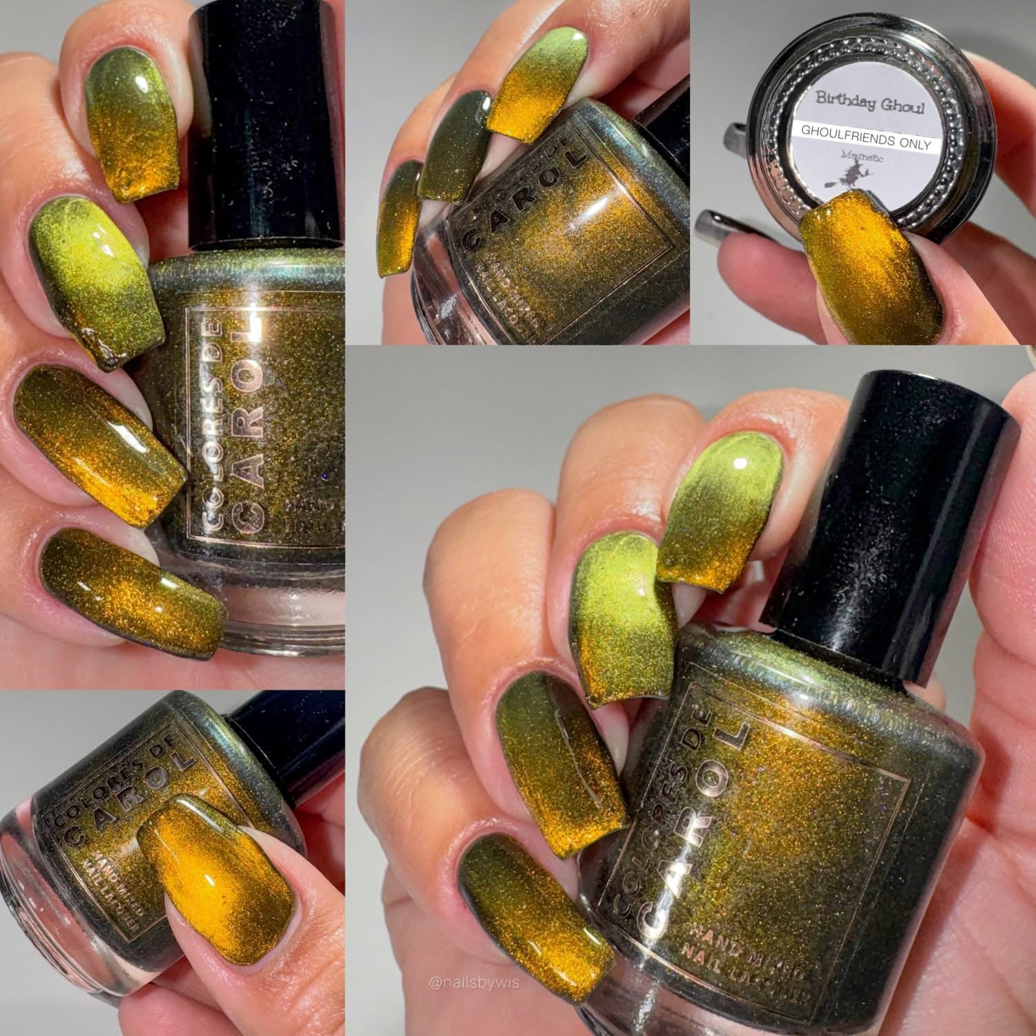 Ghoulfriends Only, a black crelly with holo dust and green/copper/gold multichrome magnetic effect.