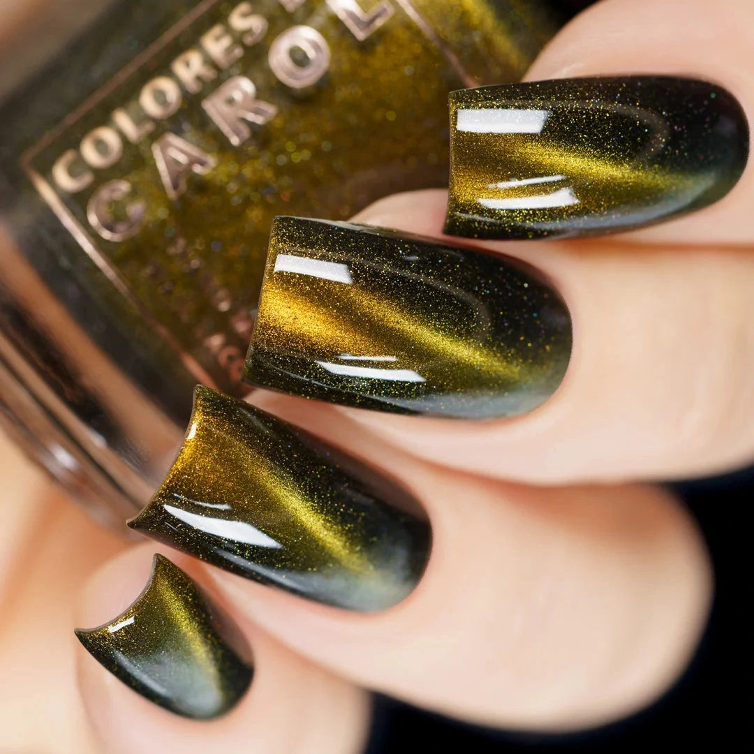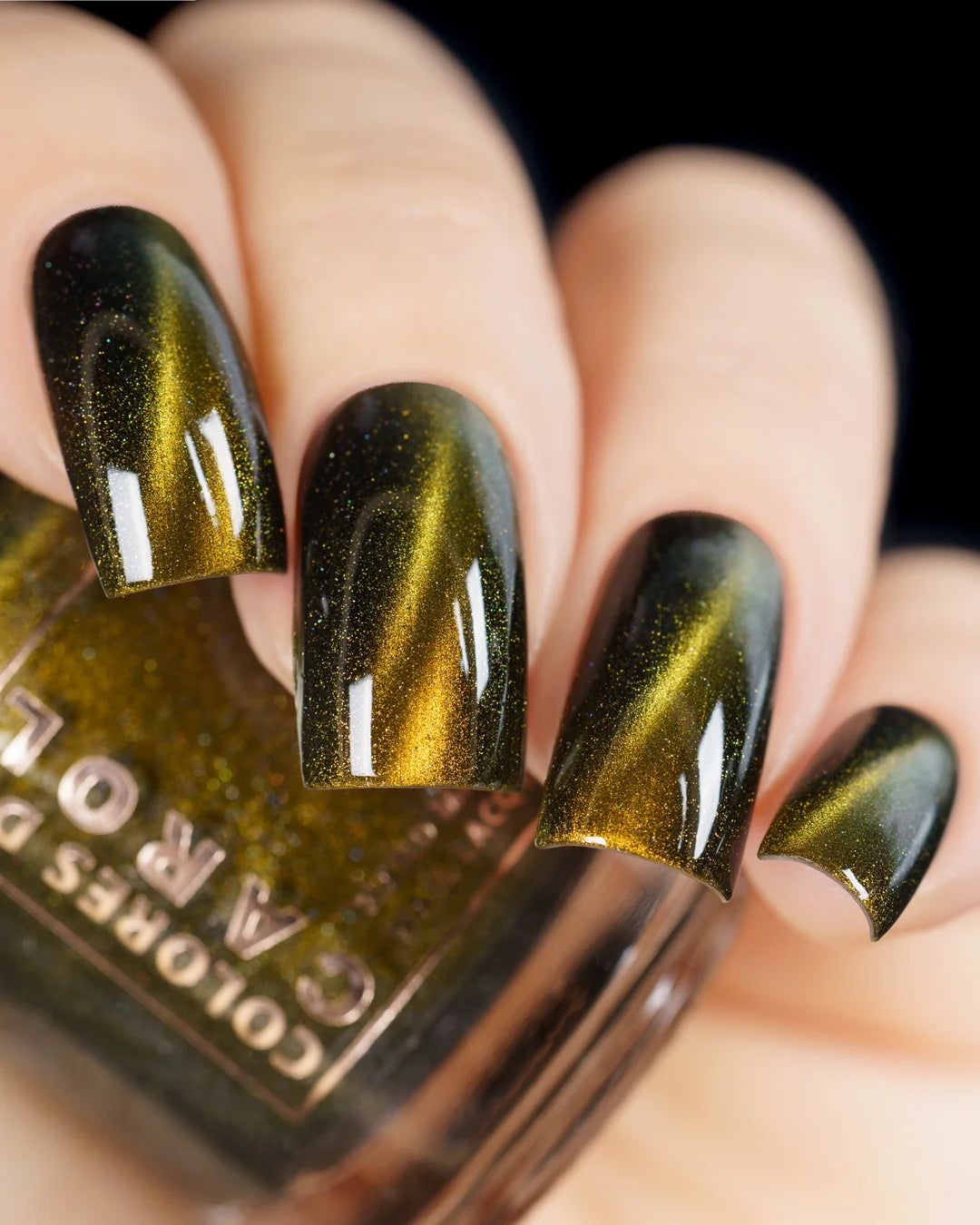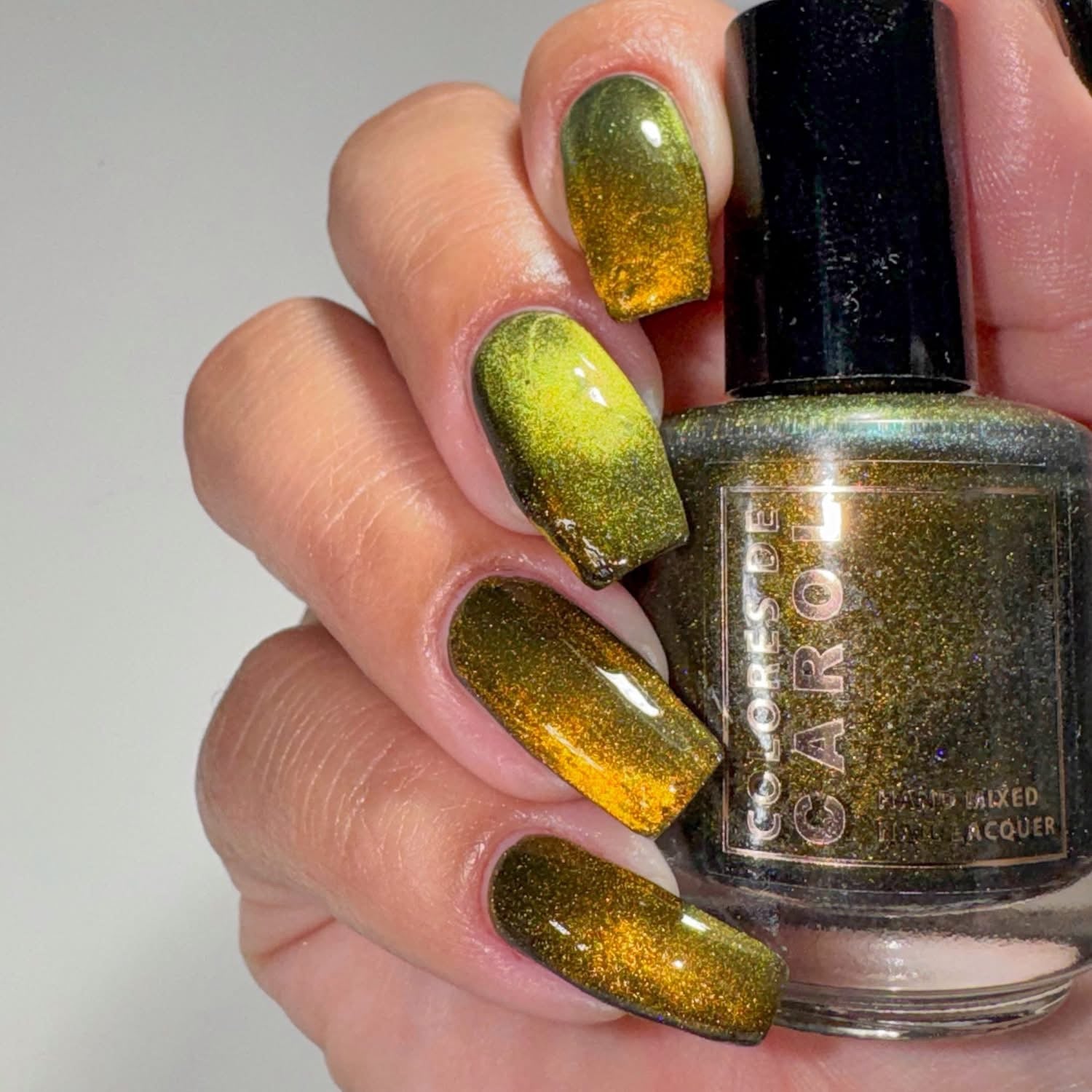 Ghoulfriends Only, a black crelly with holo dust and green/copper/gold multichrome magnetic effect.