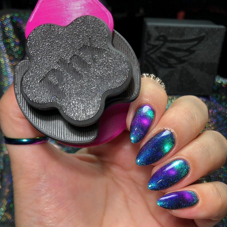 This thermal polish starts off with a black base loaded with a mix of iridescent flakes and blue/black UCC flakes and shifts to clear/white with heat.