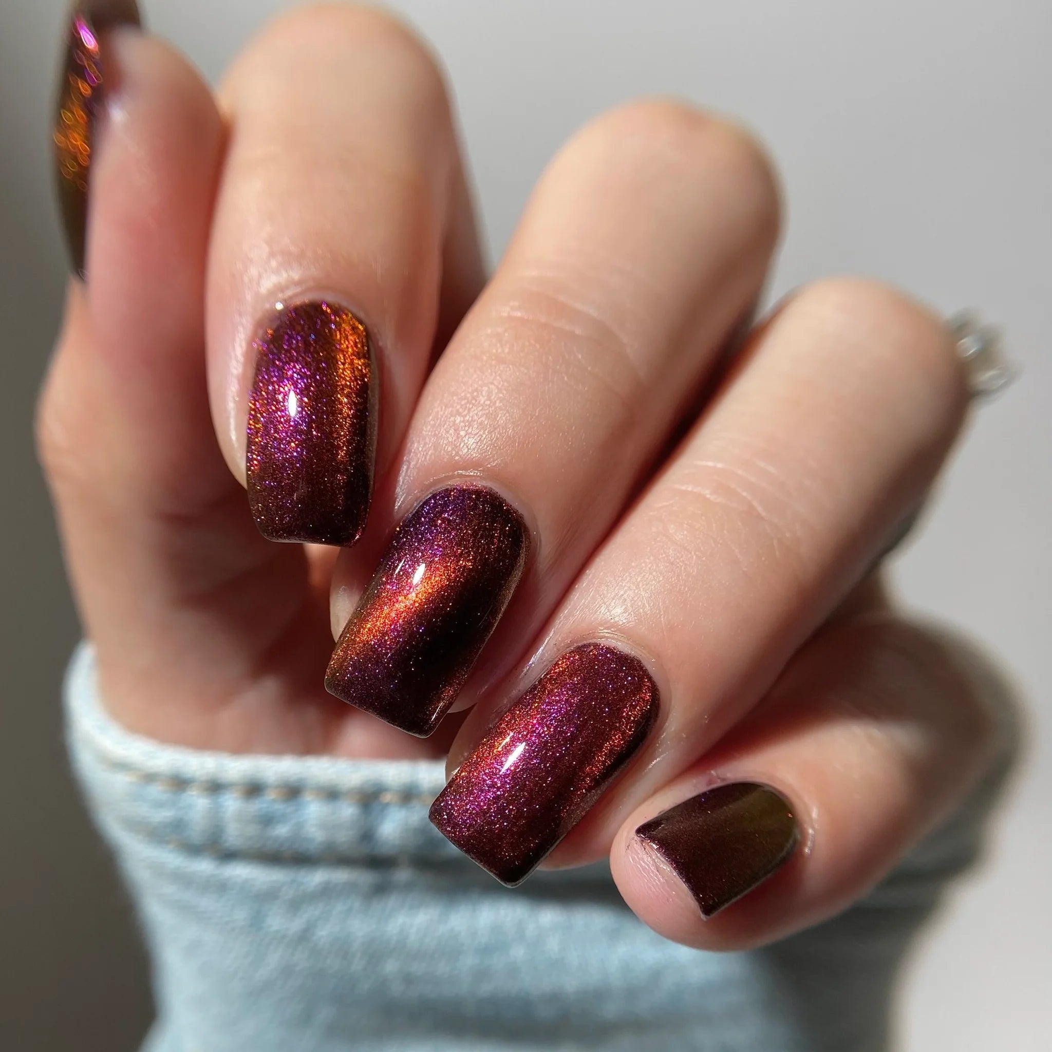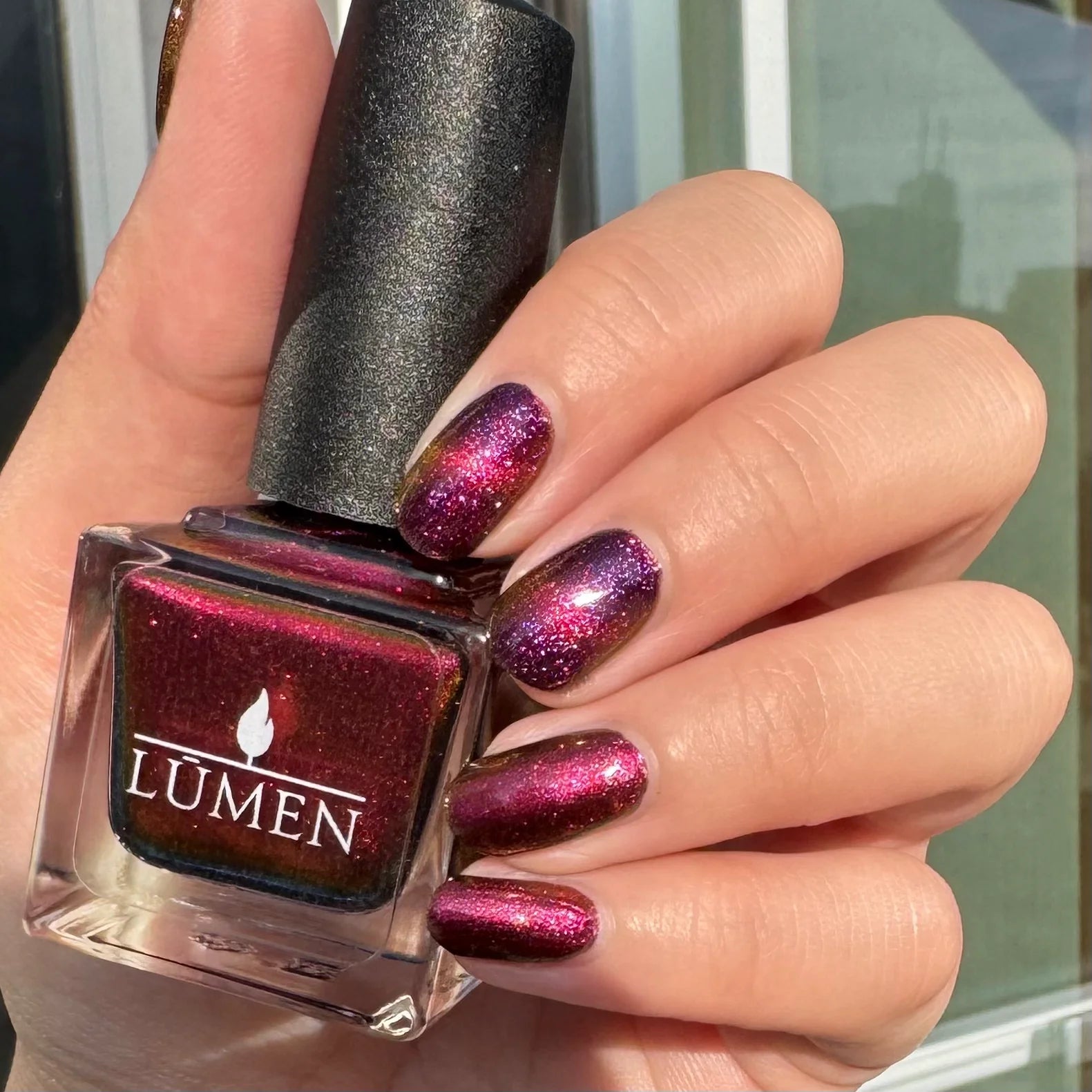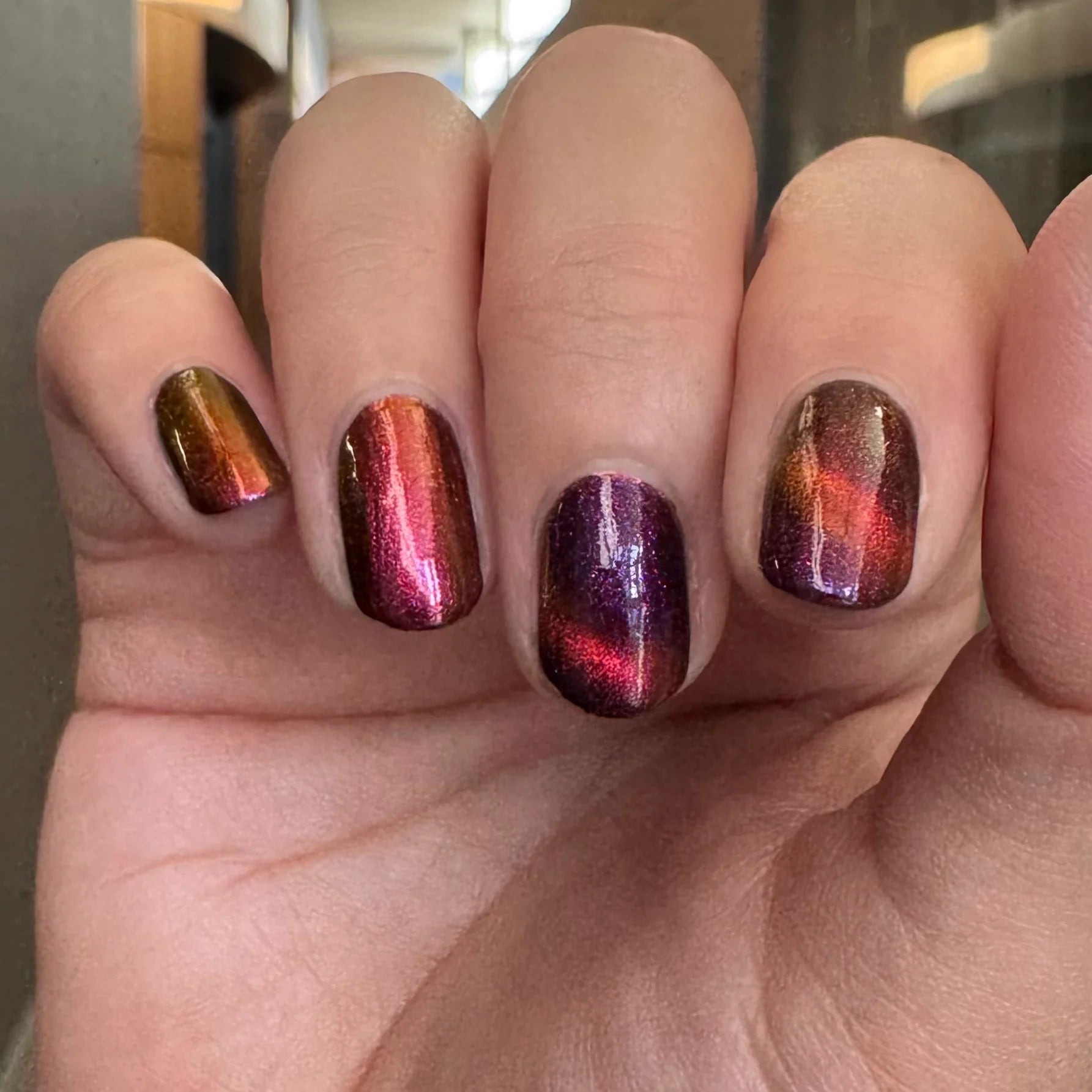 The first Specimen in the curiosities series Glass caged heart is a molten red Magnetic polish that pulls purple with a red to gold shift. this is the shade of contained desire