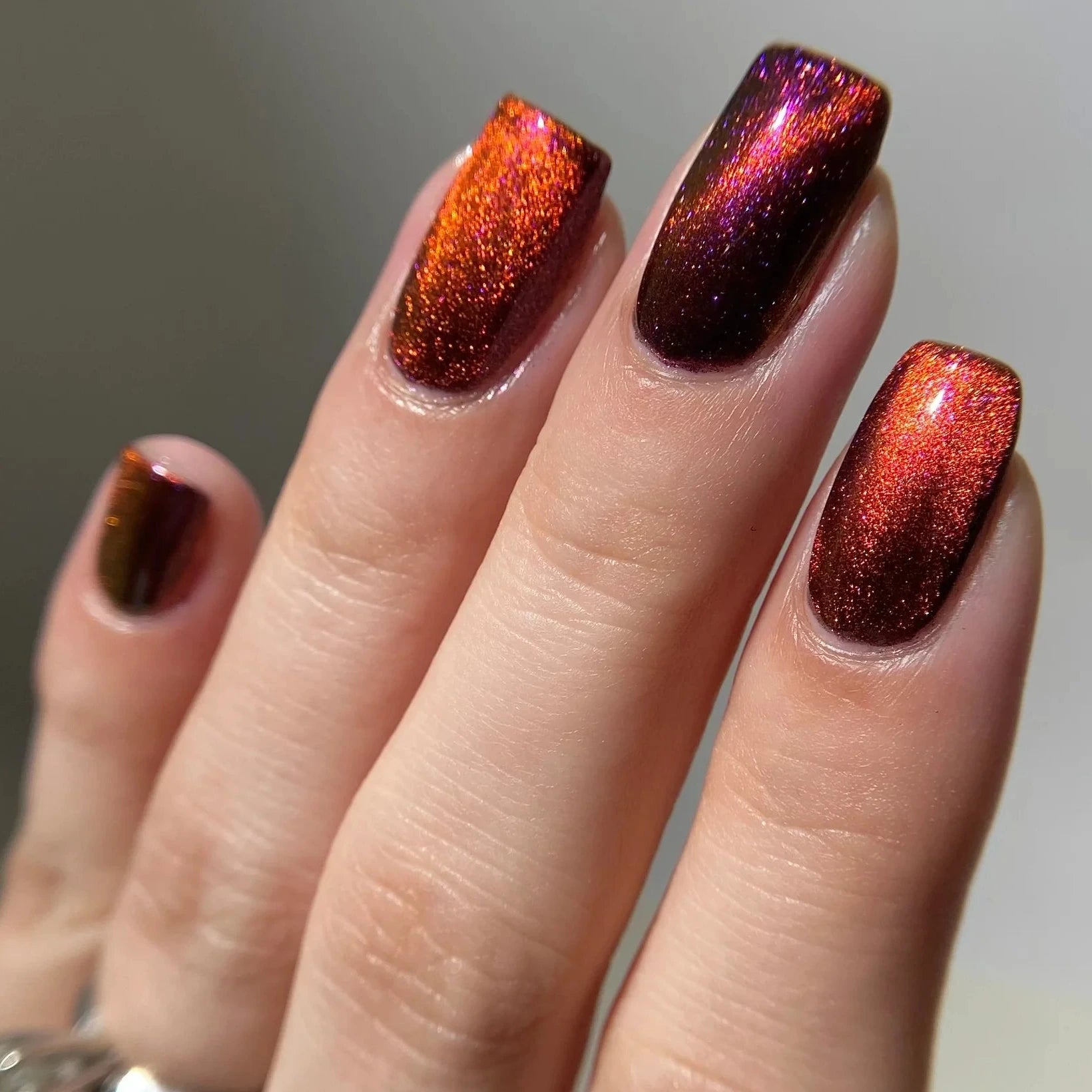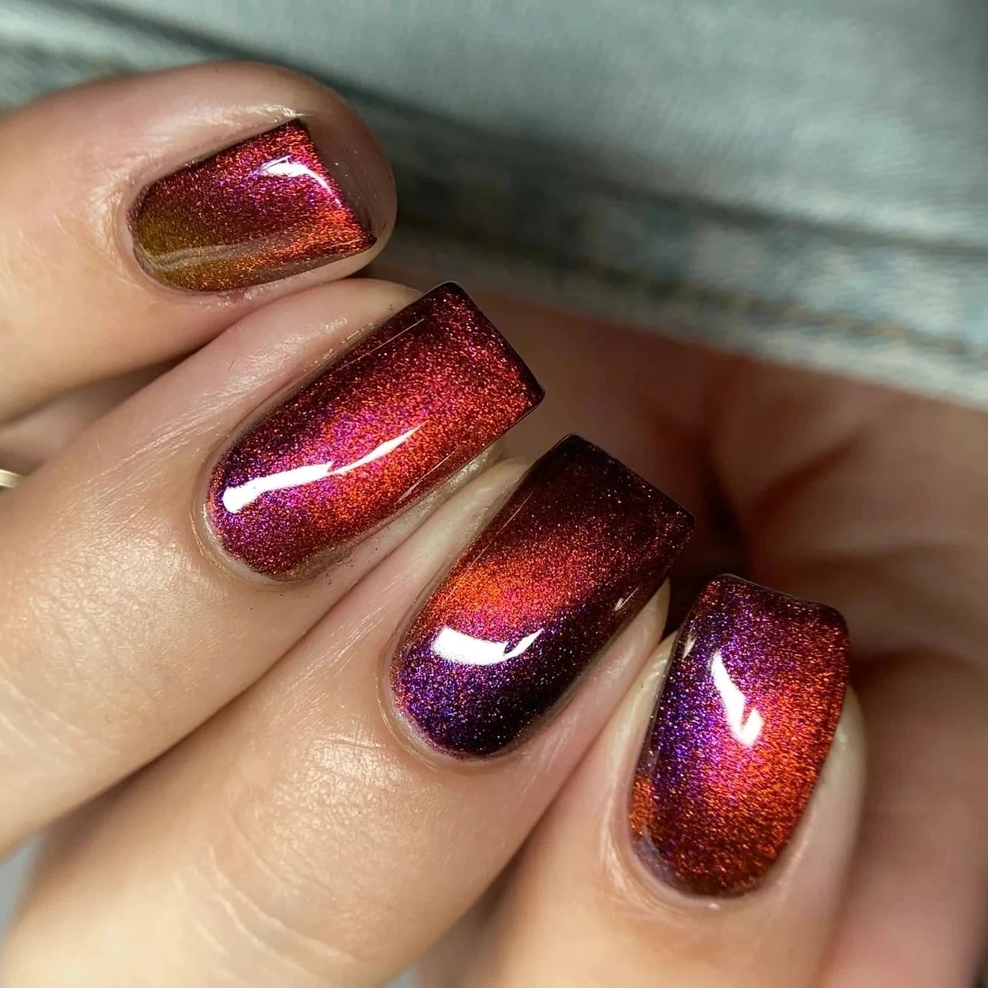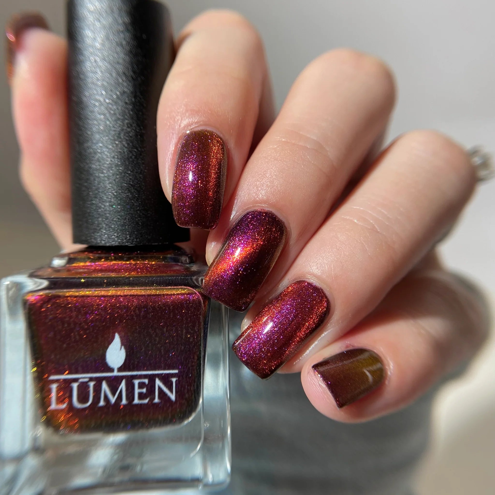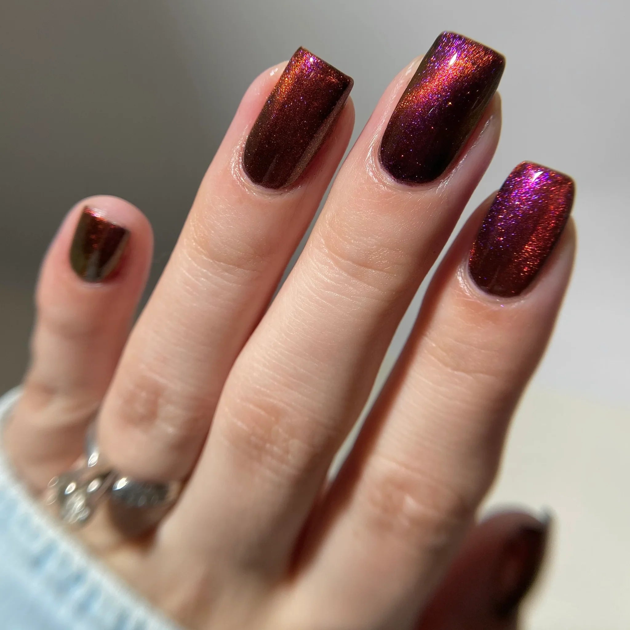 The first Specimen in the curiosities series Glass caged heart is a molten red Magnetic polish that pulls purple with a red to gold shift. this is the shade of contained desire