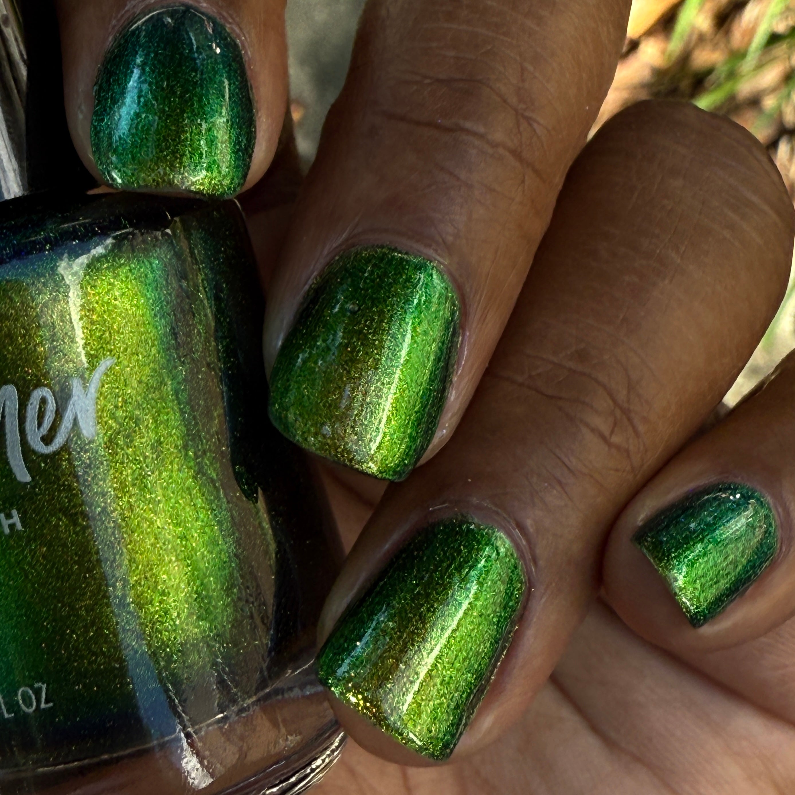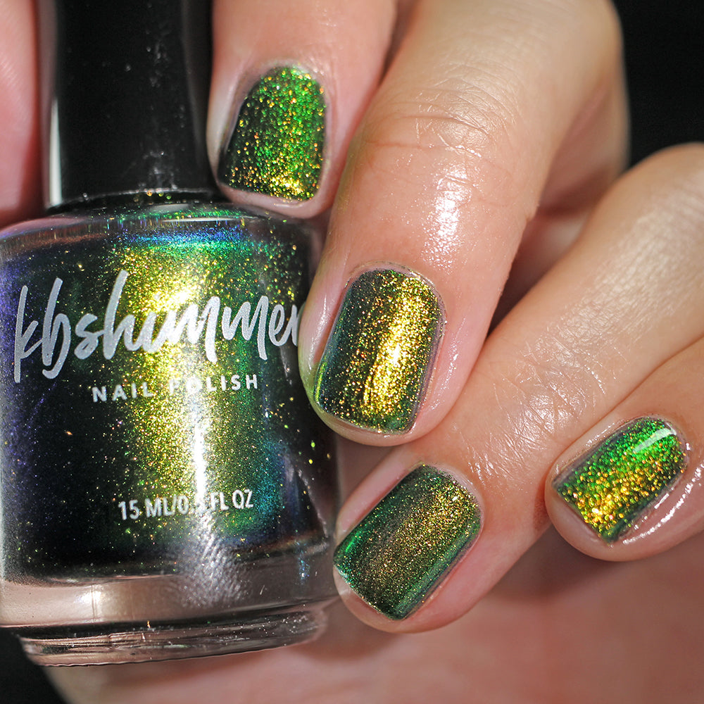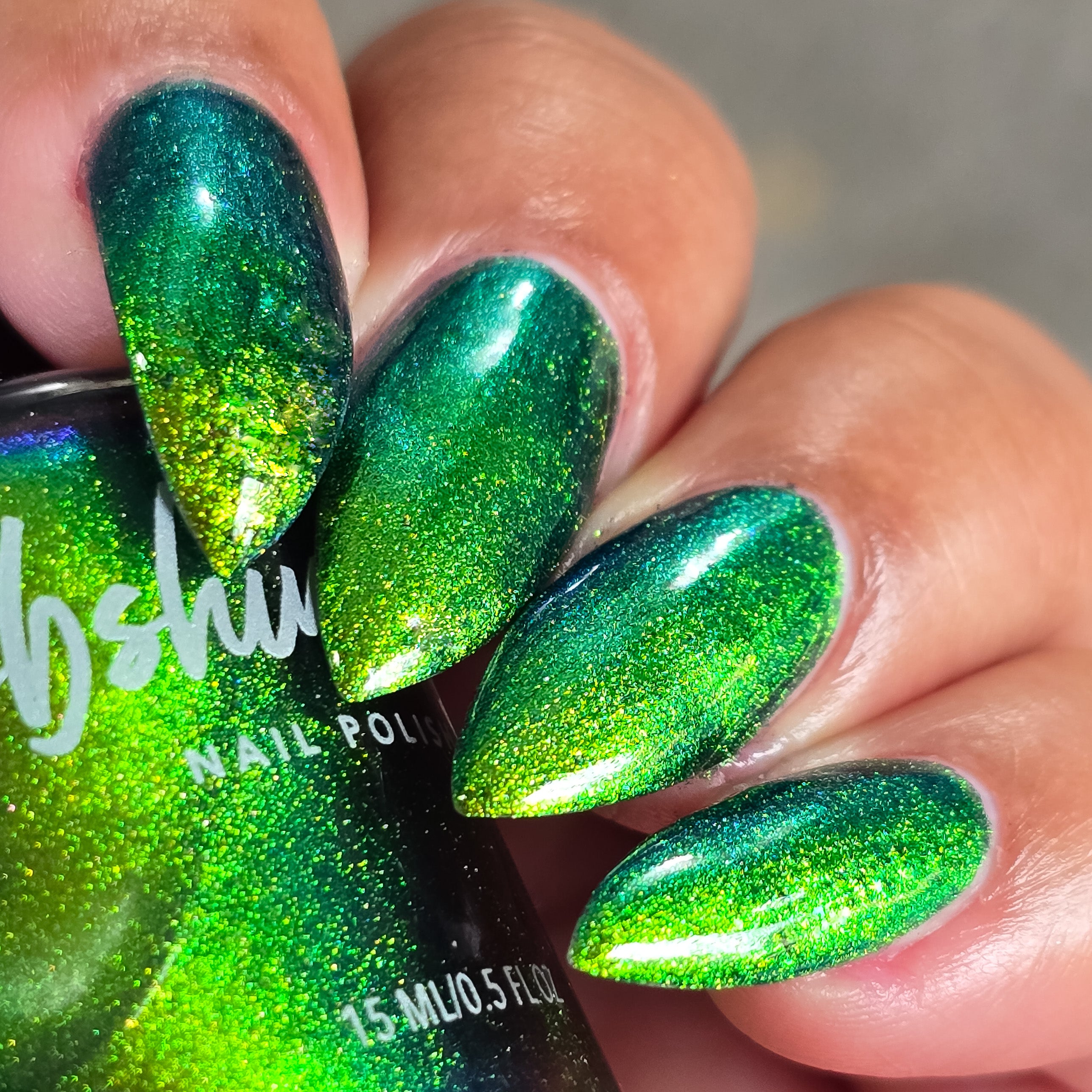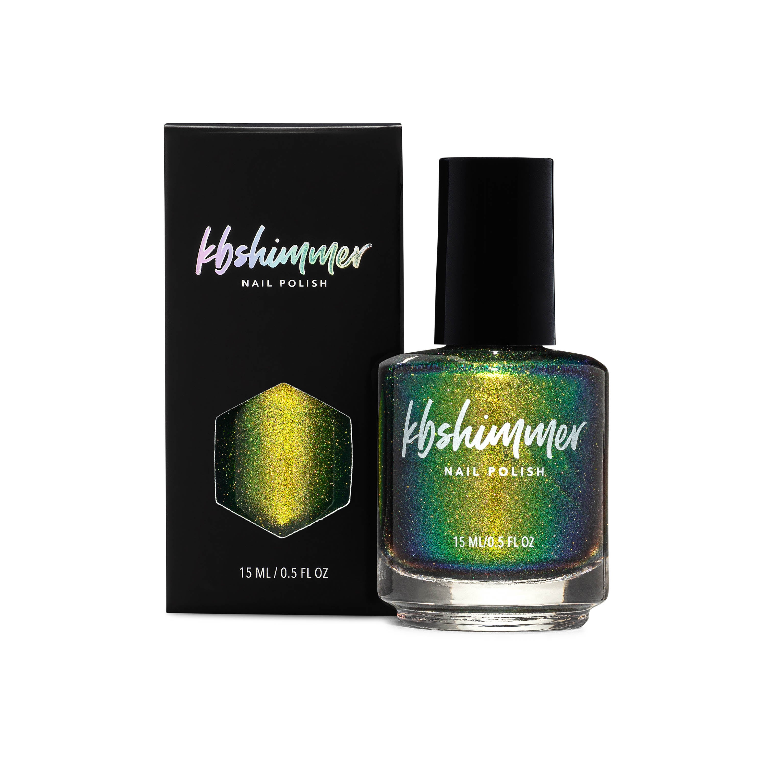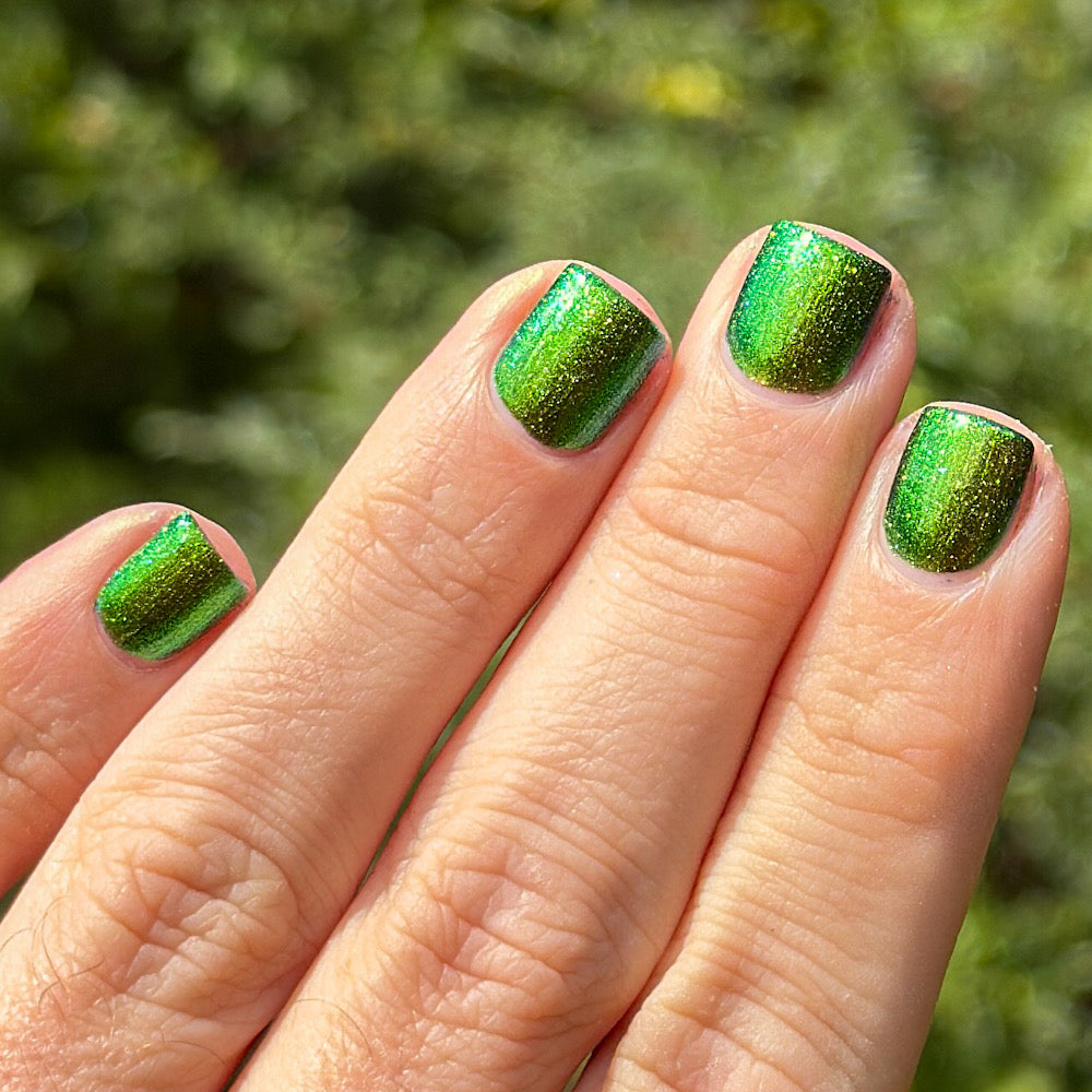 In A Pickle is a vibrant green, multifaceted chrome nail polish that easily catches the eye as it shifts between colors. This multichrome shade features a warm golden hue that accents the green, catching hints of orange, deep blue, and near-navy hues.