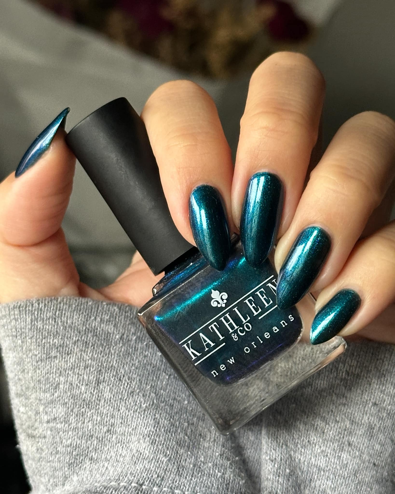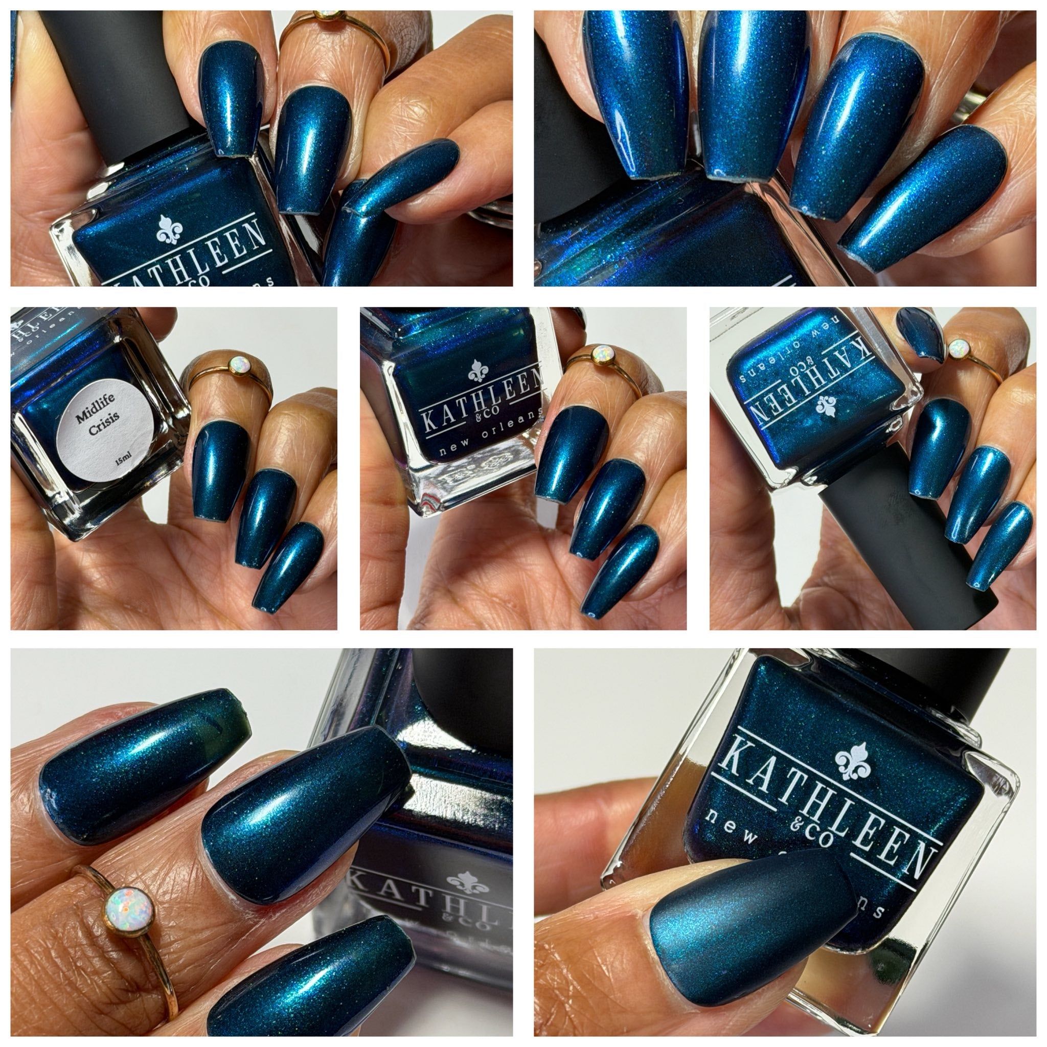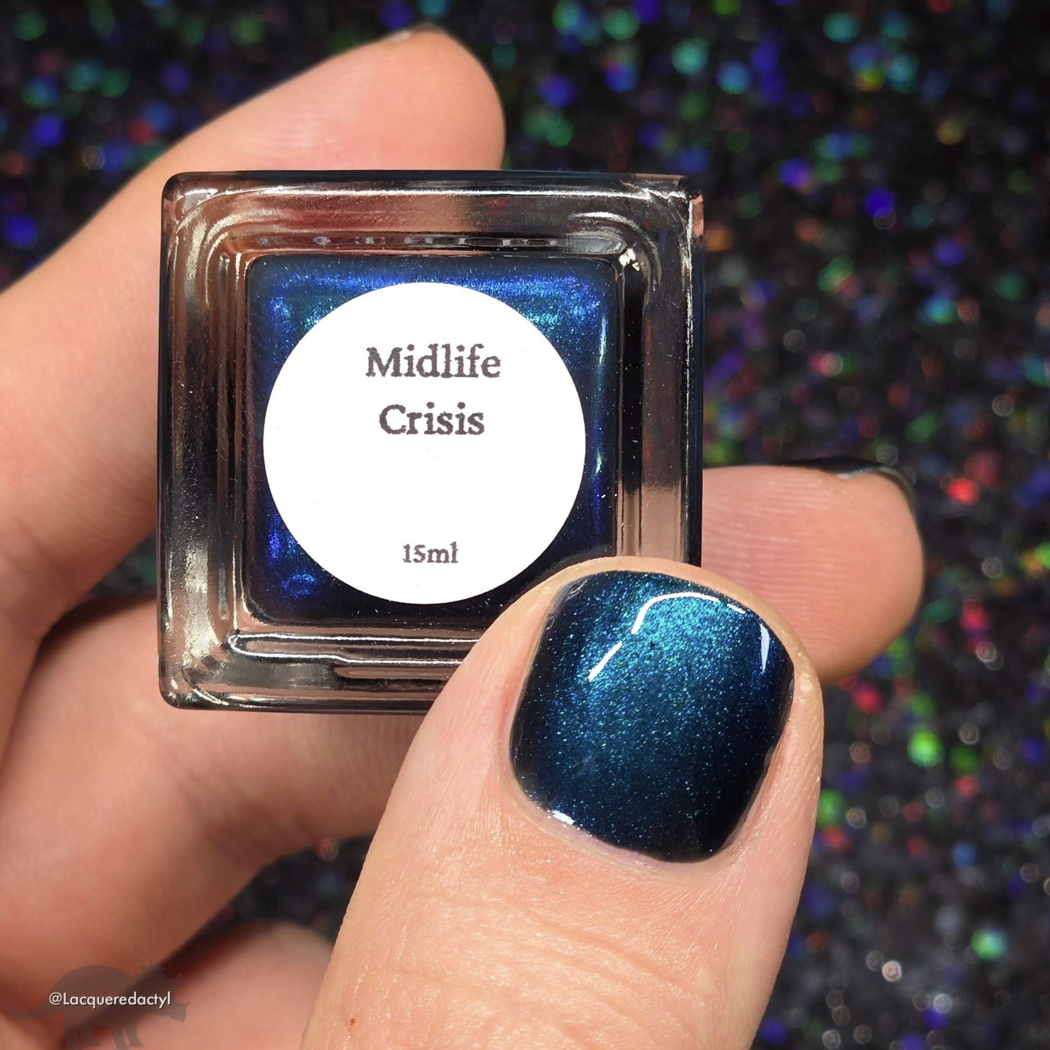 Midlife Crisis - a blackened teal with aqua/green to blue shifting shimmer.
