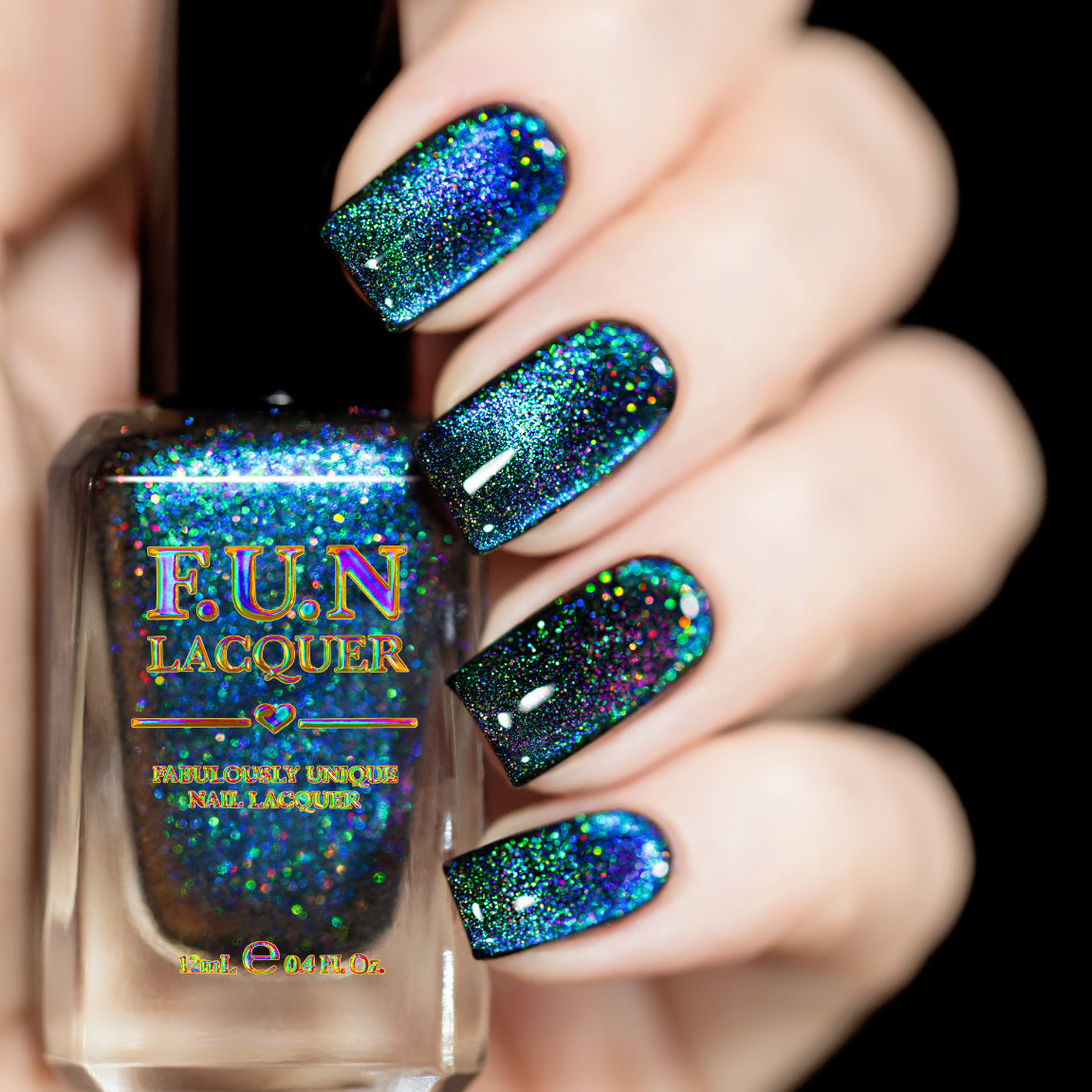 Mistletoe Sky captures the wonder of a winter night illuminated by sparkling holiday lights. This dazzling multichrome magnetic polish shifts between deep sapphire, emerald green, and hints of teal, creating a breathtaking aurora-like glow across the nails. The shifting pigments are enhanced with ultra-reflective holographic particles, giving every movement a burst of prismatic brilliance—like snowflakes glistening under Christmas lights.