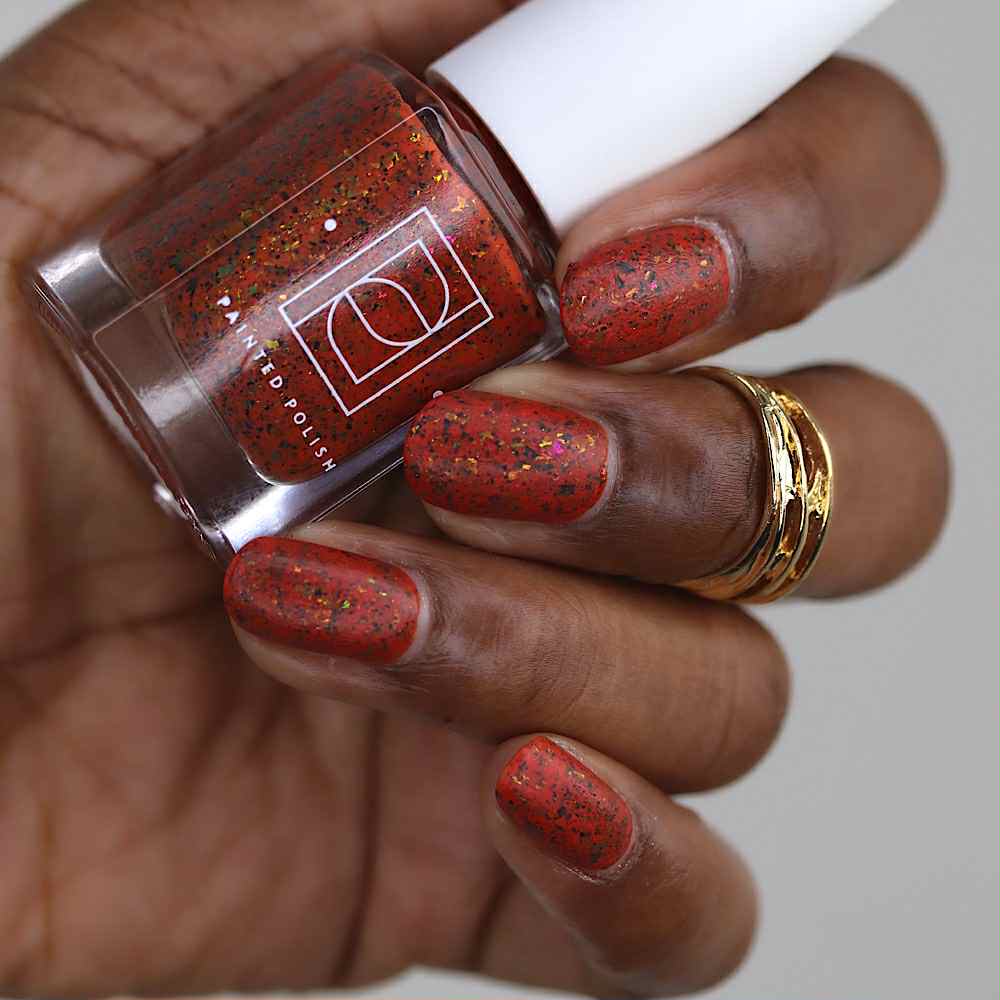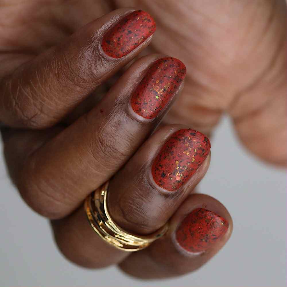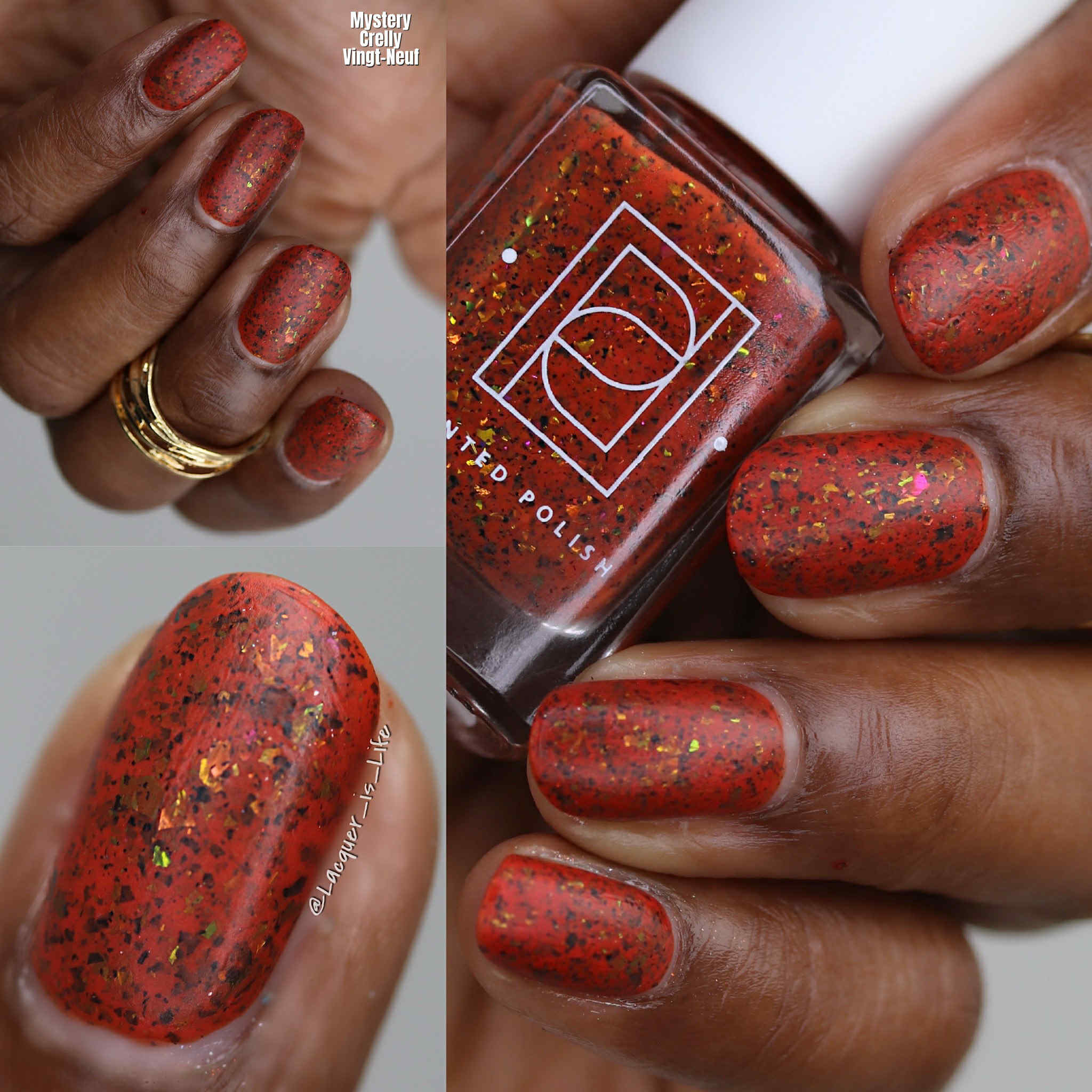 ‘Mystery Crelly Vingt-Neuf’ features green-gold color-shifting metallic flakies and black flakies in a Sinopia orange crelly base!