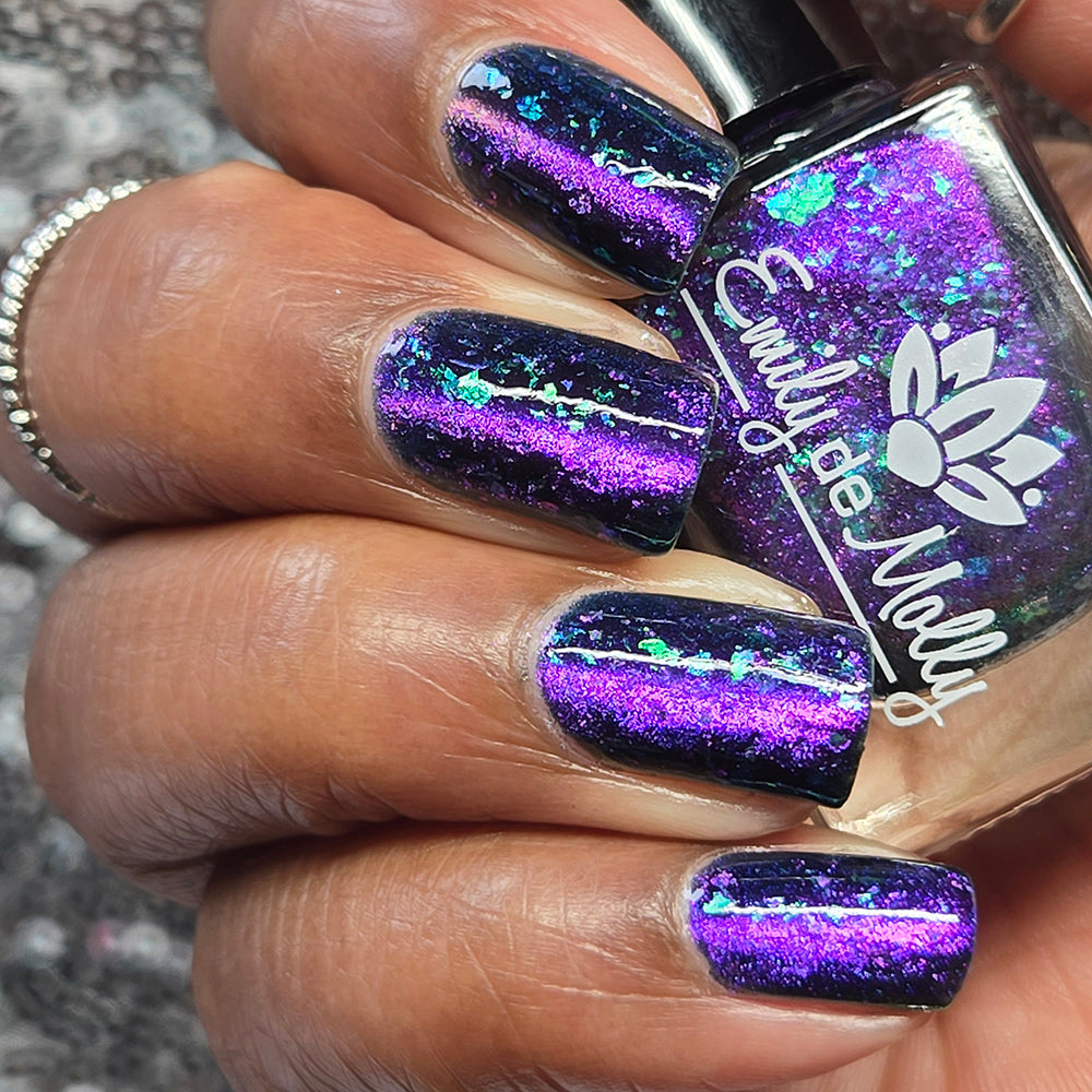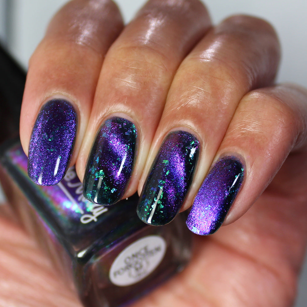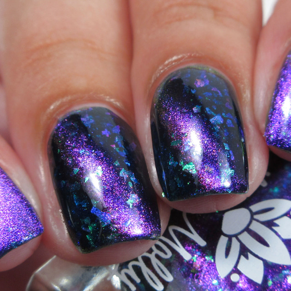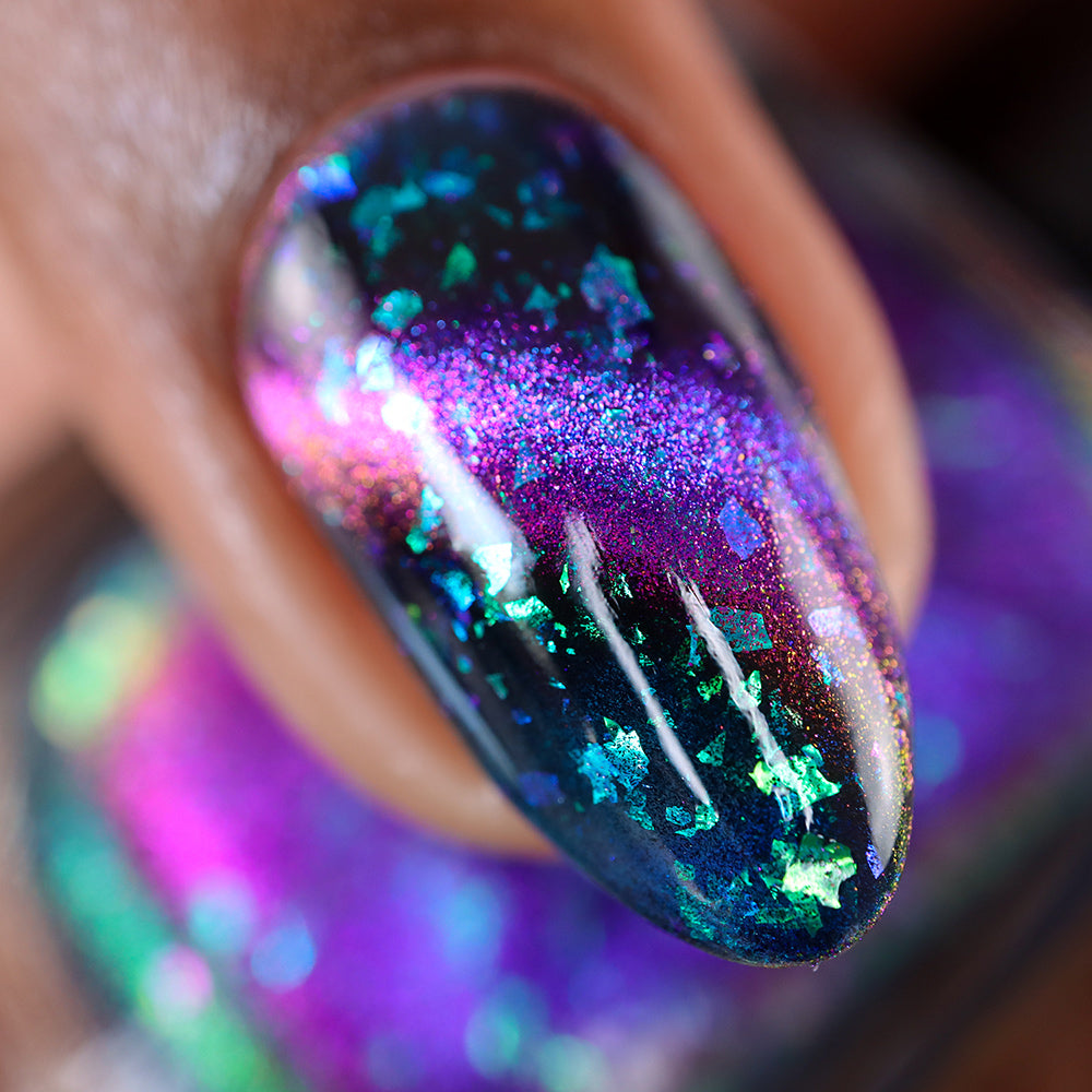 A dark navy nail polish with green / blue shifting iridescent flakes and a purple / pink / gold shifting magnetic effect.