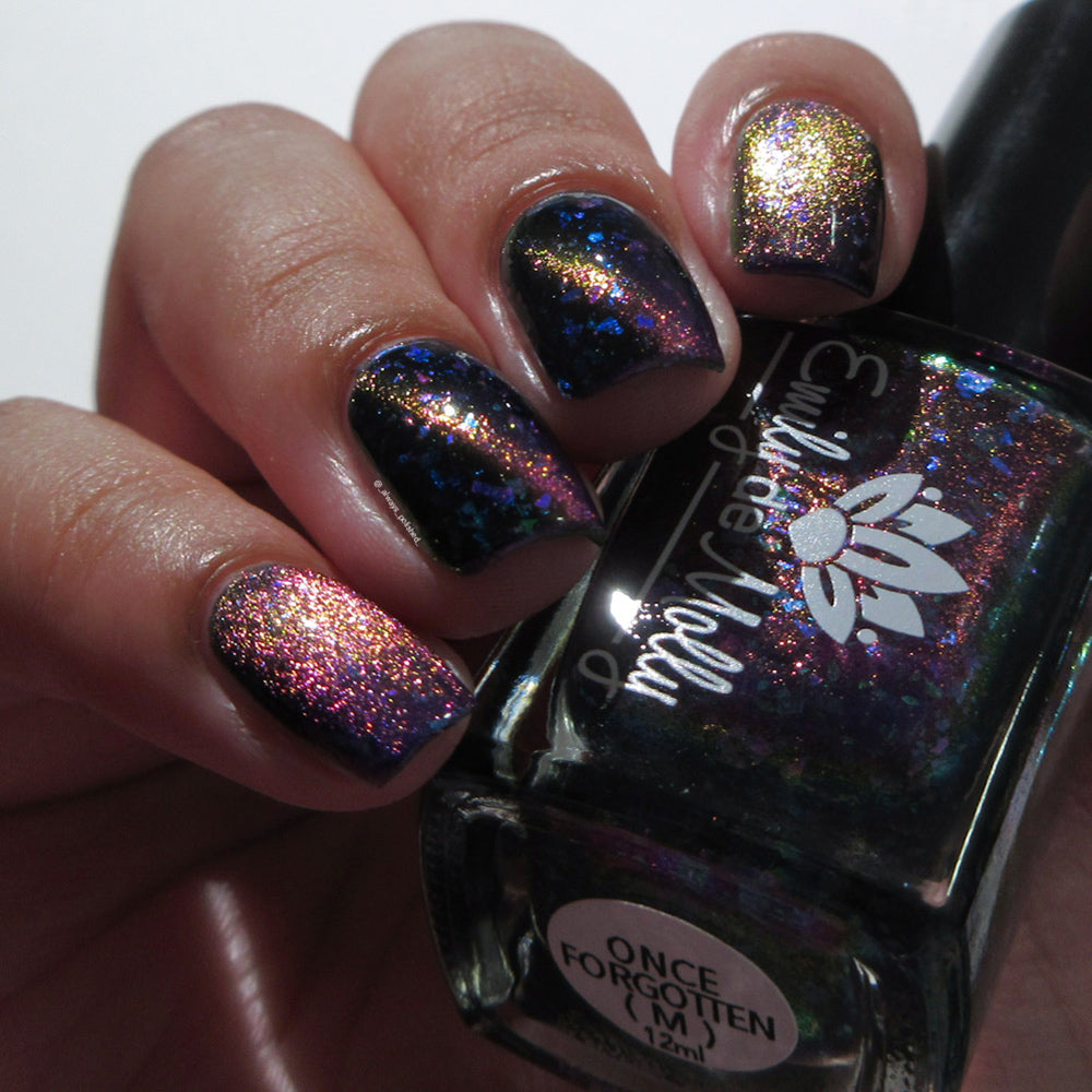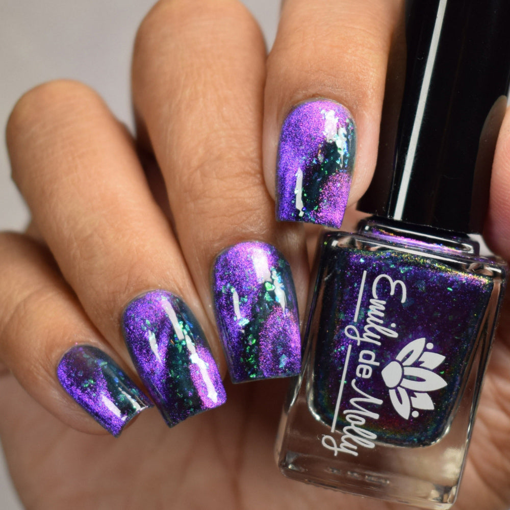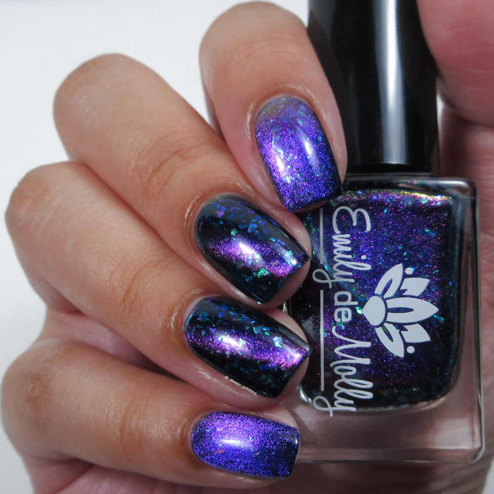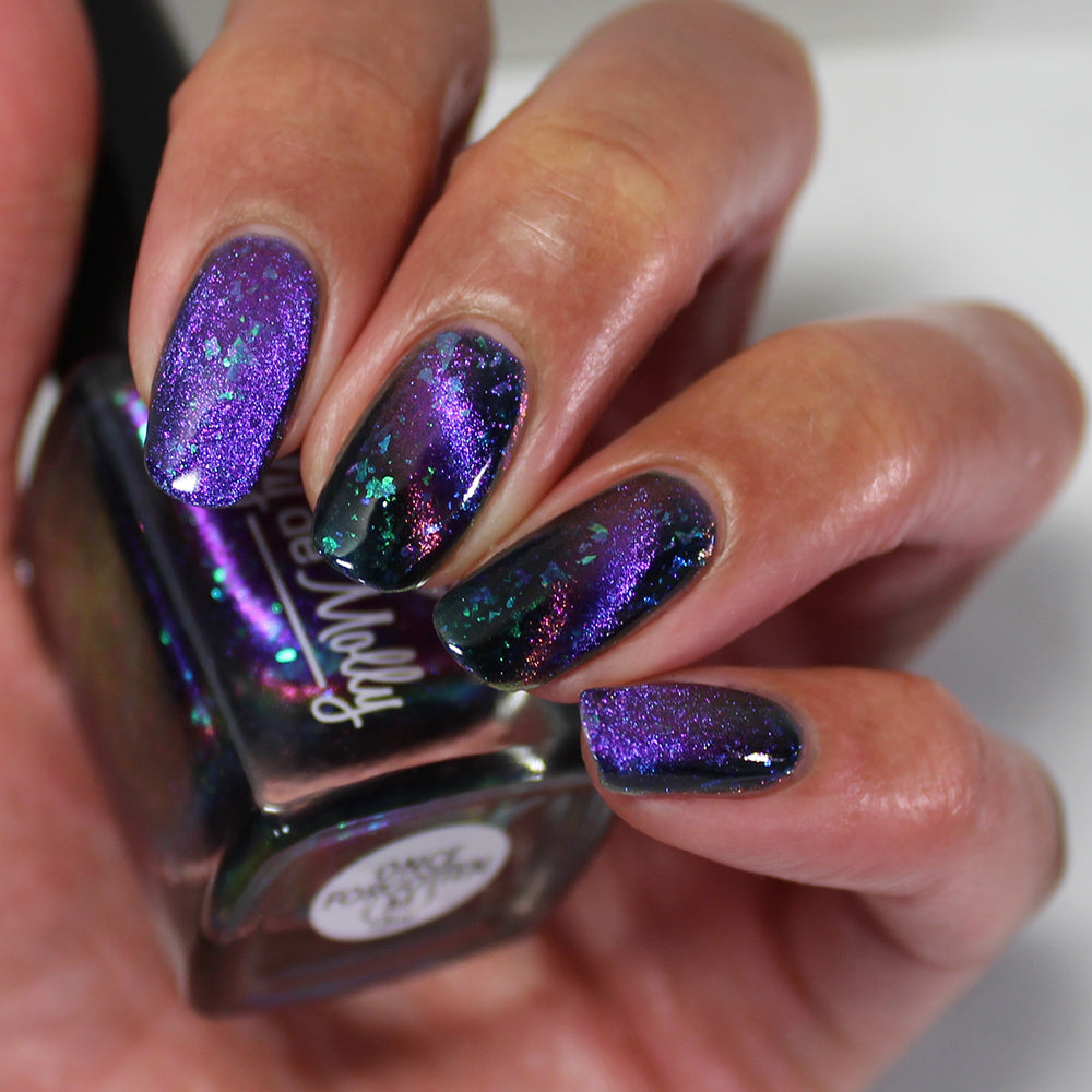 A dark navy nail polish with green / blue shifting iridescent flakes and a purple / pink / gold shifting magnetic effect.