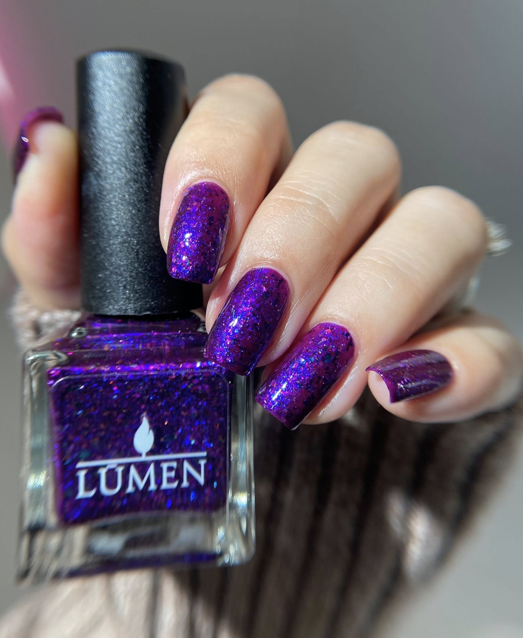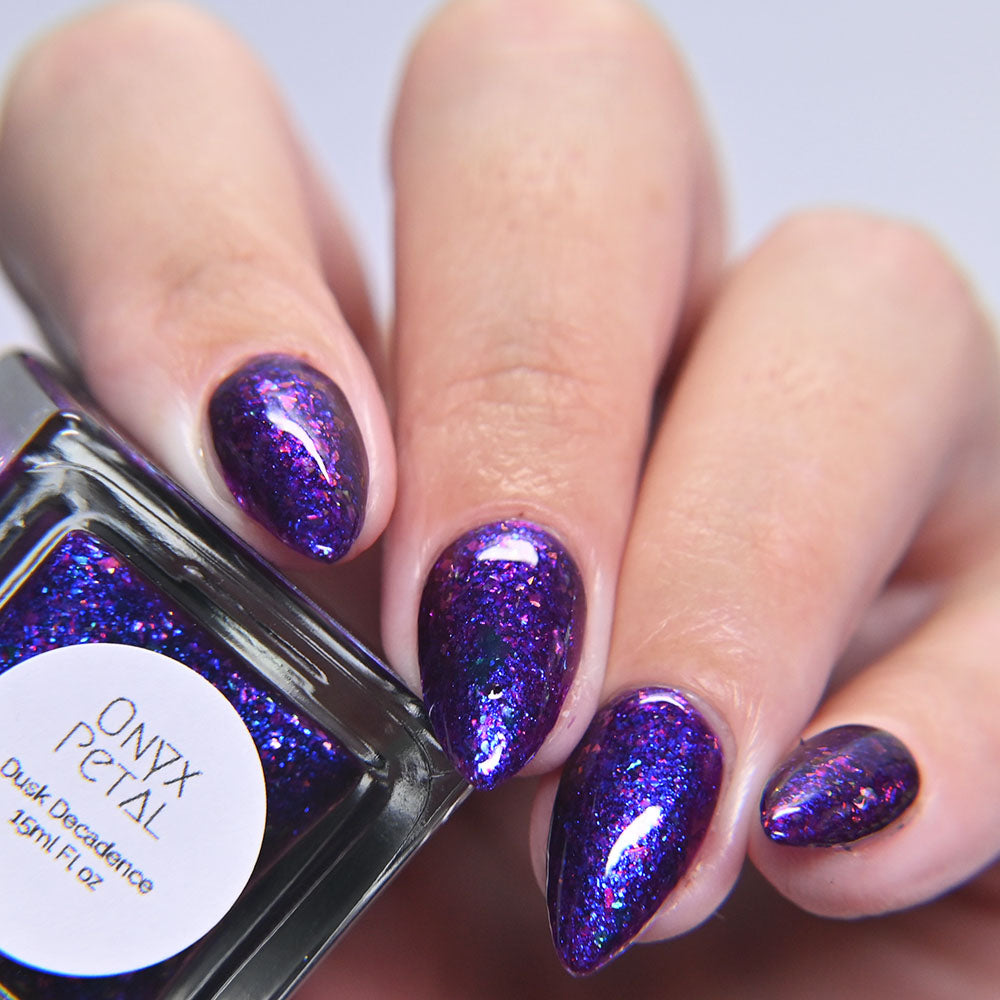 A pinky purple base with a strong teal to violet shifting shimmer and holo flakies.