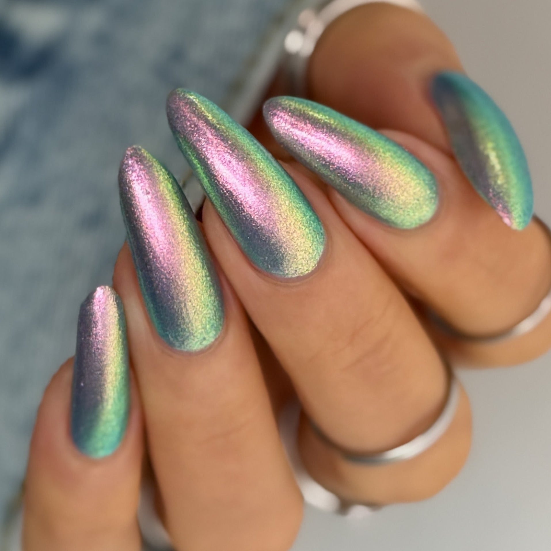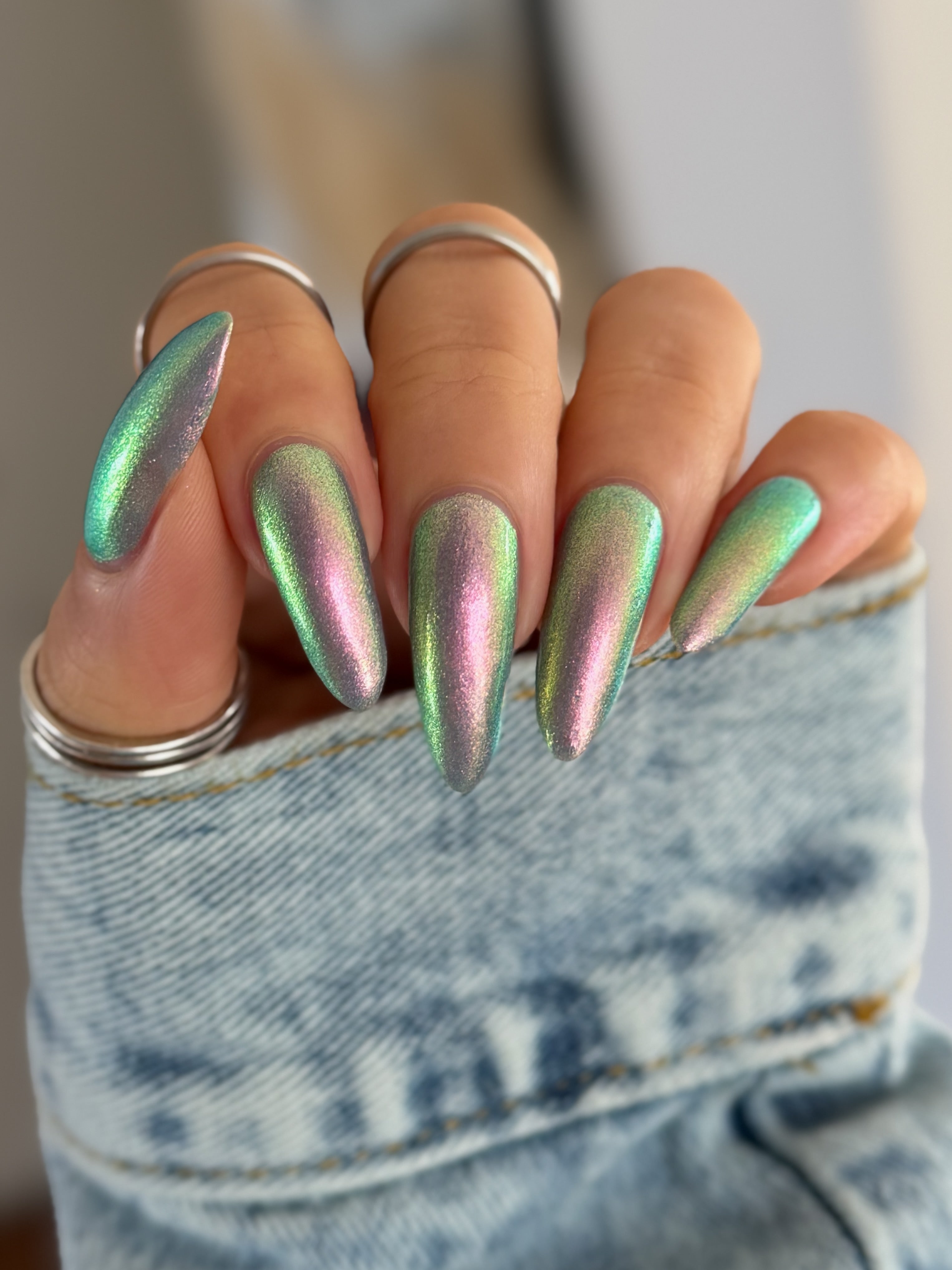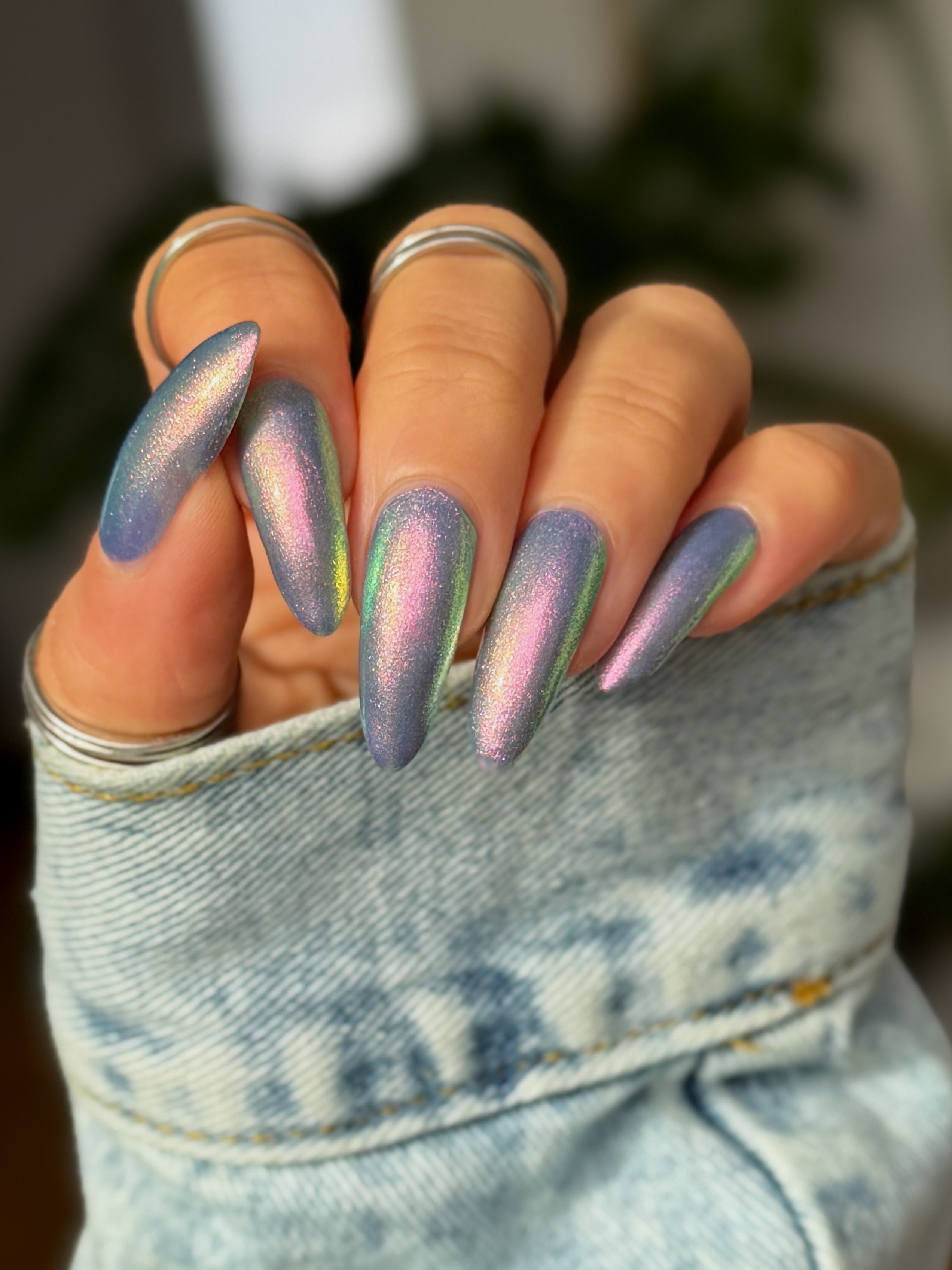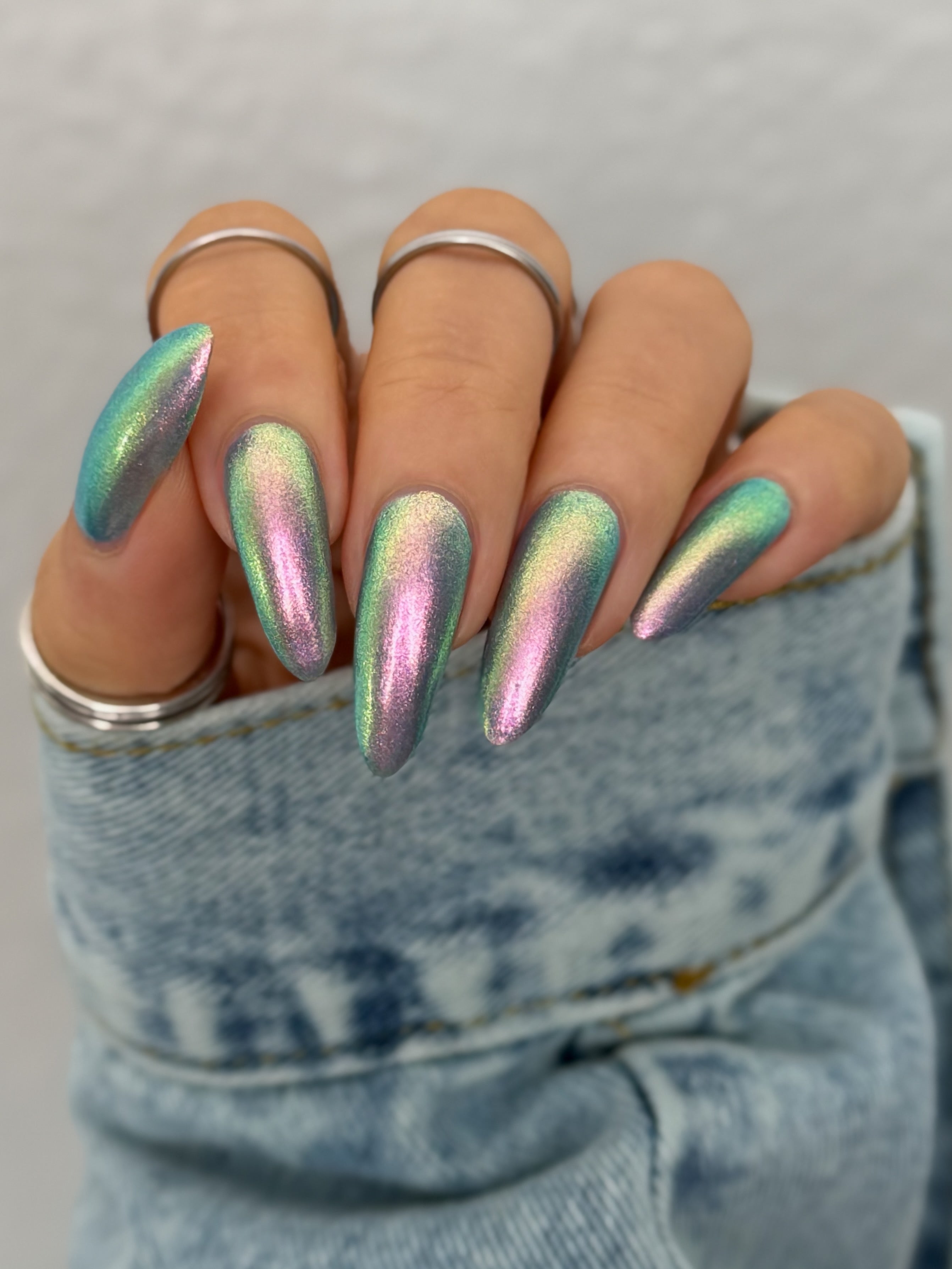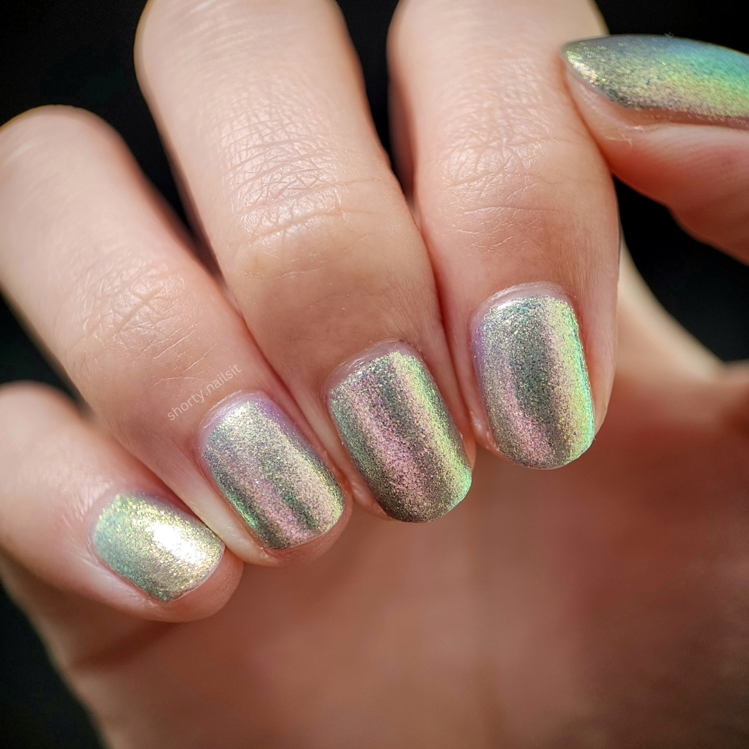 Out Of This World is one of our super-shifty large particle shimmers - A soft pink base with a strong gold and green tint that shifts through multiple colours depending on the angle and lighting. Opaque in 2 to 3 coats or can be used as a topper over black for a mysterious gleam.