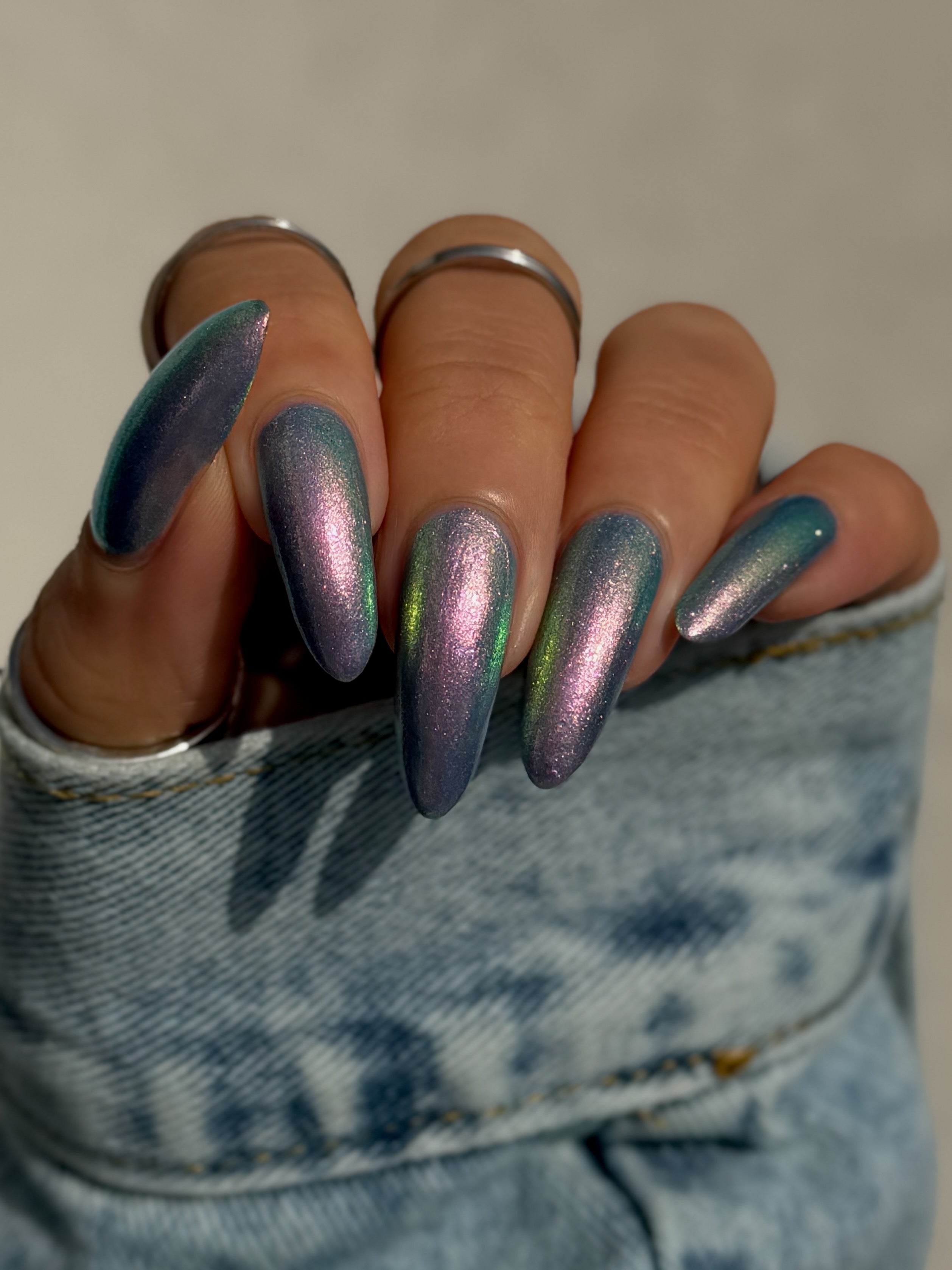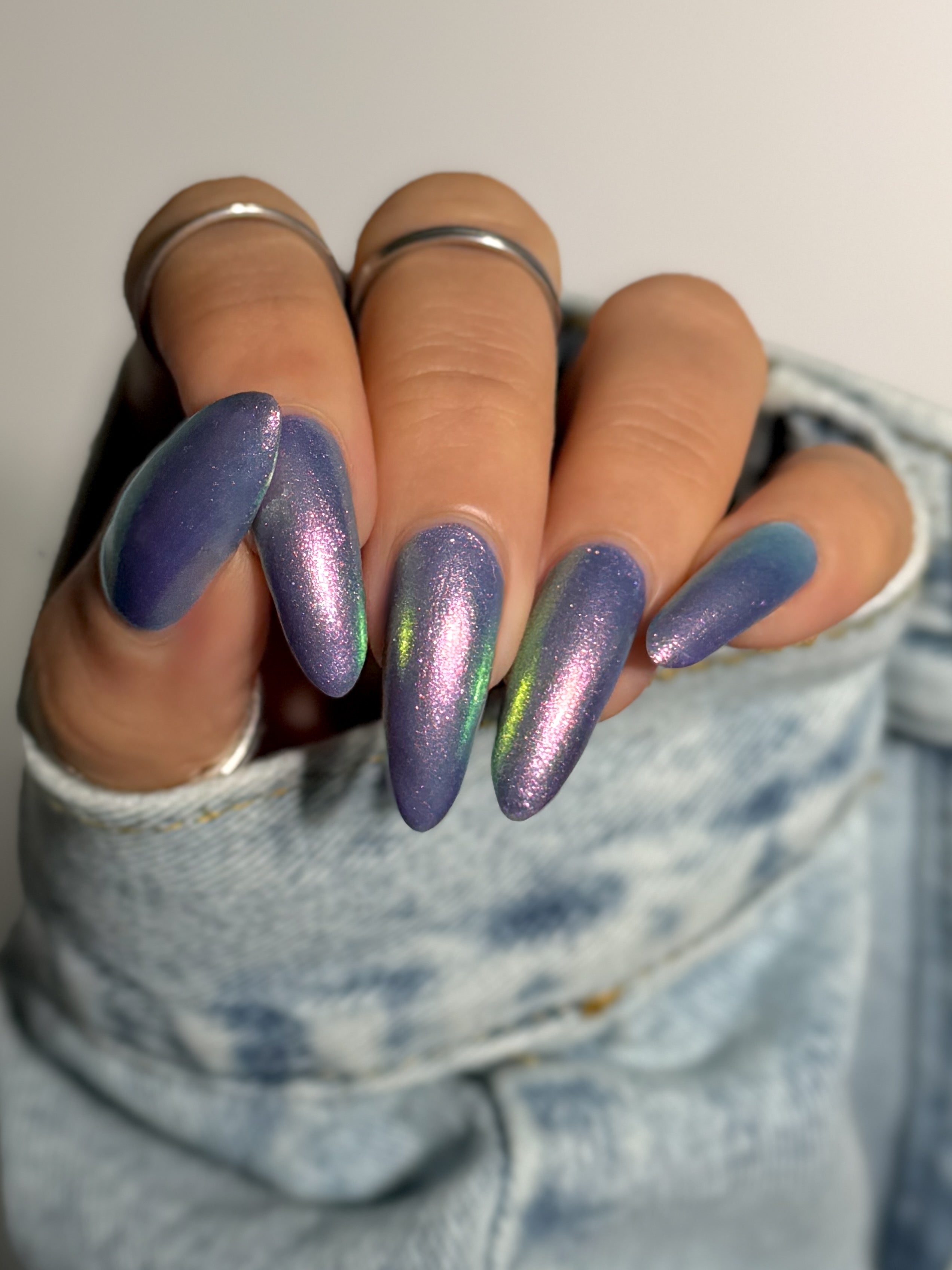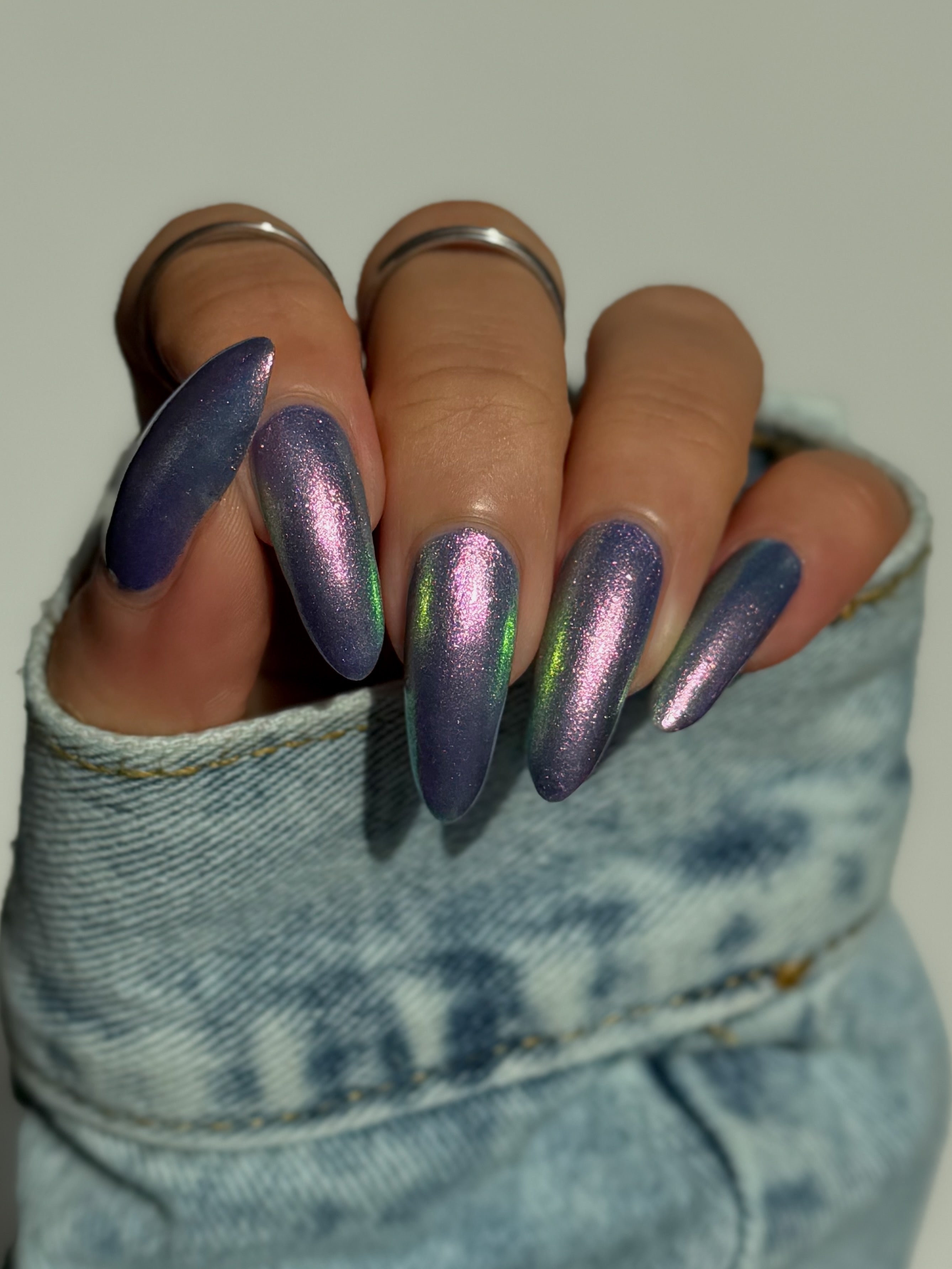 A pinky purple base with a strong teal to violet shifting shimmer and holo flakies.