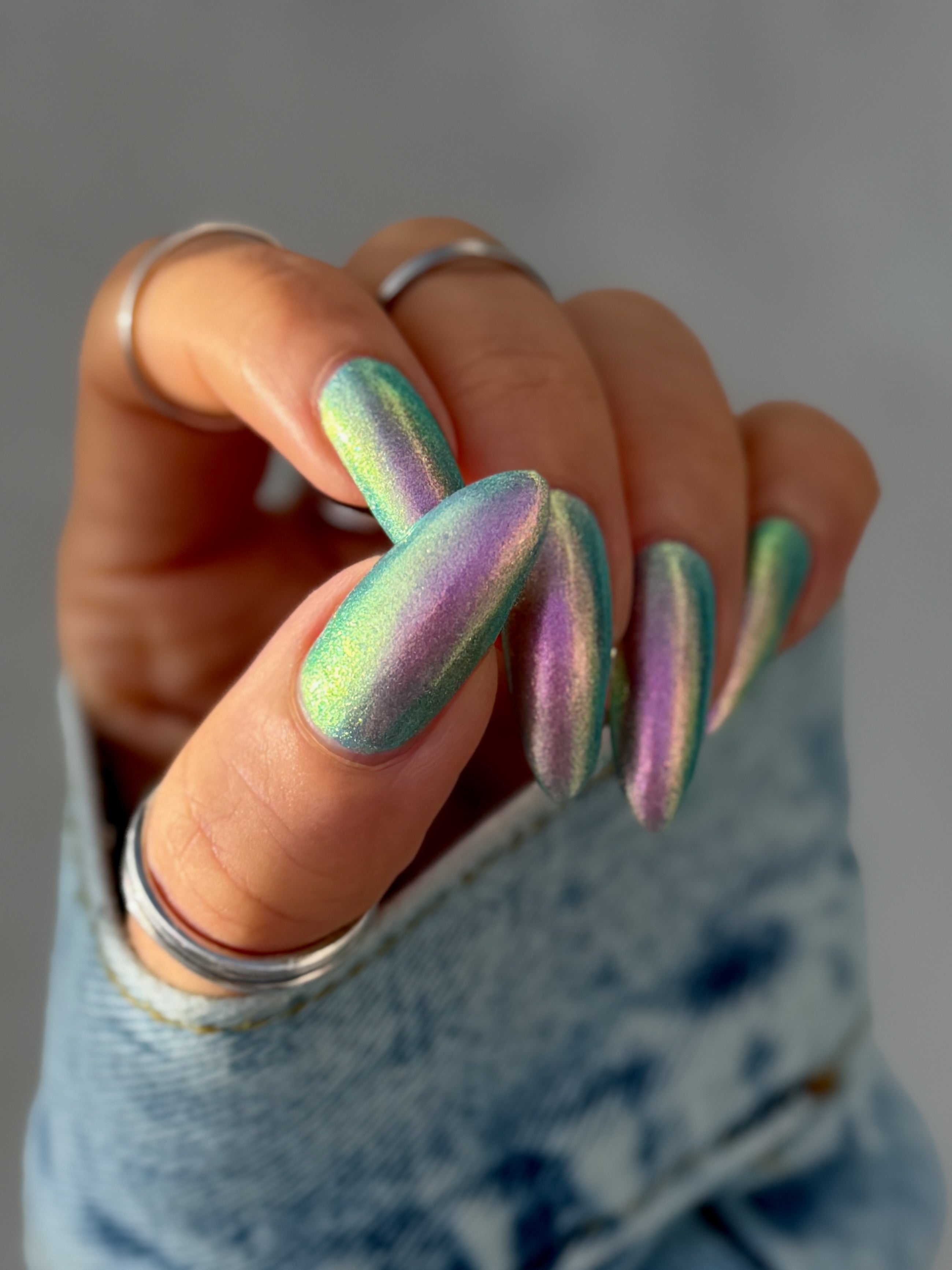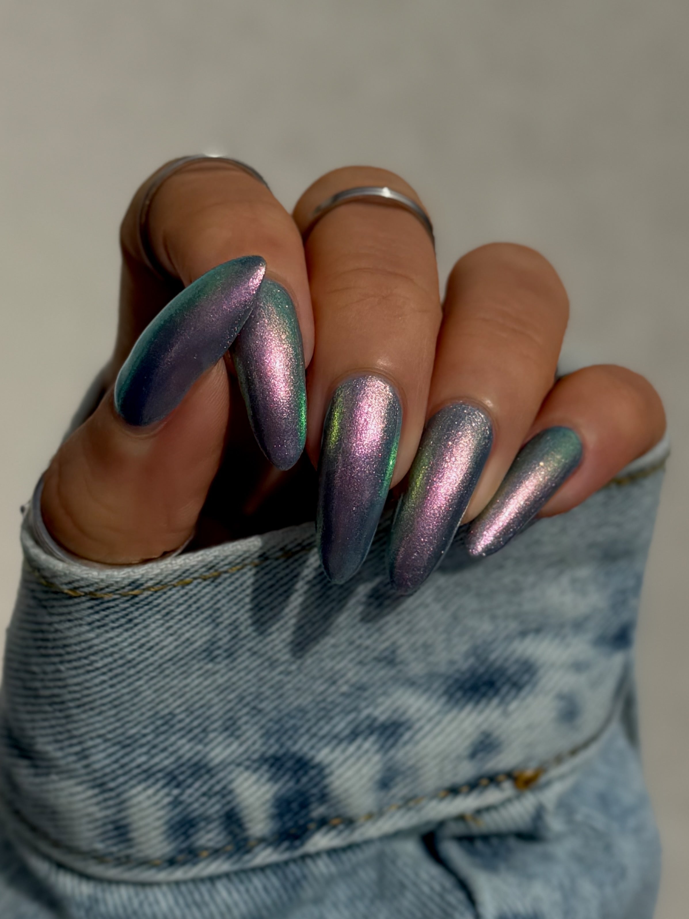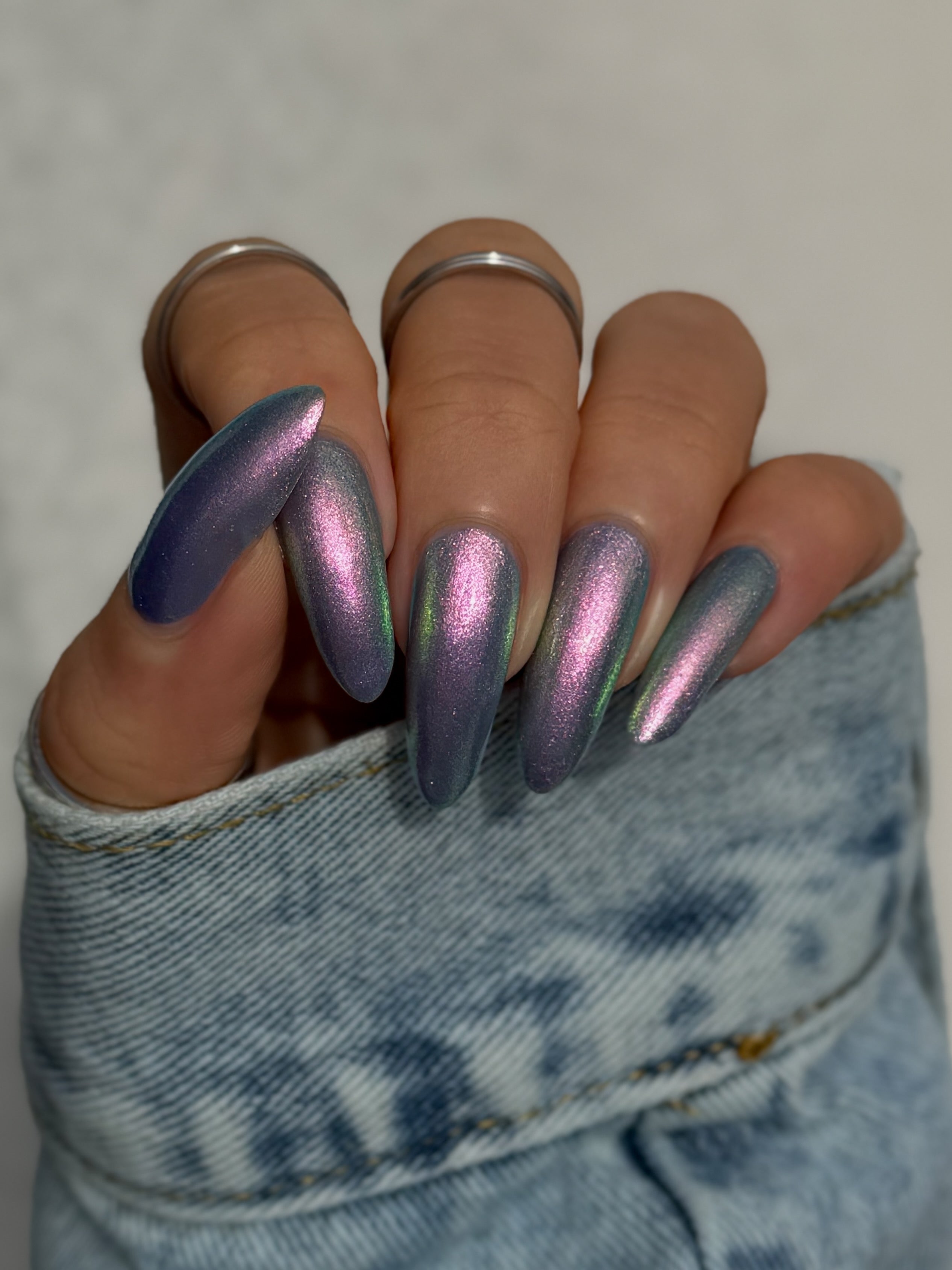 A pinky purple base with a strong teal to violet shifting shimmer and holo flakies.