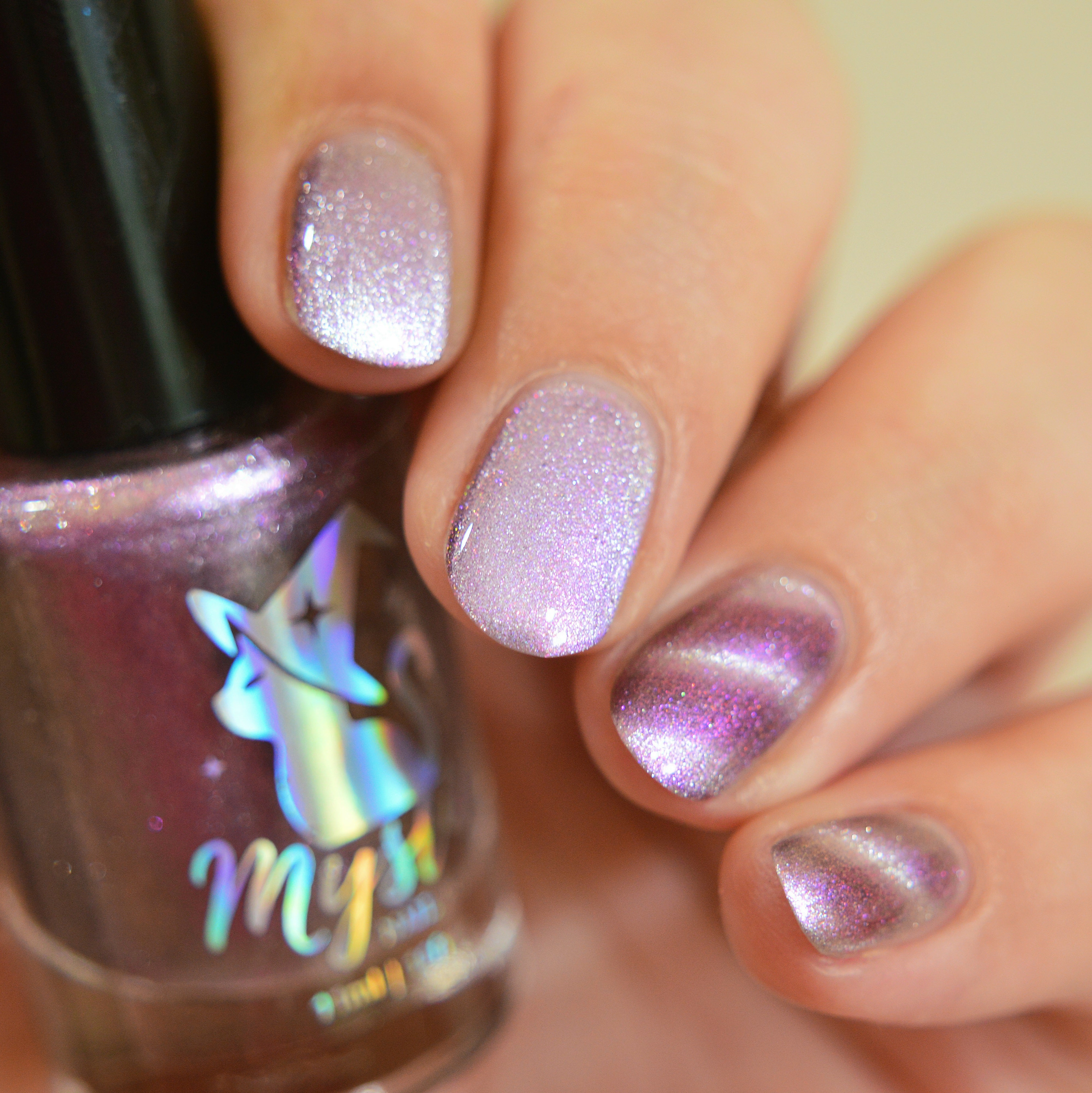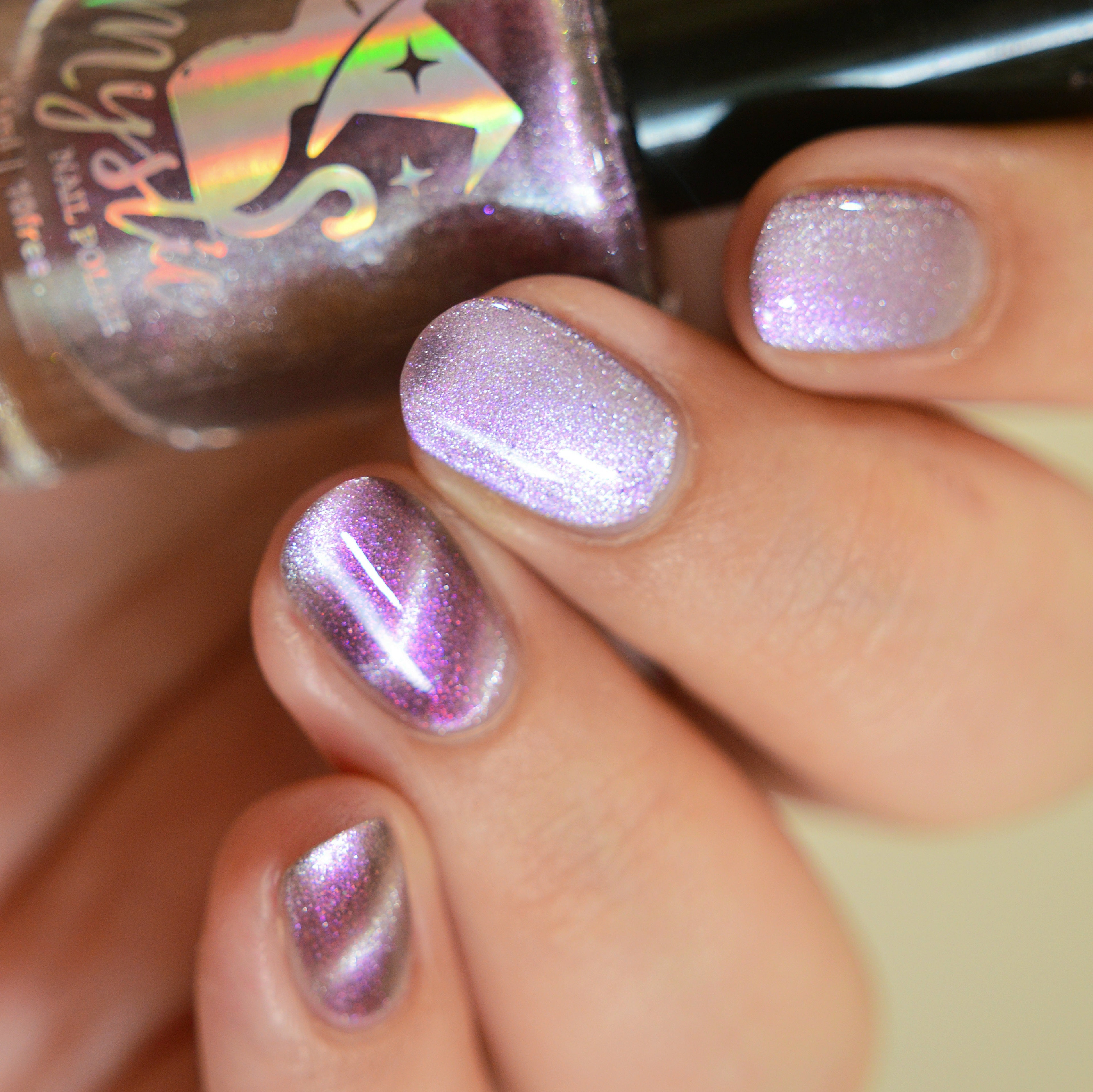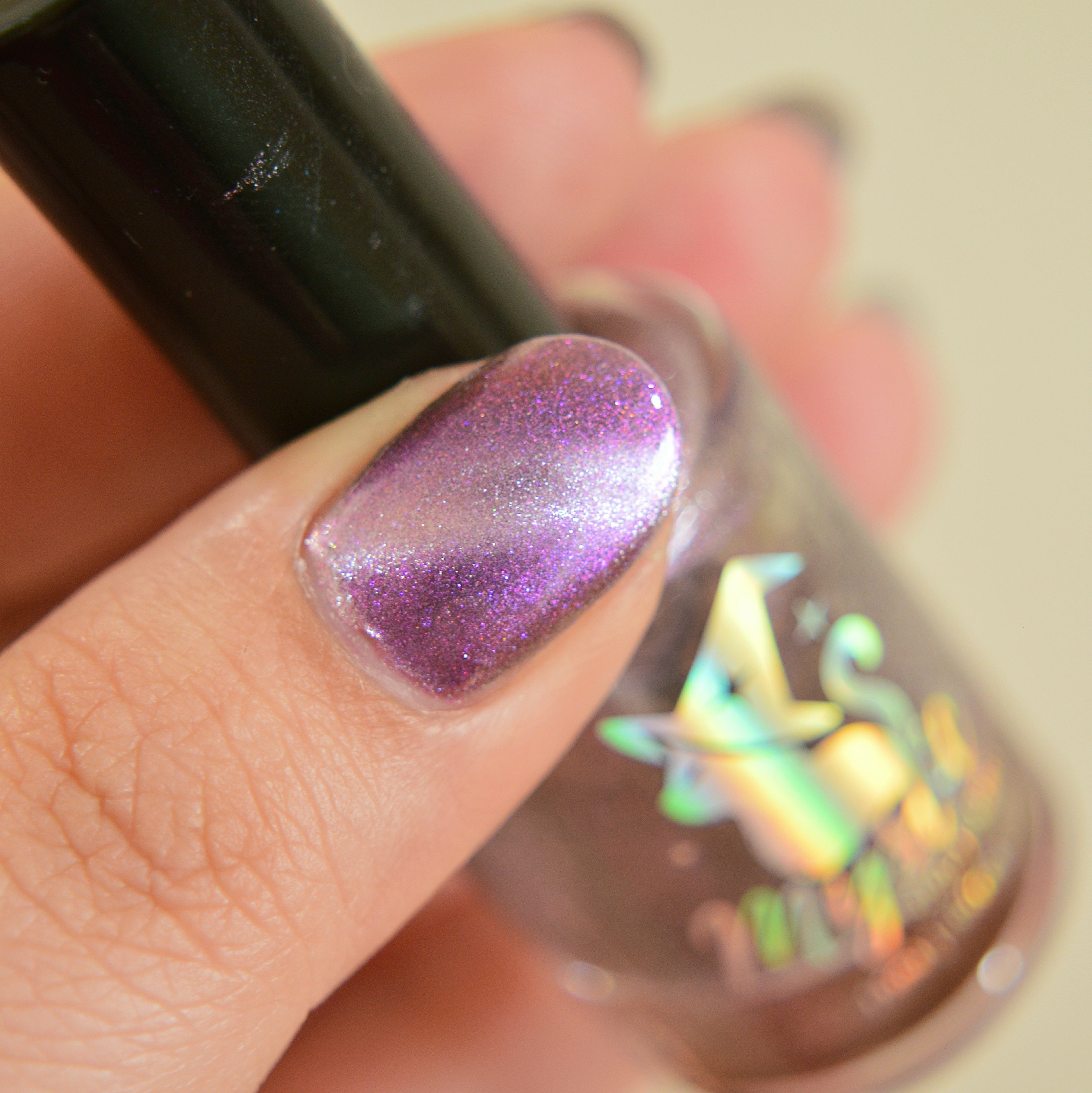 A pinky purple base with a strong teal to violet shifting shimmer and holo flakies.