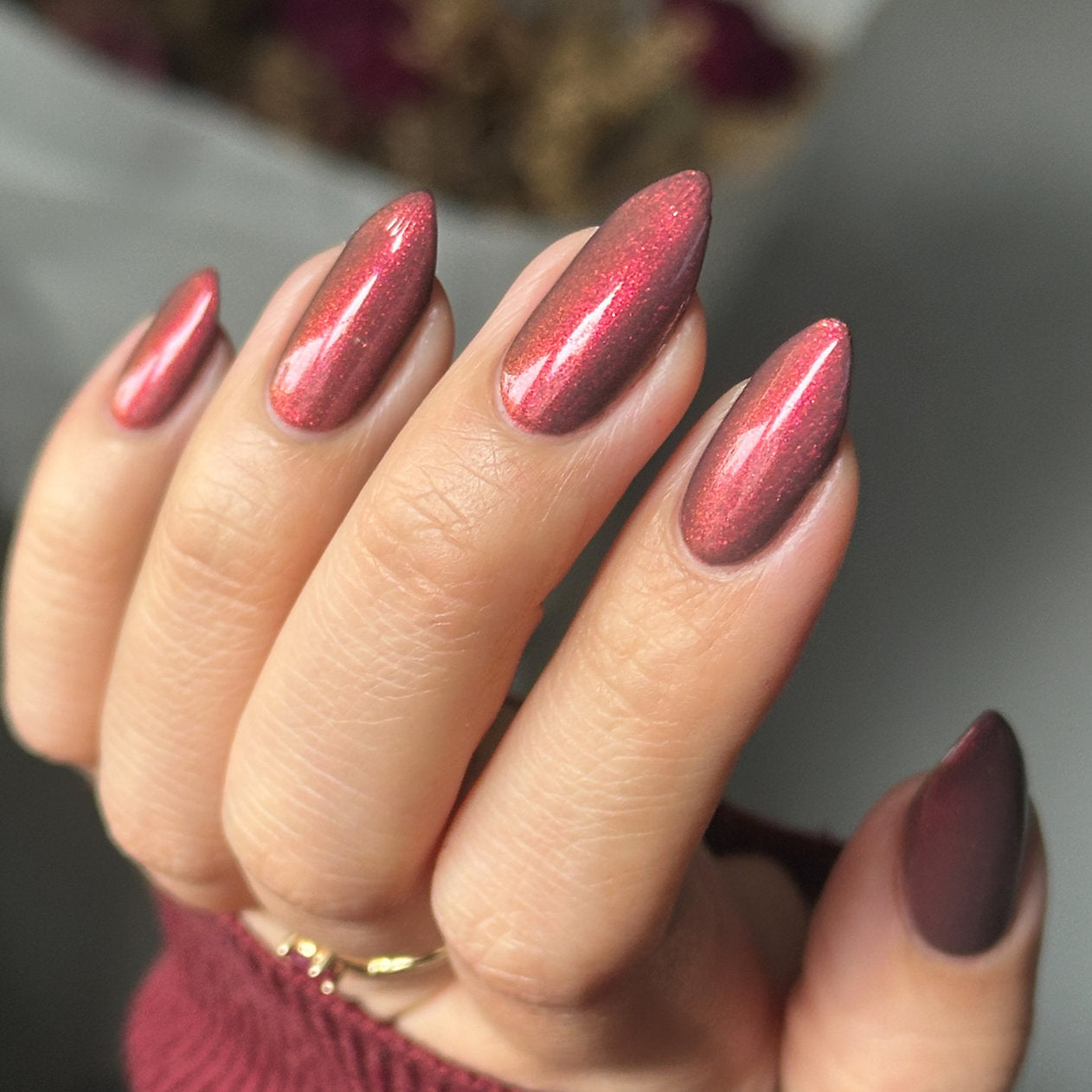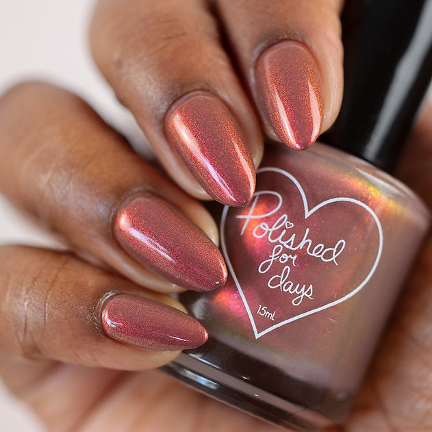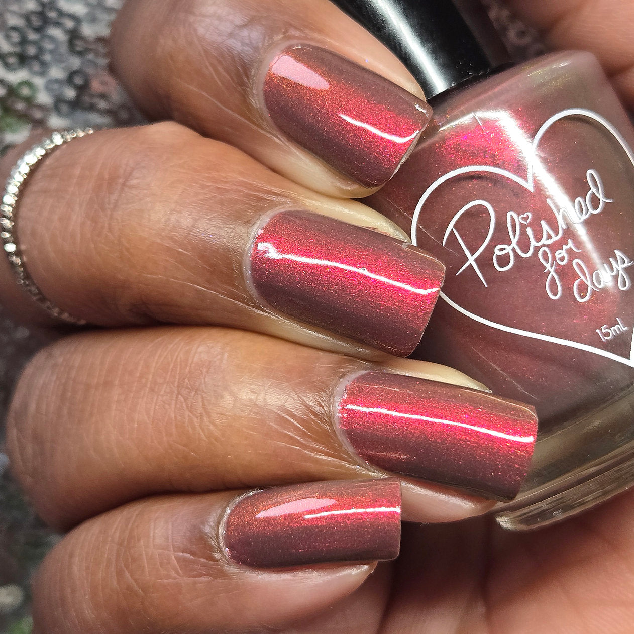 a milk chocolate base with pink-yellow-green shifting iridescent shimmer. Swatches here are for this 2025 version