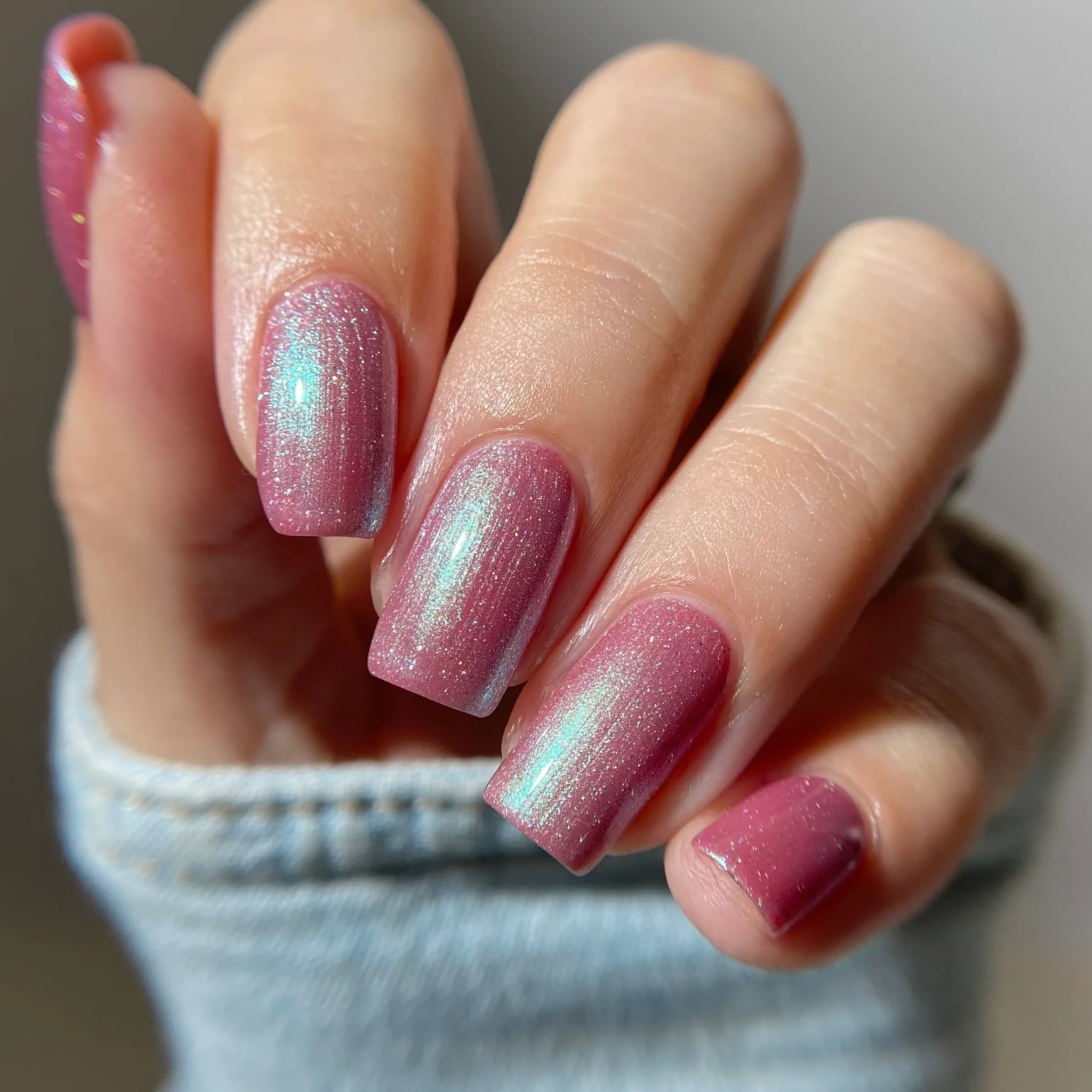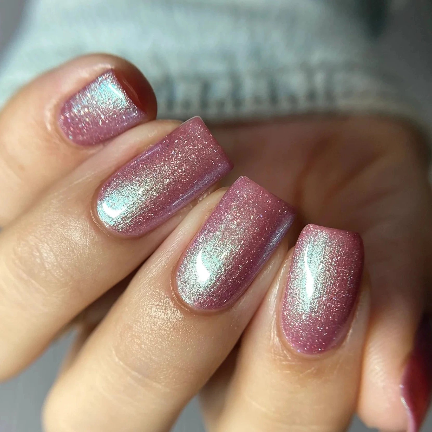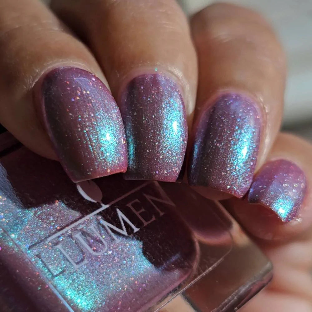 Set in a dusty mauve base, this magnetic polish blooms with a luminous blue-to-green-to-indigo shimmer that shifts and dances with every movement.