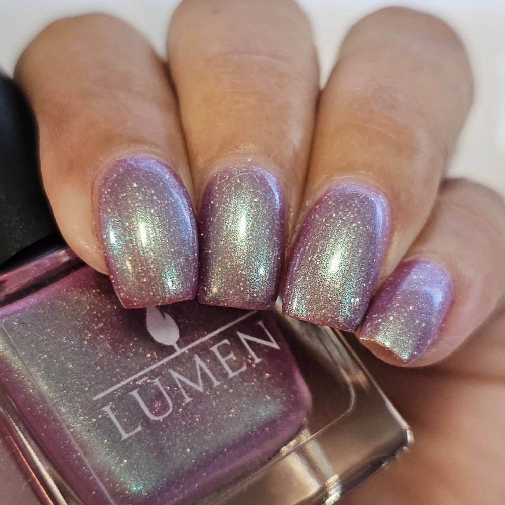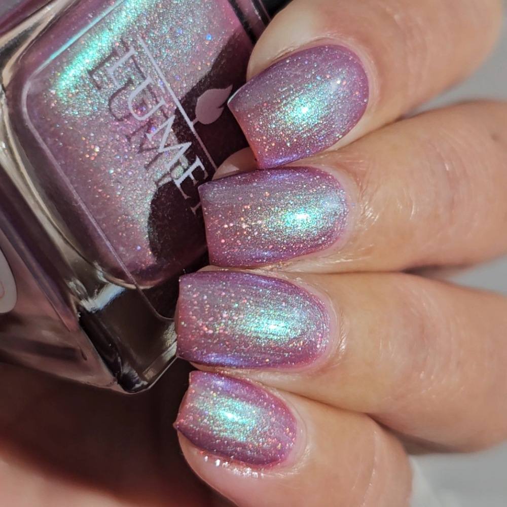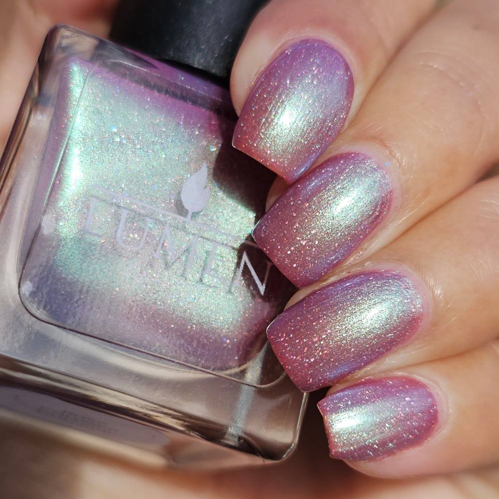 Set in a dusty mauve base, this magnetic polish blooms with a luminous blue-to-green-to-indigo shimmer that shifts and dances with every movement.