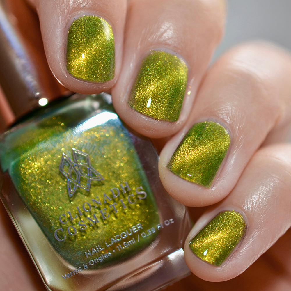 Pollen: A shimmering yellow-gold magnetic that pulls to reveal a murky green crelly base. Inspired by pollen and the plant parts which produce it. Pollen can be used to create natural dyes for use in food, arts and textile industries.