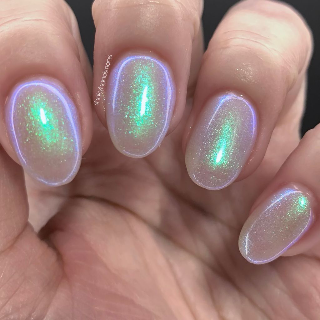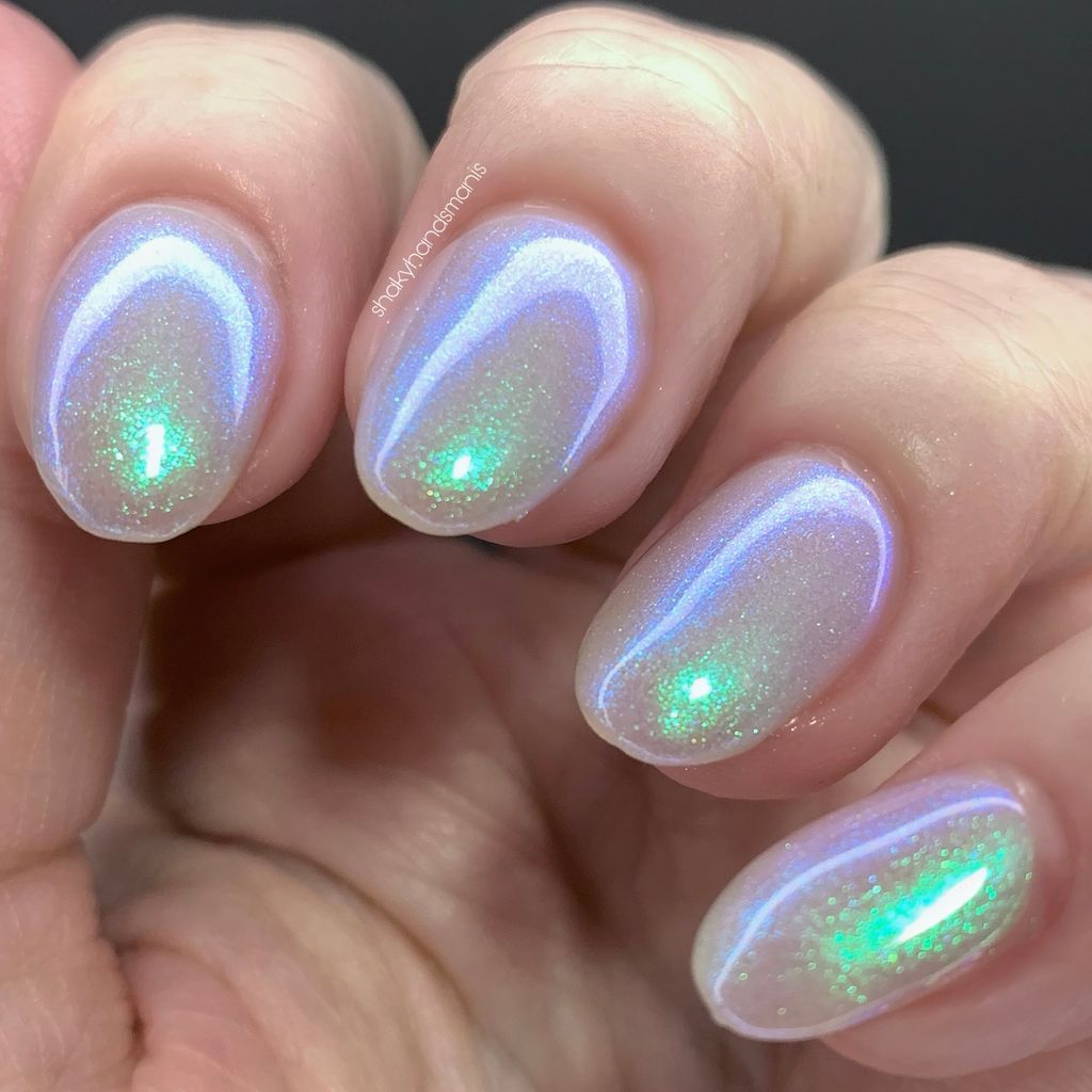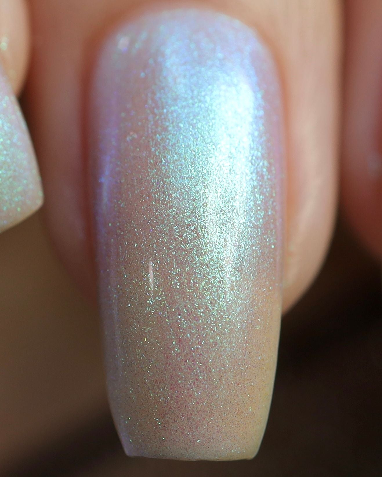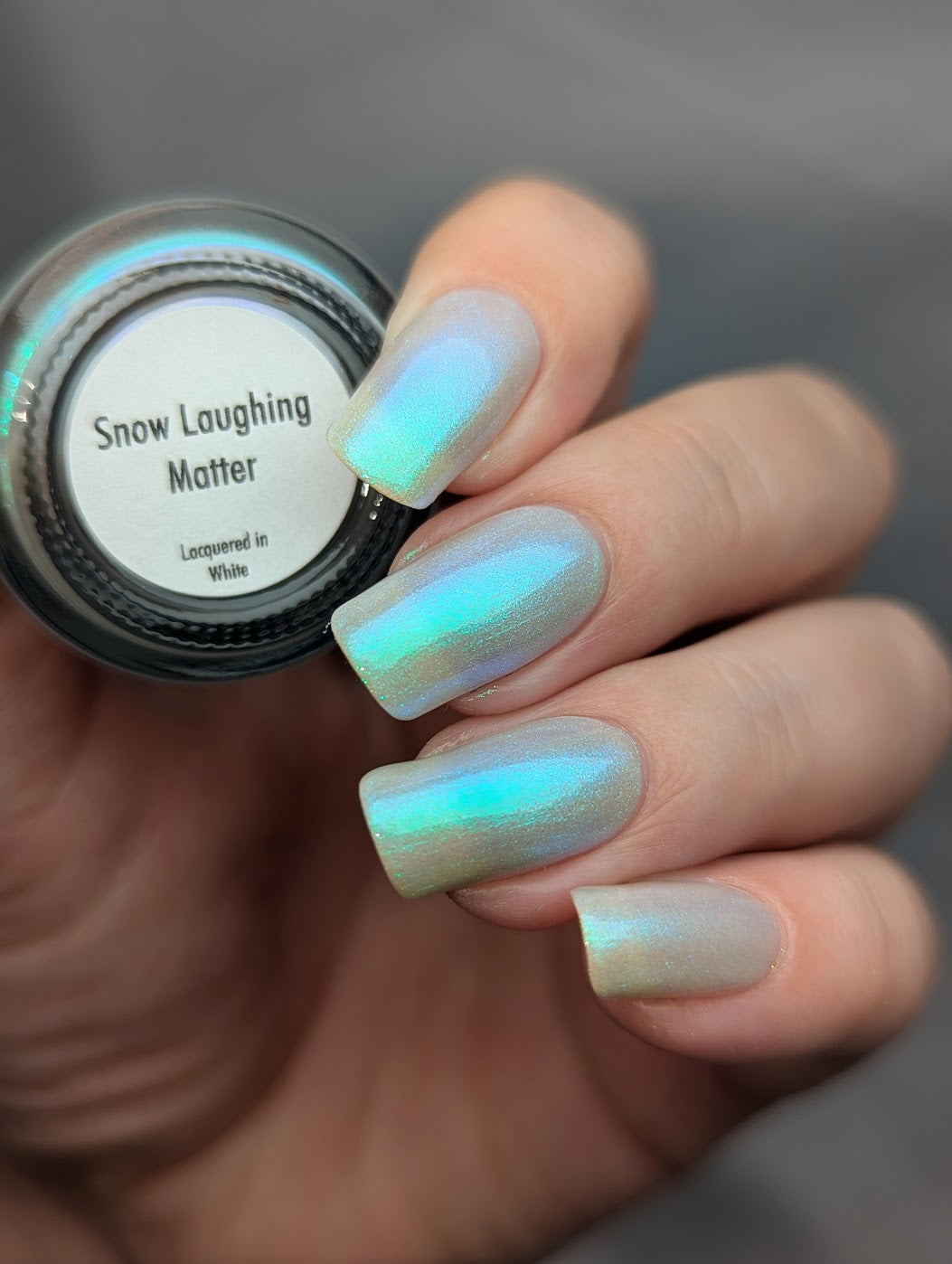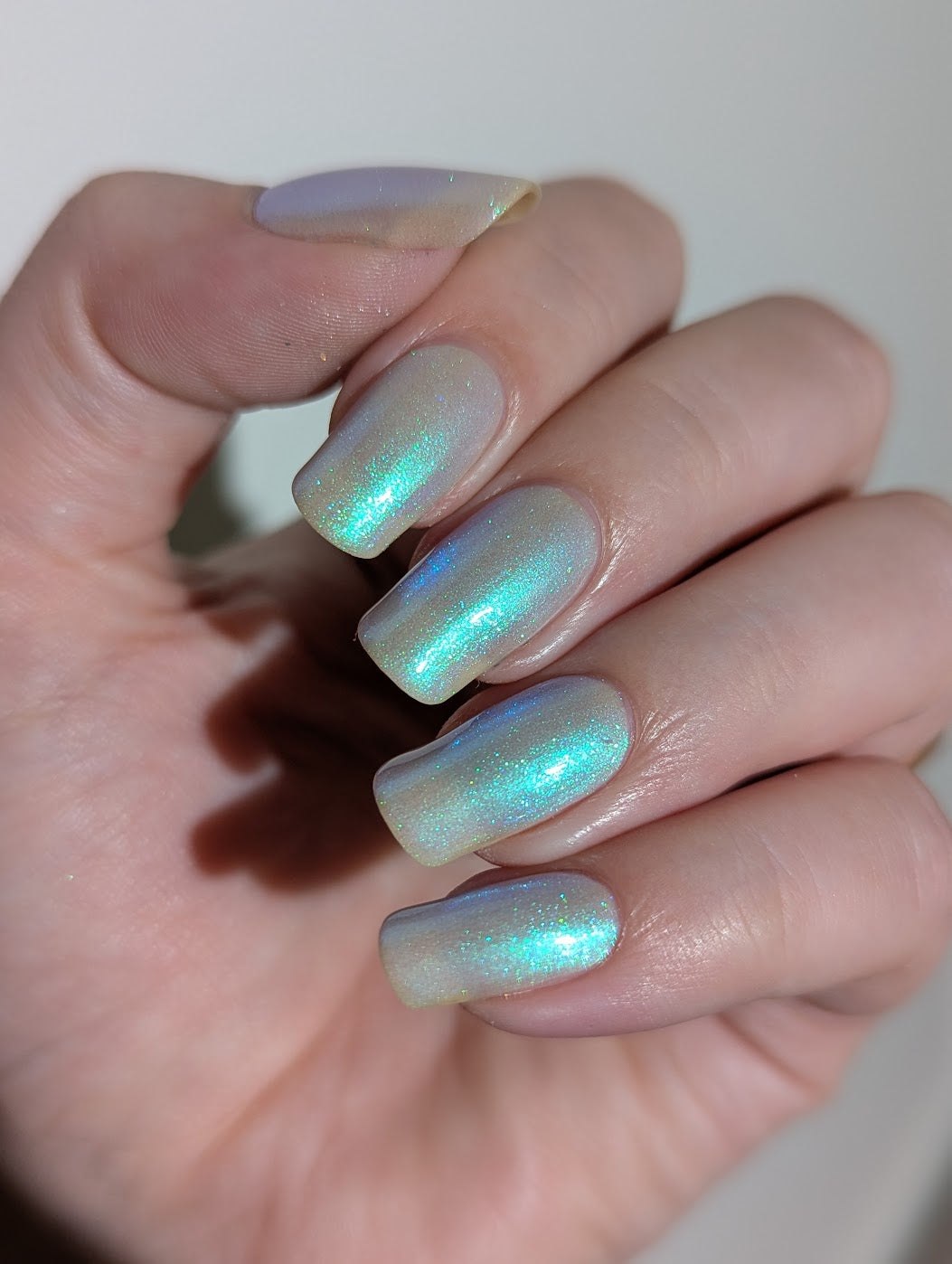 a sheer white with sparkly green to blue aurora shimmer. Like snow so often can, it does look dingy gray in the bottle but that doesn't seem to translate to the nail.