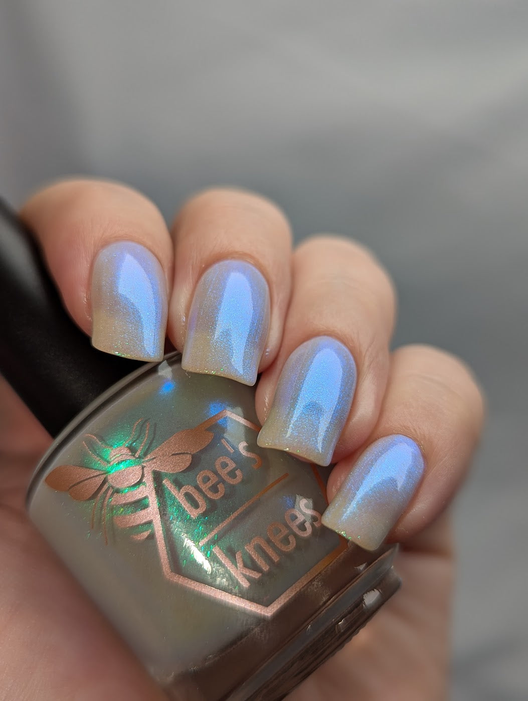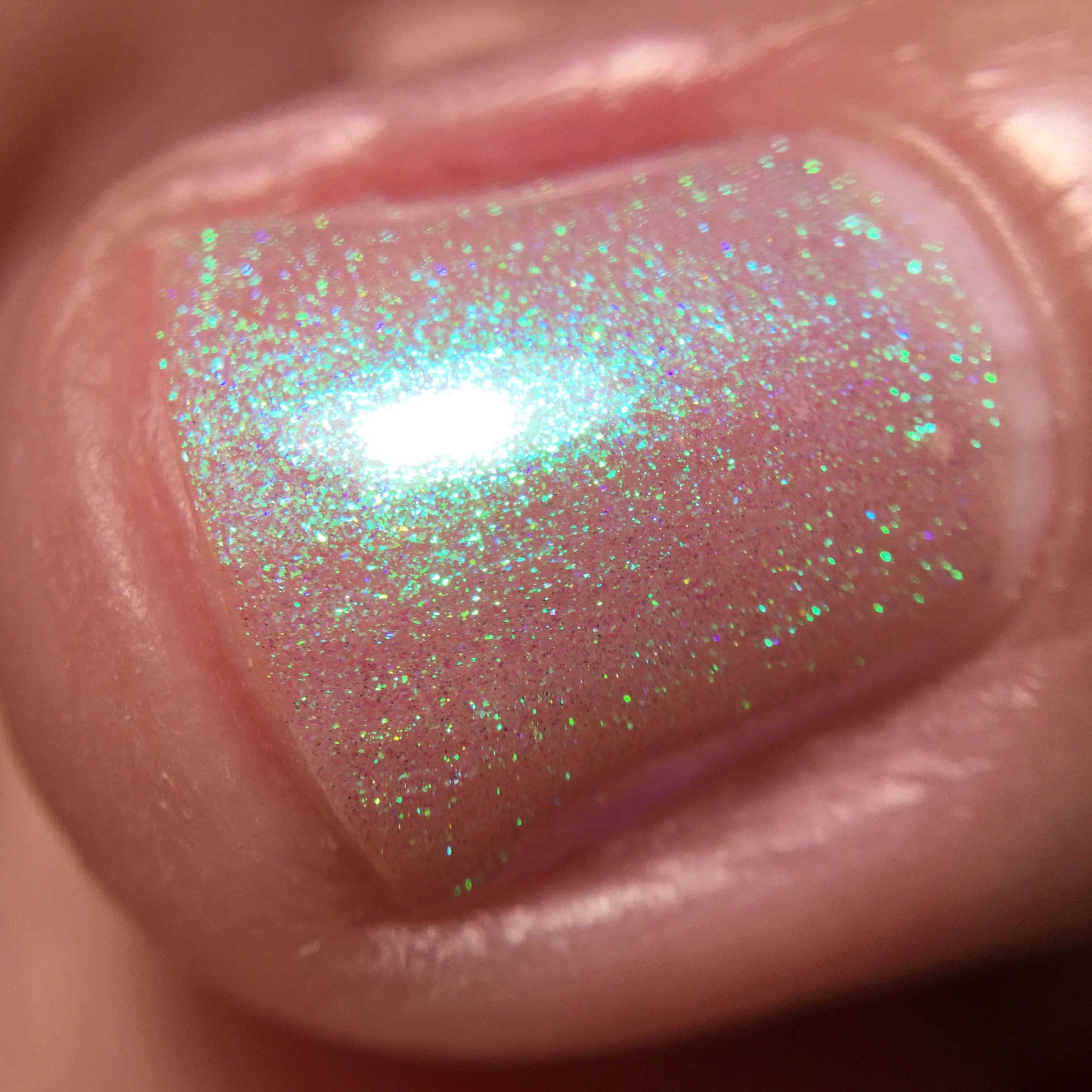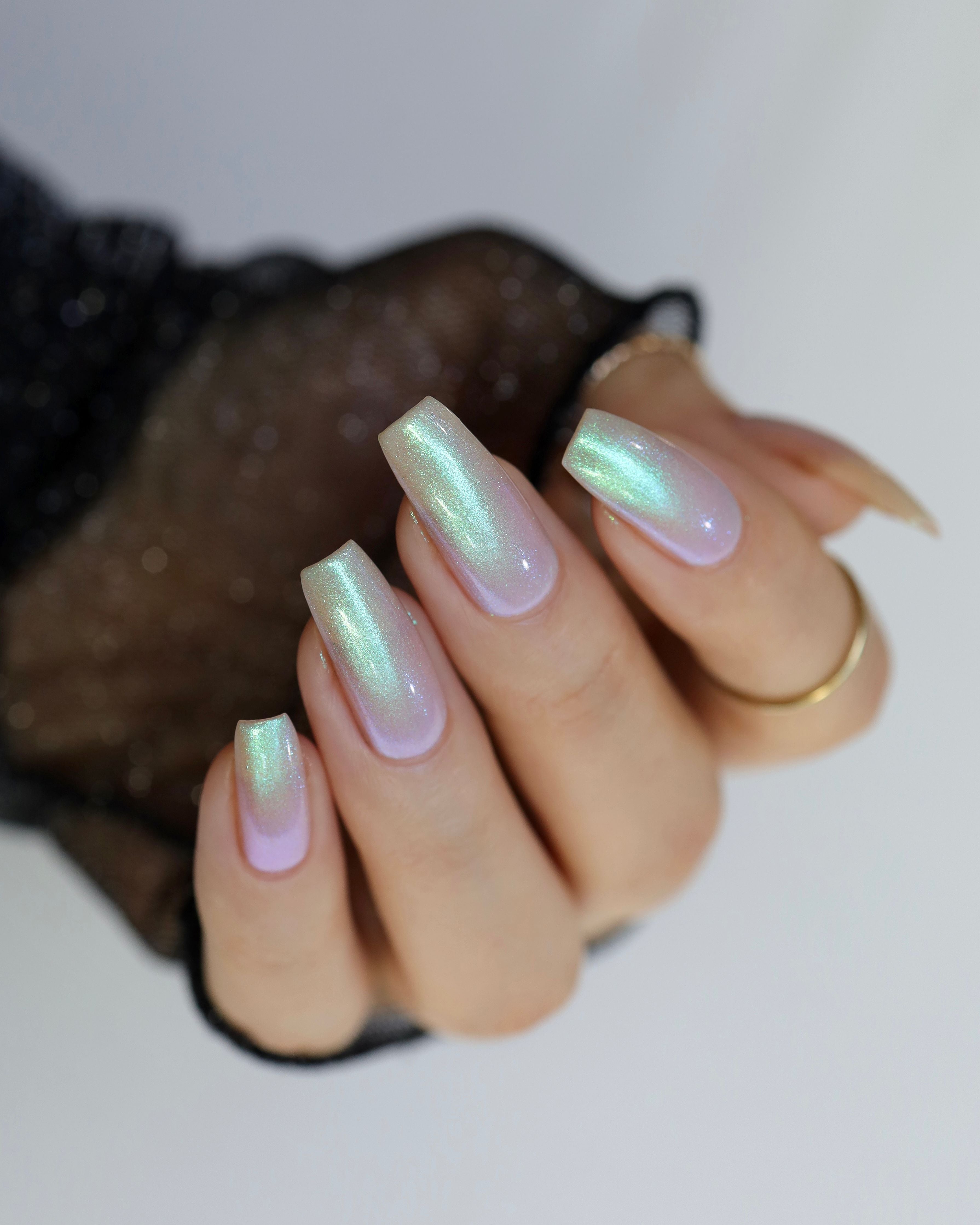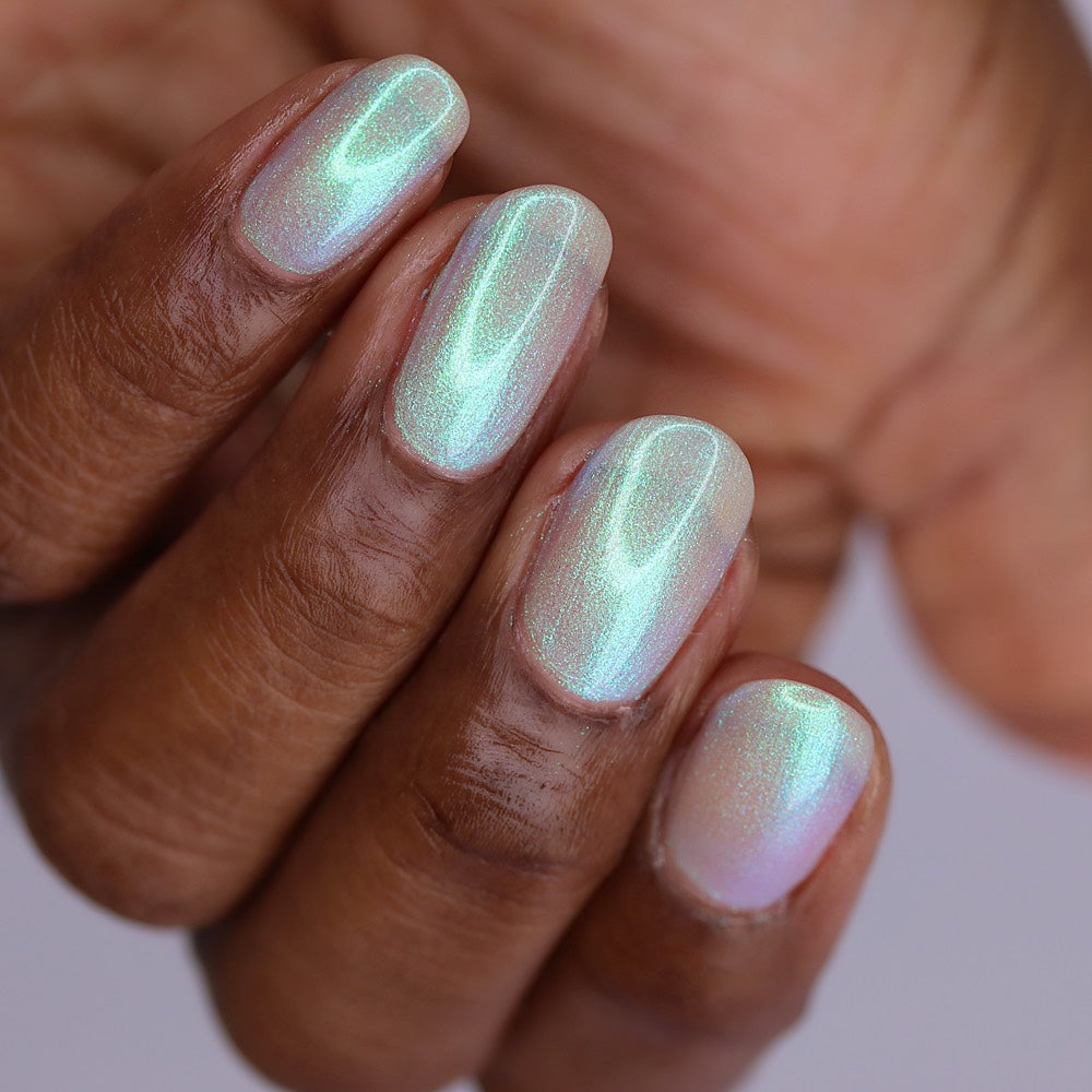 a sheer white with sparkly green to blue aurora shimmer. Like snow so often can, it does look dingy gray in the bottle but that doesn't seem to translate to the nail.