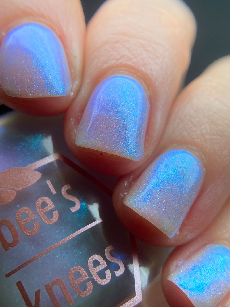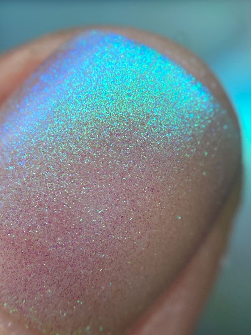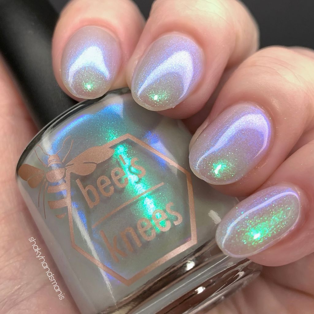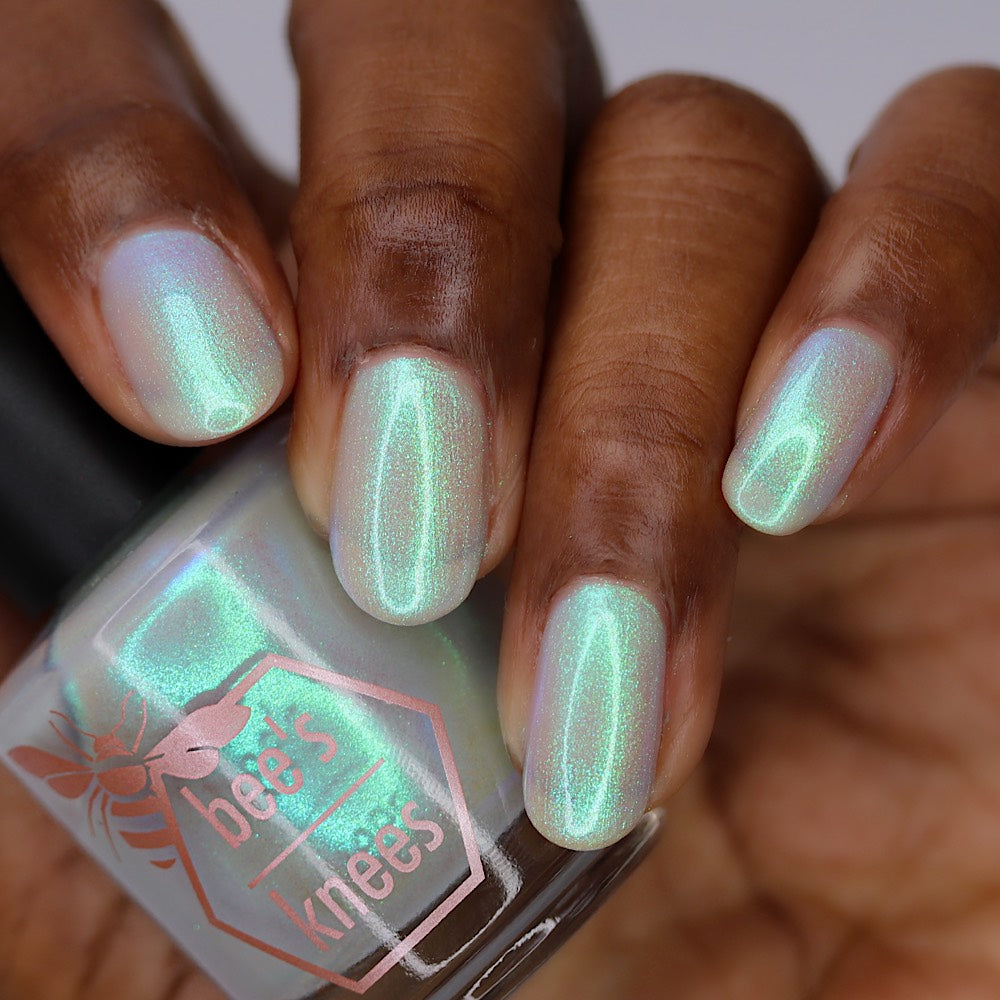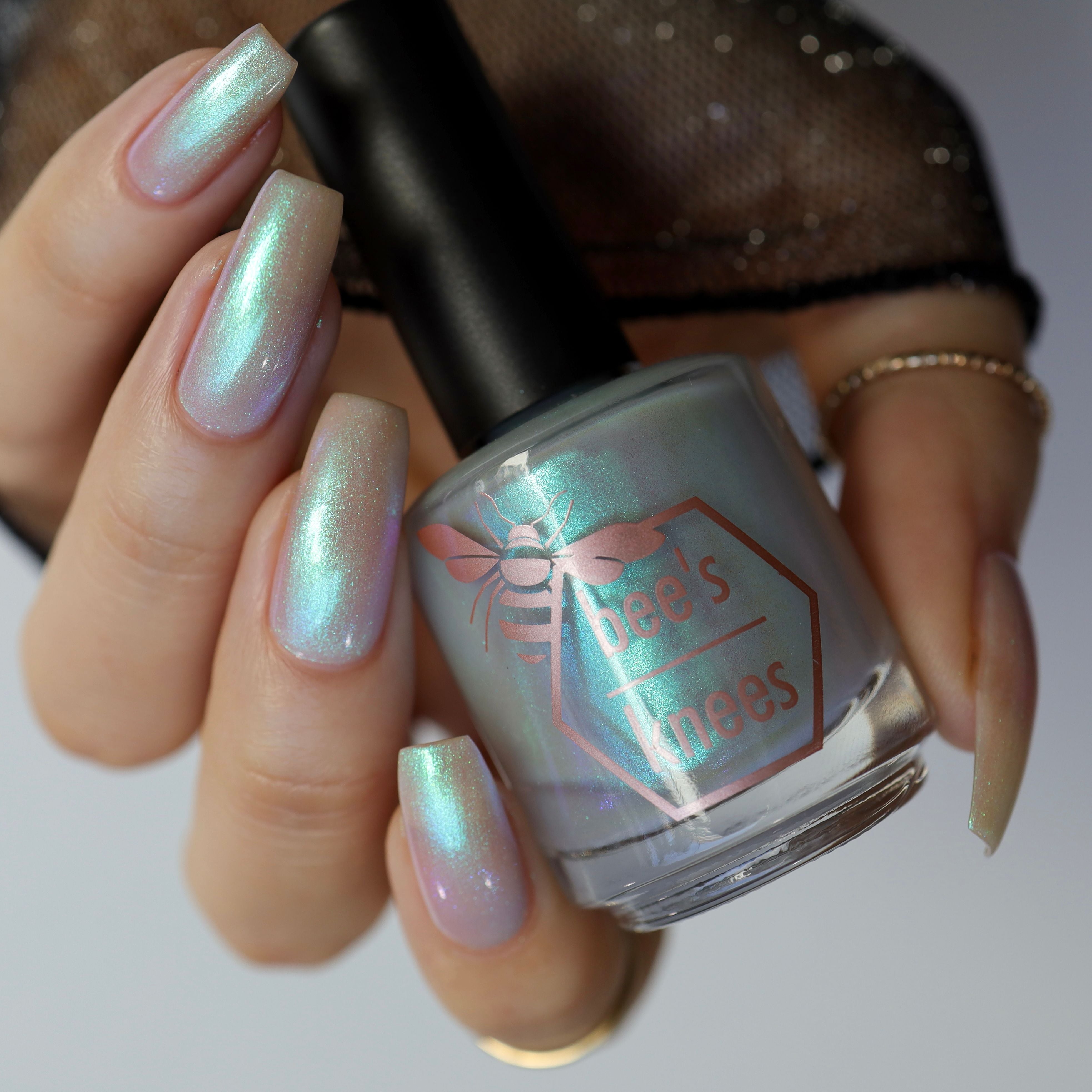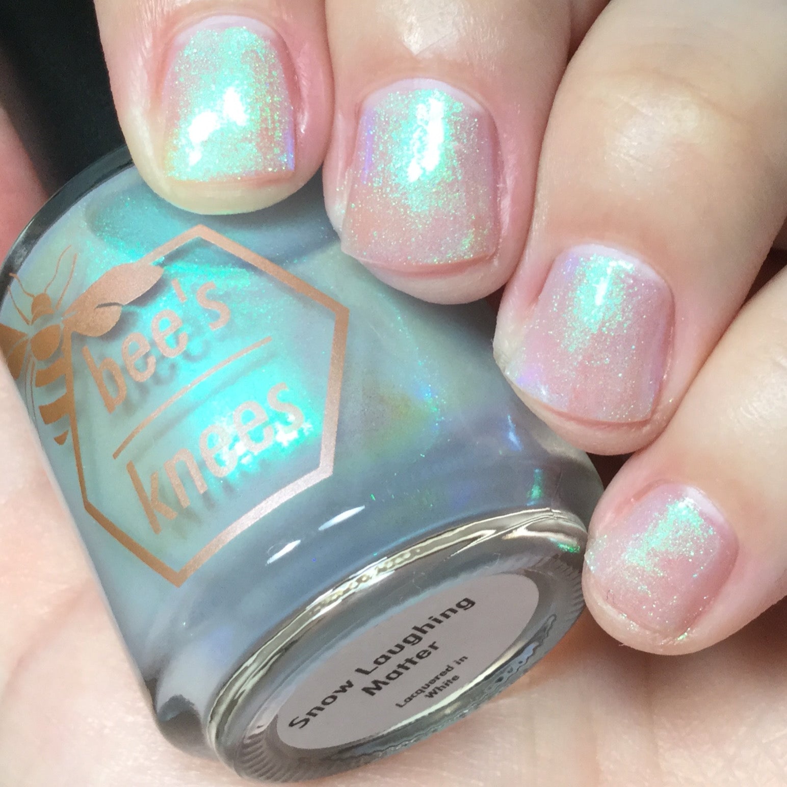 a sheer white with sparkly green to blue aurora shimmer. Like snow so often can, it does look dingy gray in the bottle but that doesn't seem to translate to the nail.