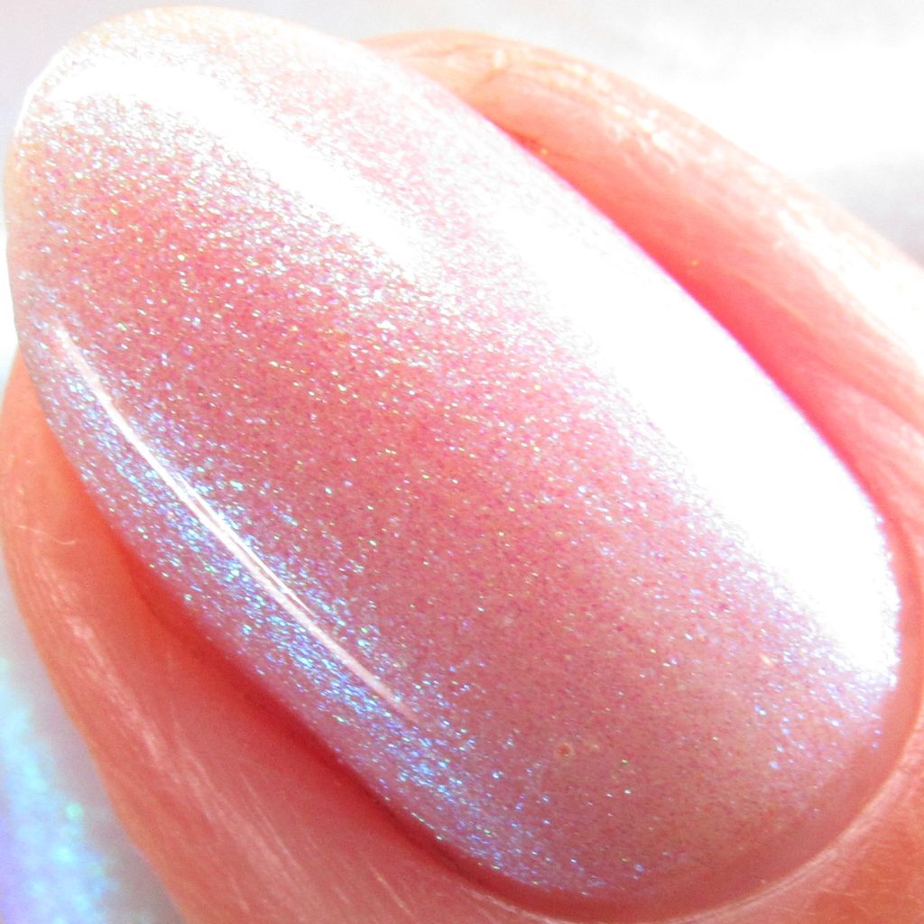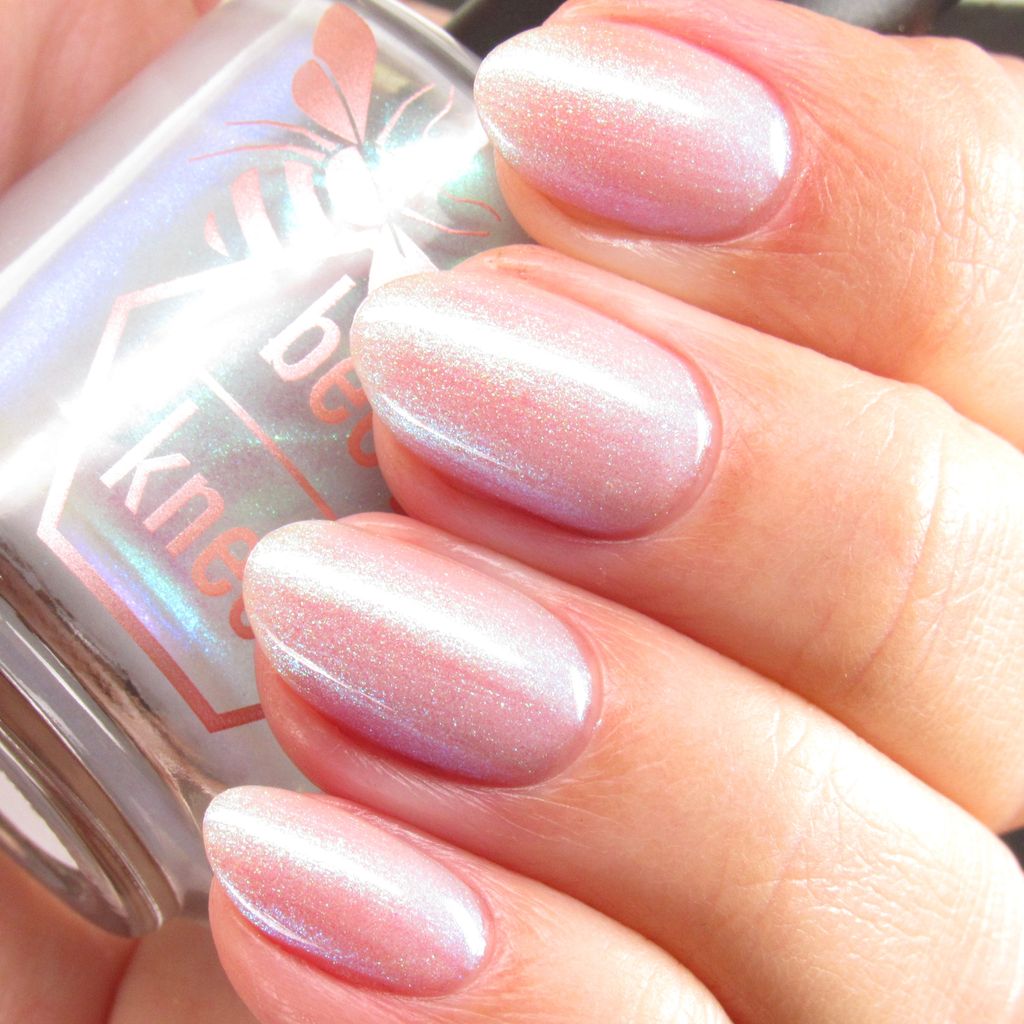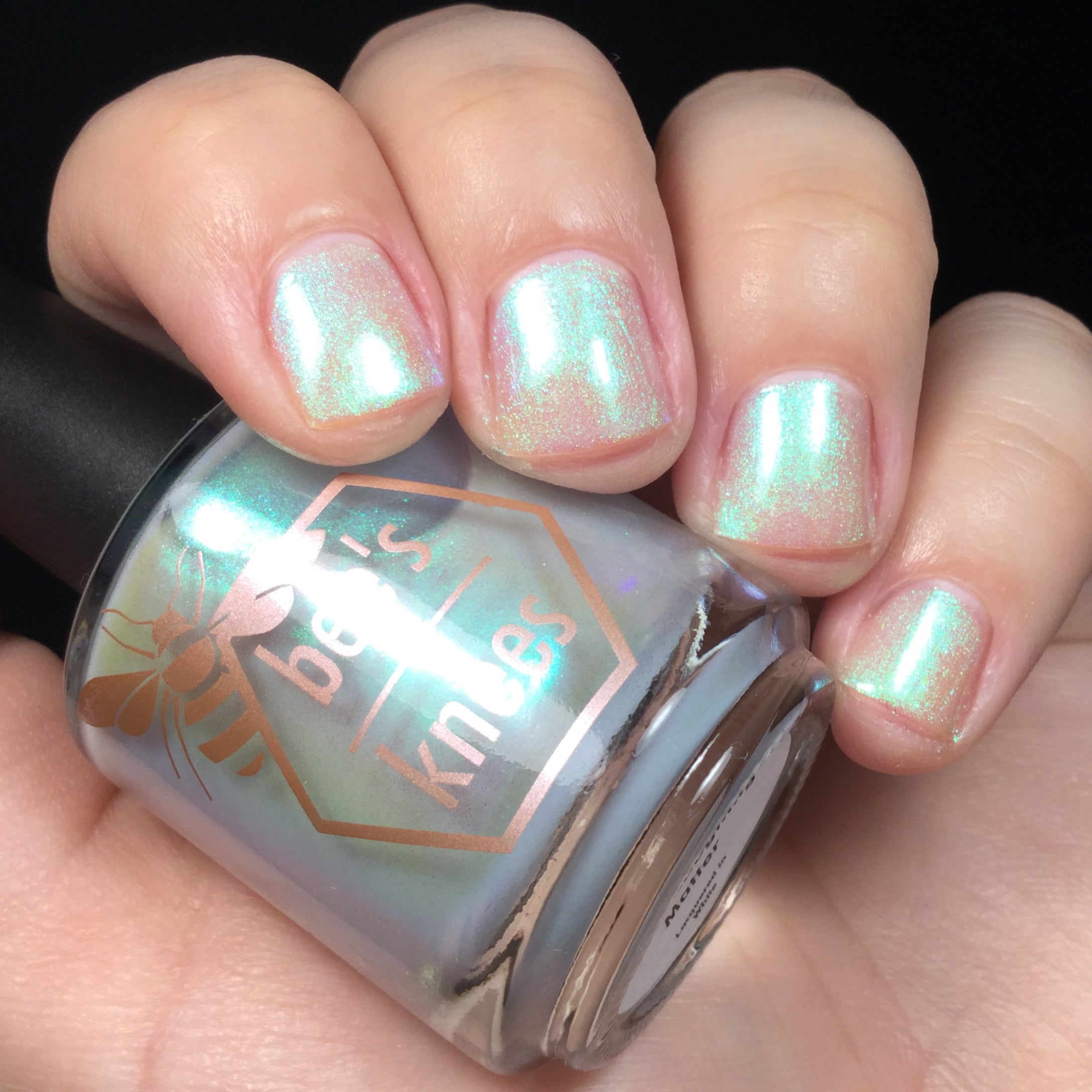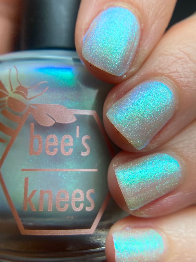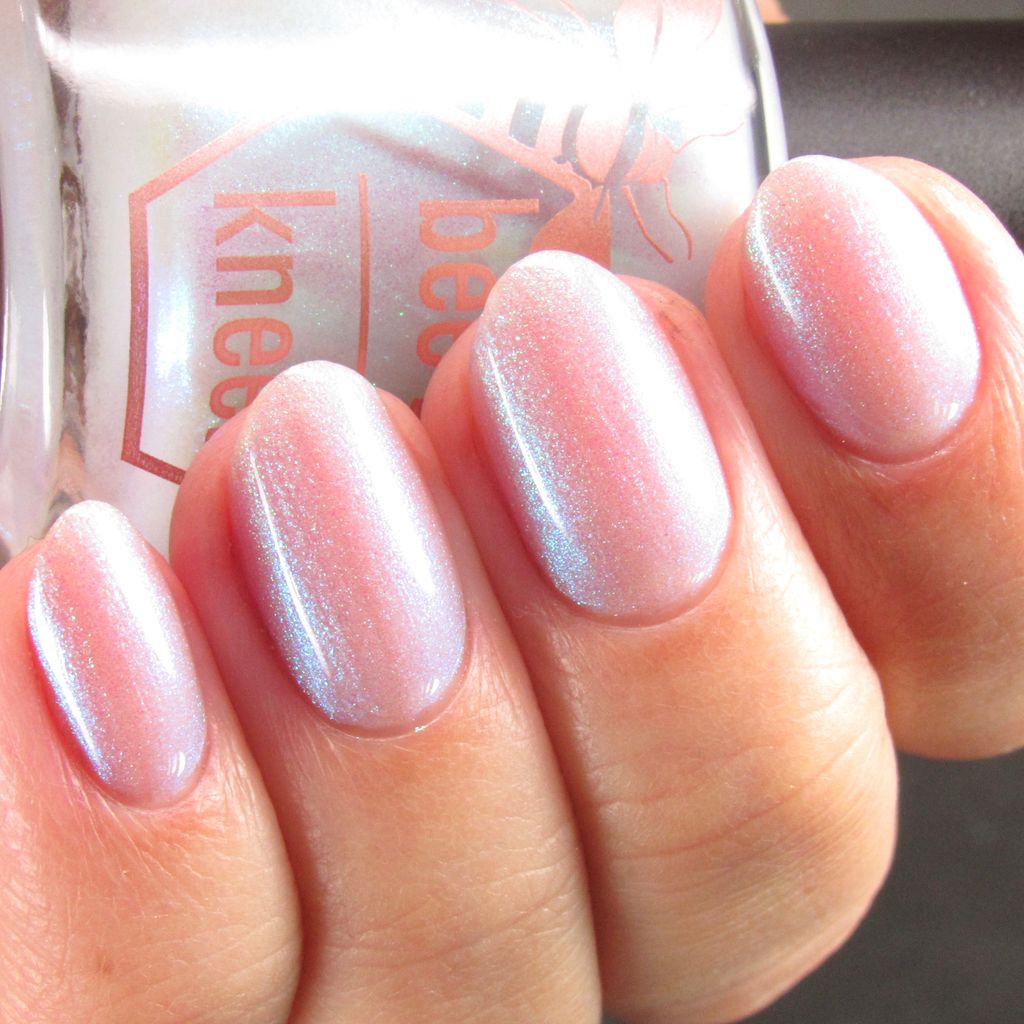 a sheer white with sparkly green to blue aurora shimmer. Like snow so often can, it does look dingy gray in the bottle but that doesn't seem to translate to the nail.