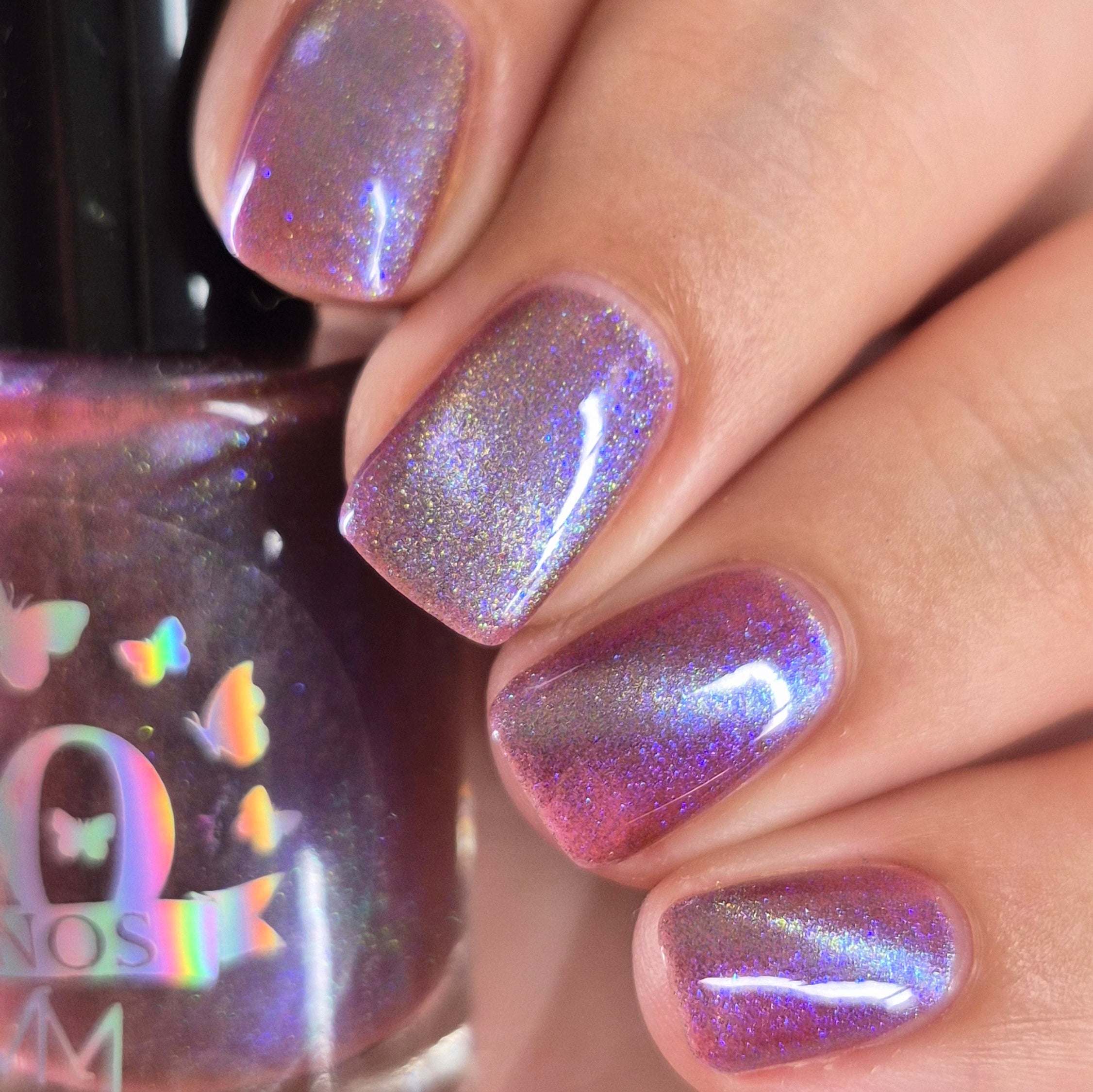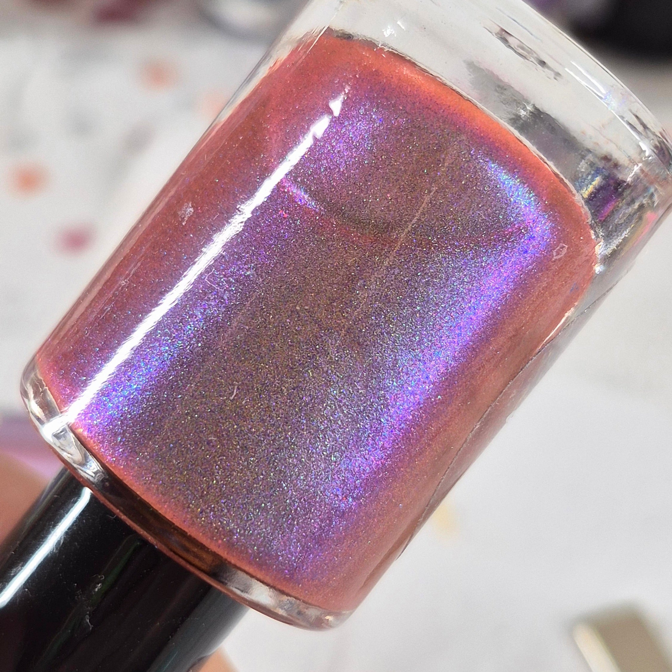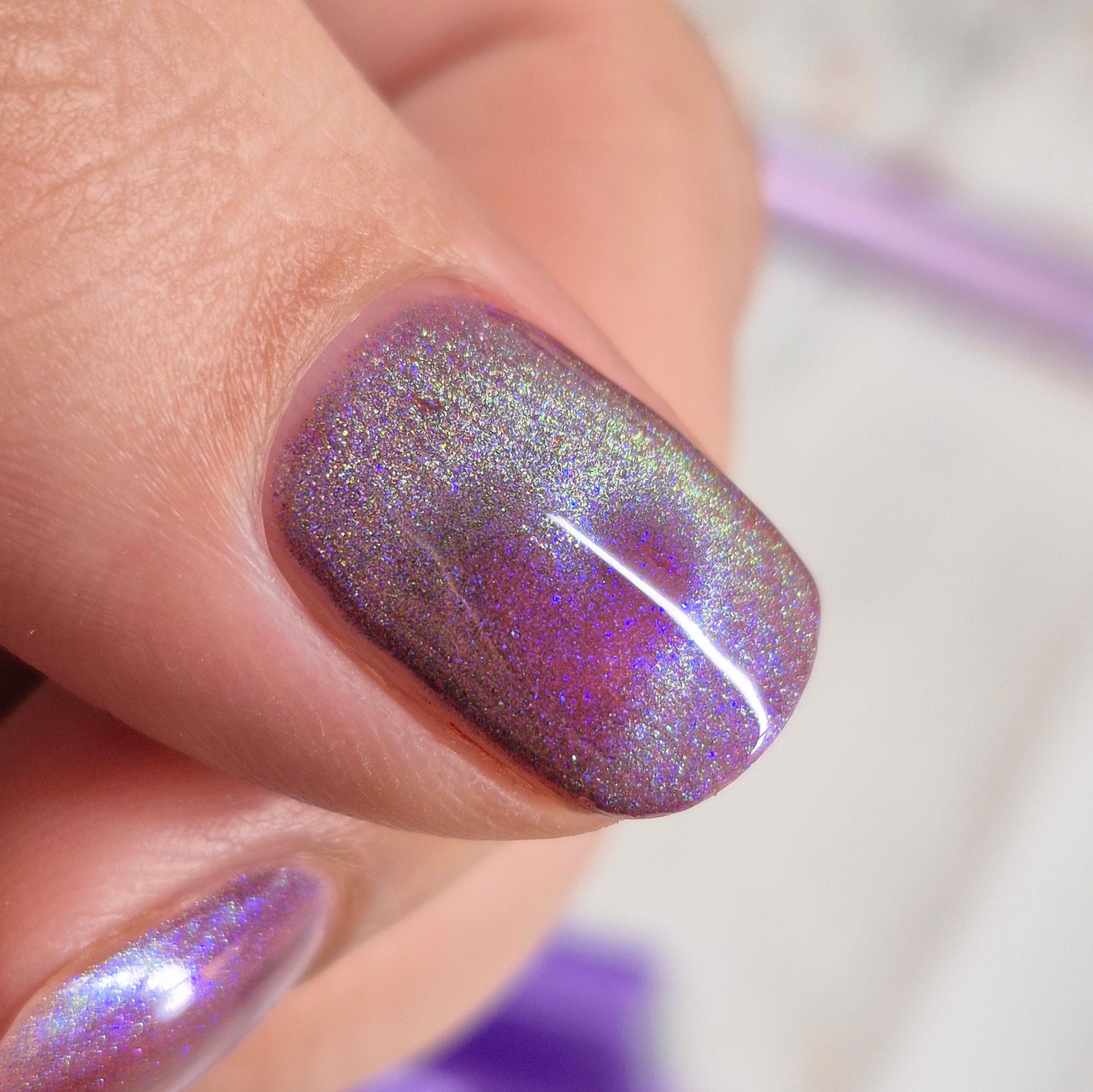 A pinky purple base with a strong teal to violet shifting shimmer and holo flakies.