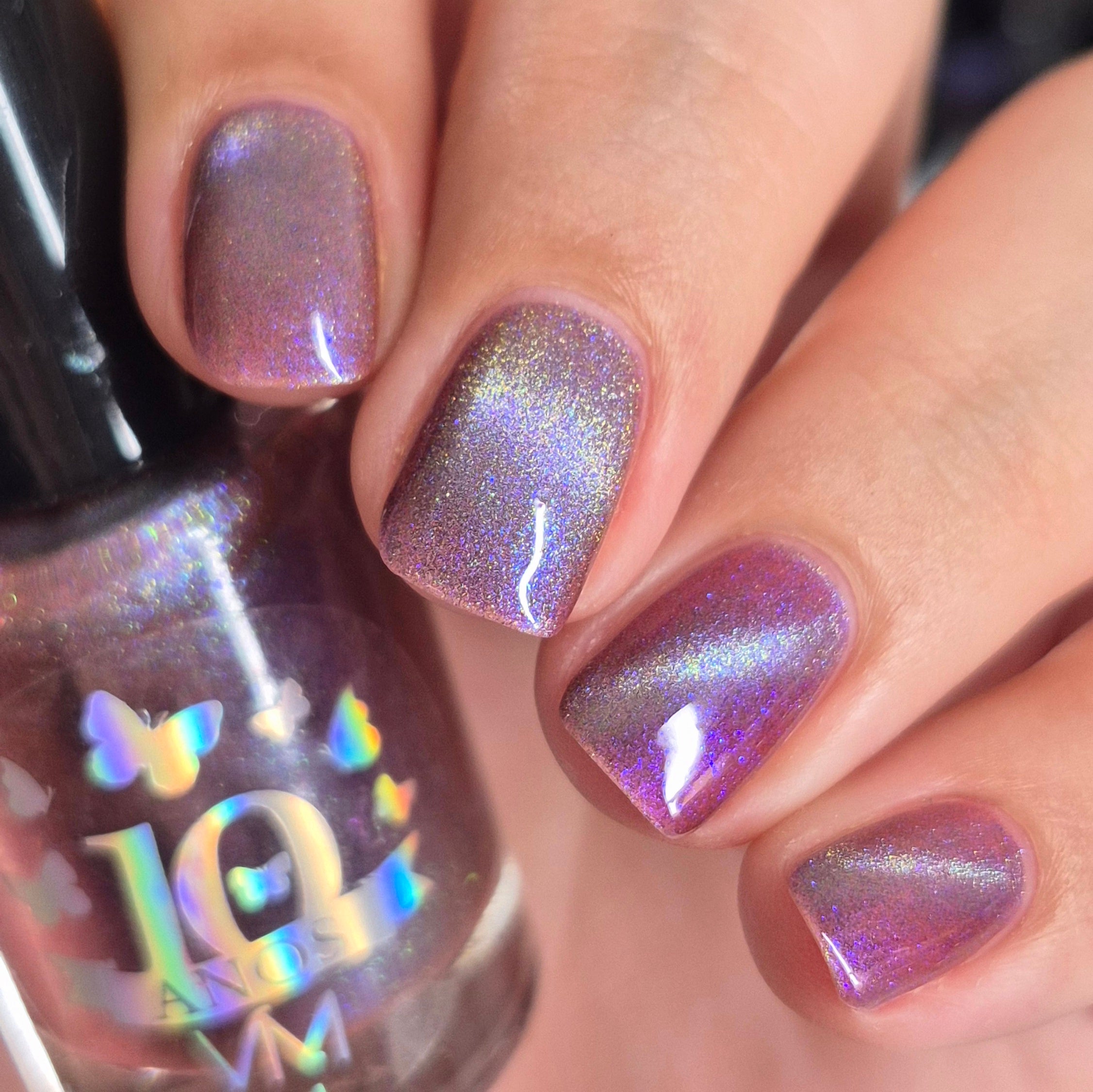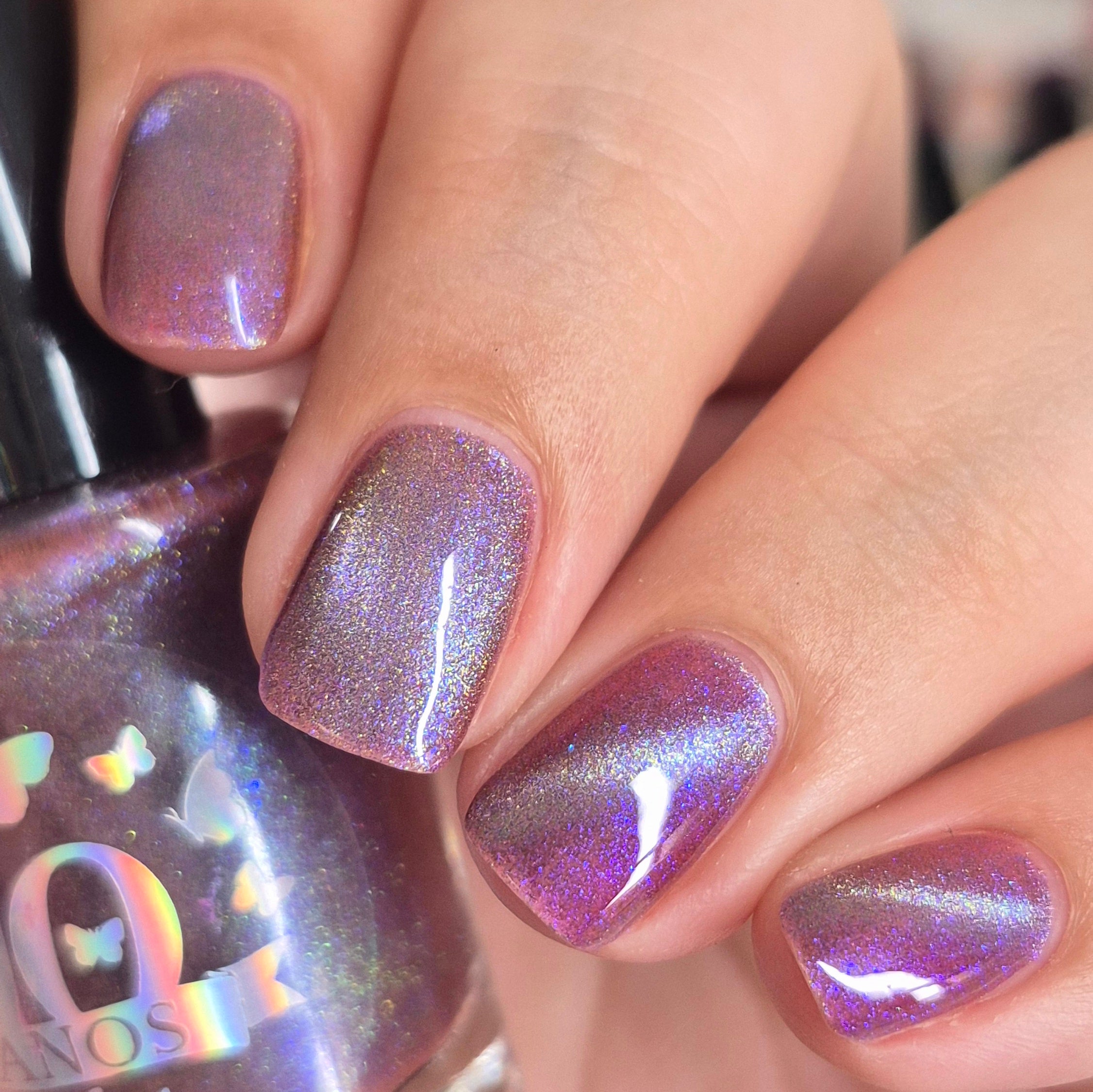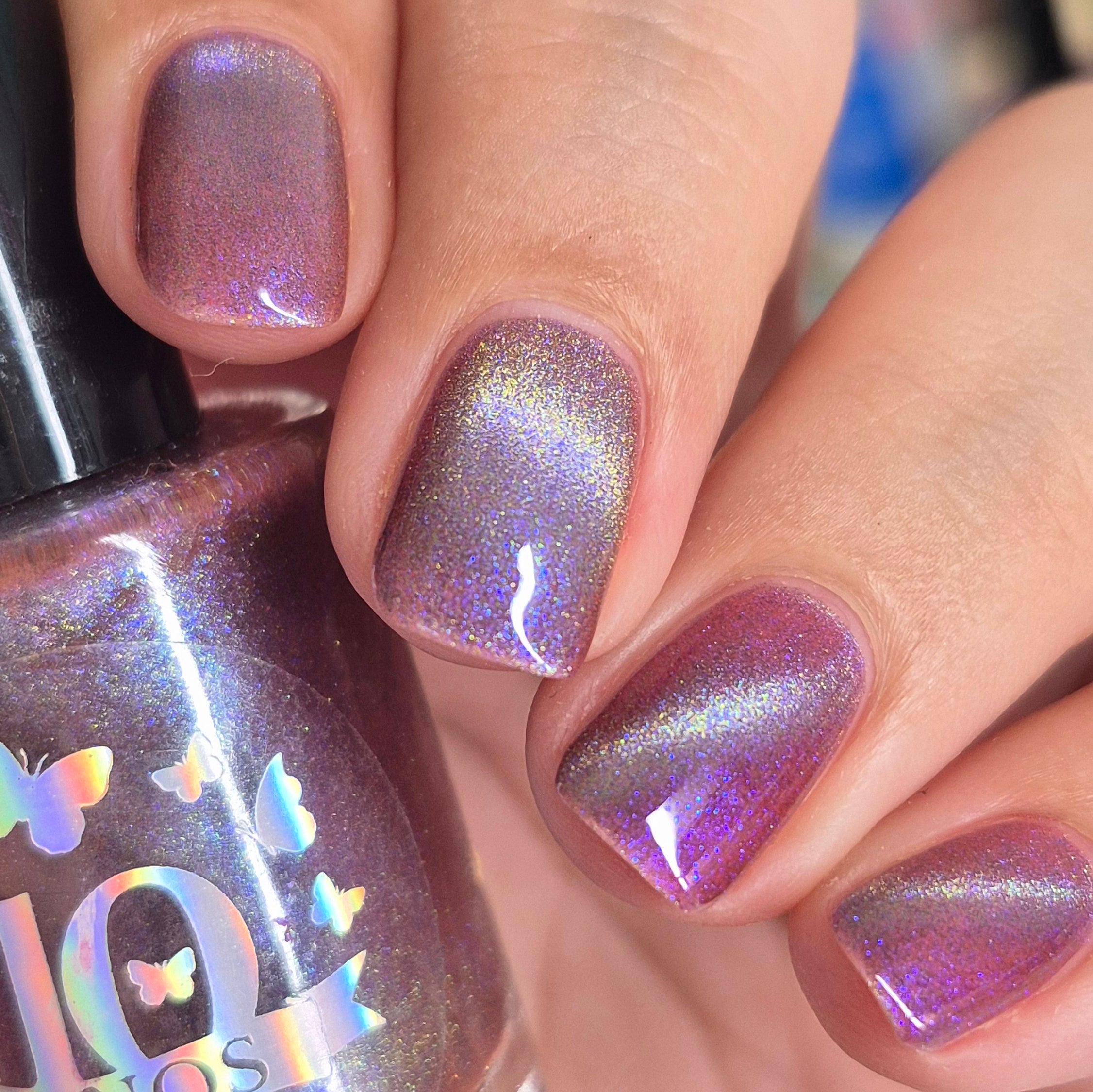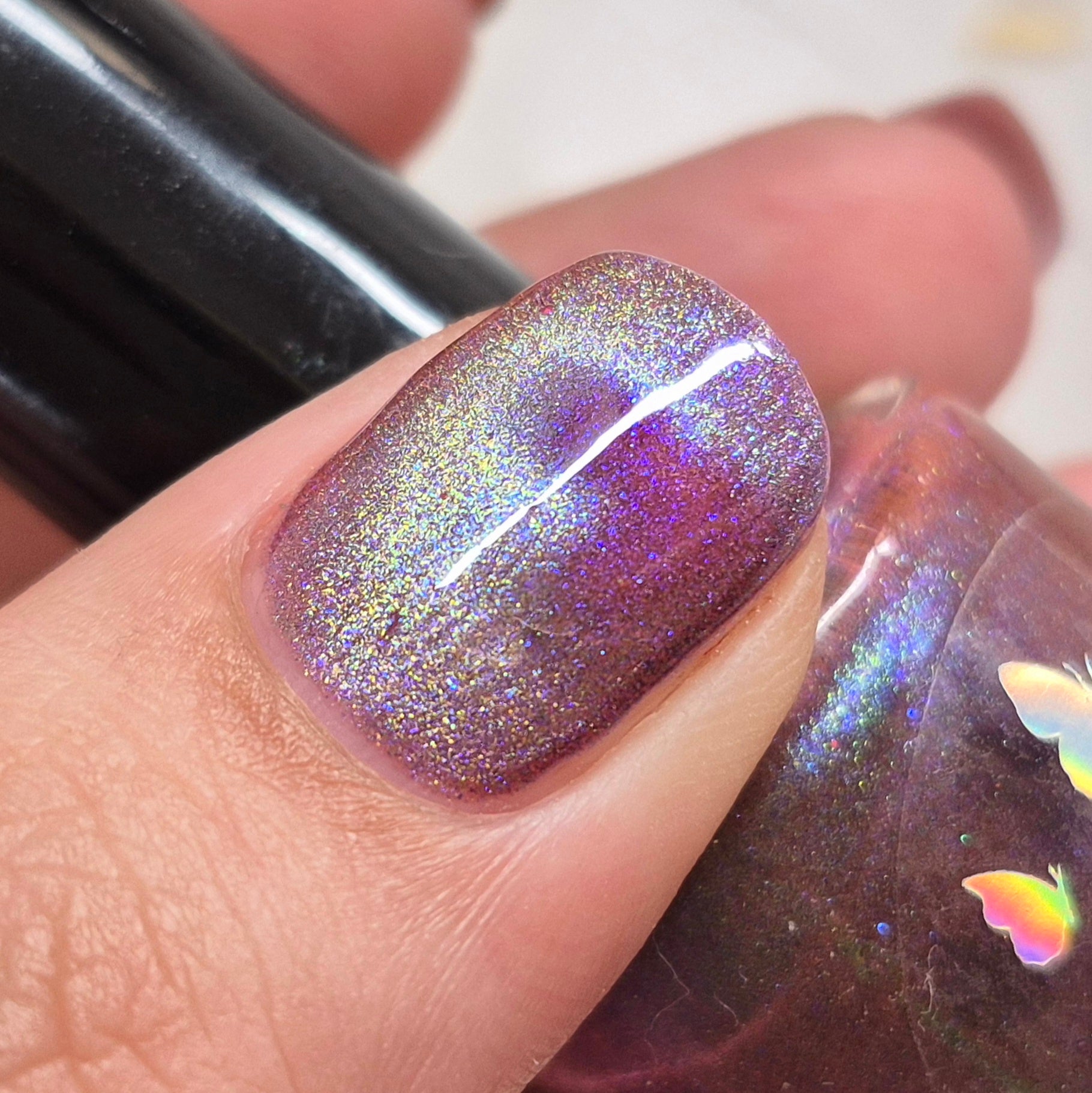 A pinky purple base with a strong teal to violet shifting shimmer and holo flakies.