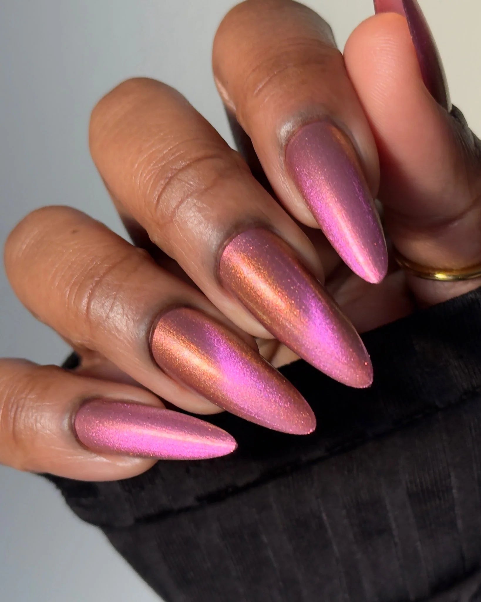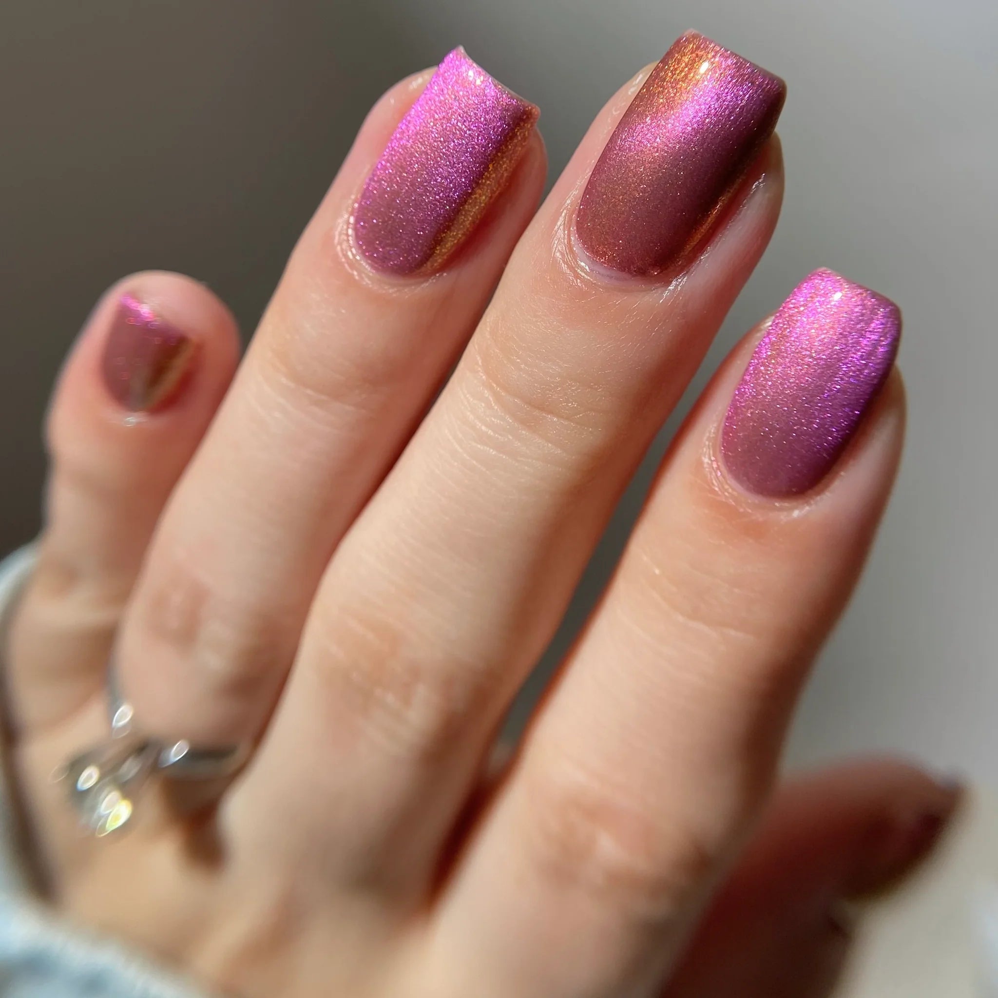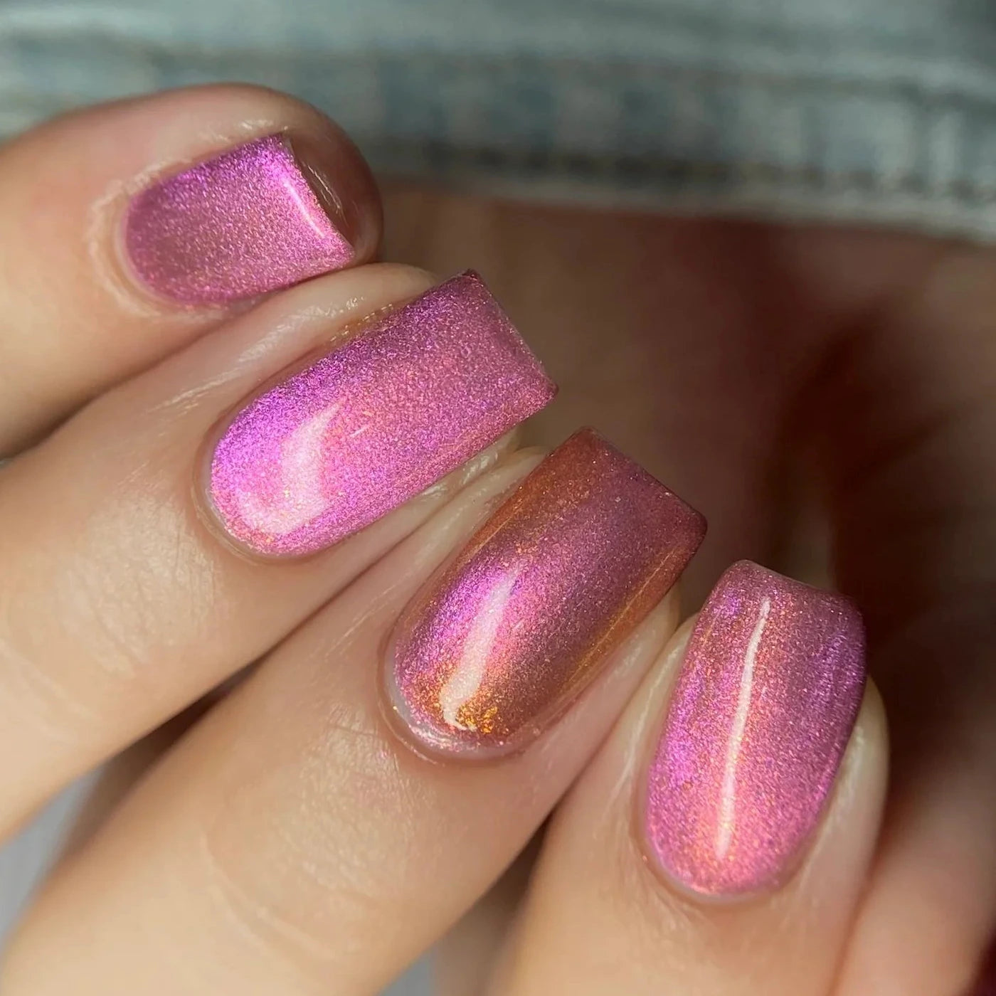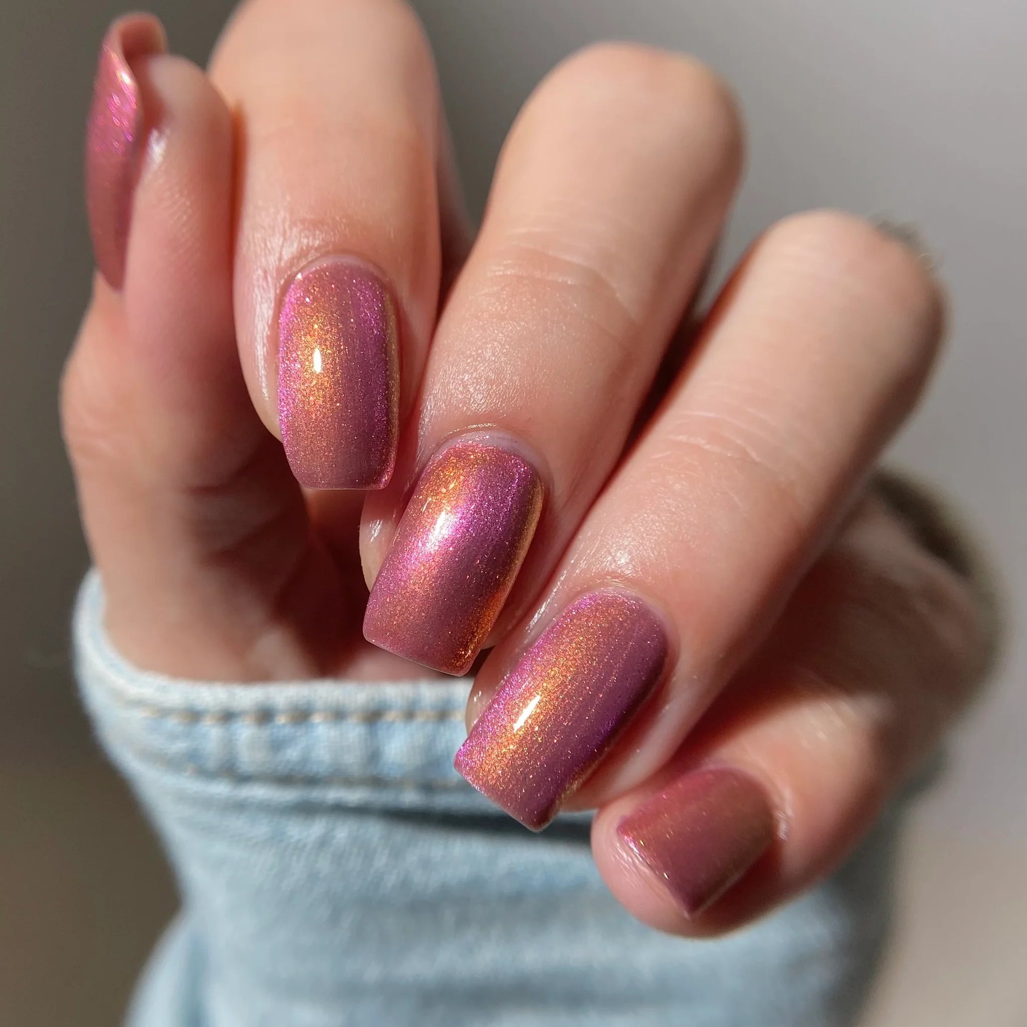 A pinky purple base with a strong teal to violet shifting shimmer and holo flakies.