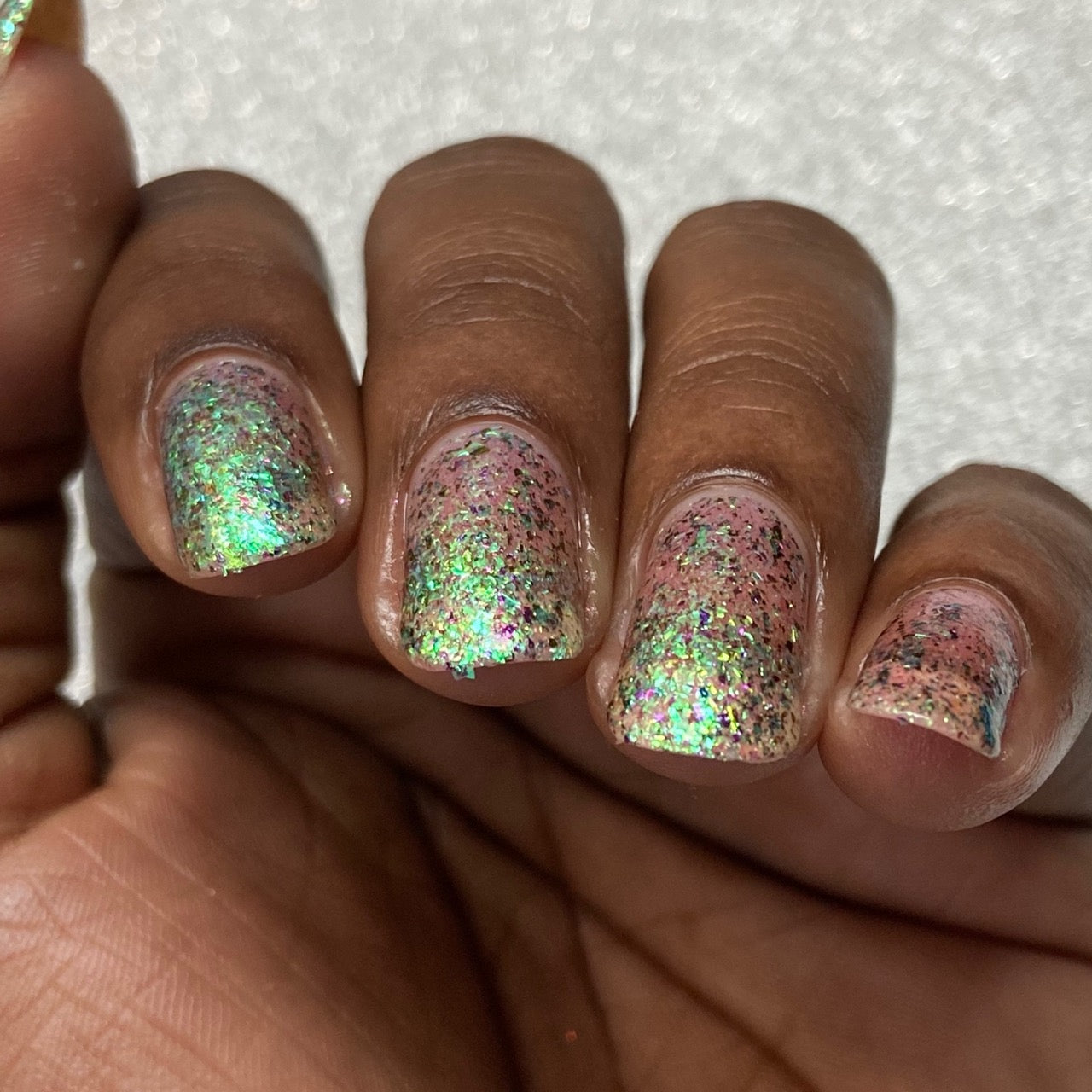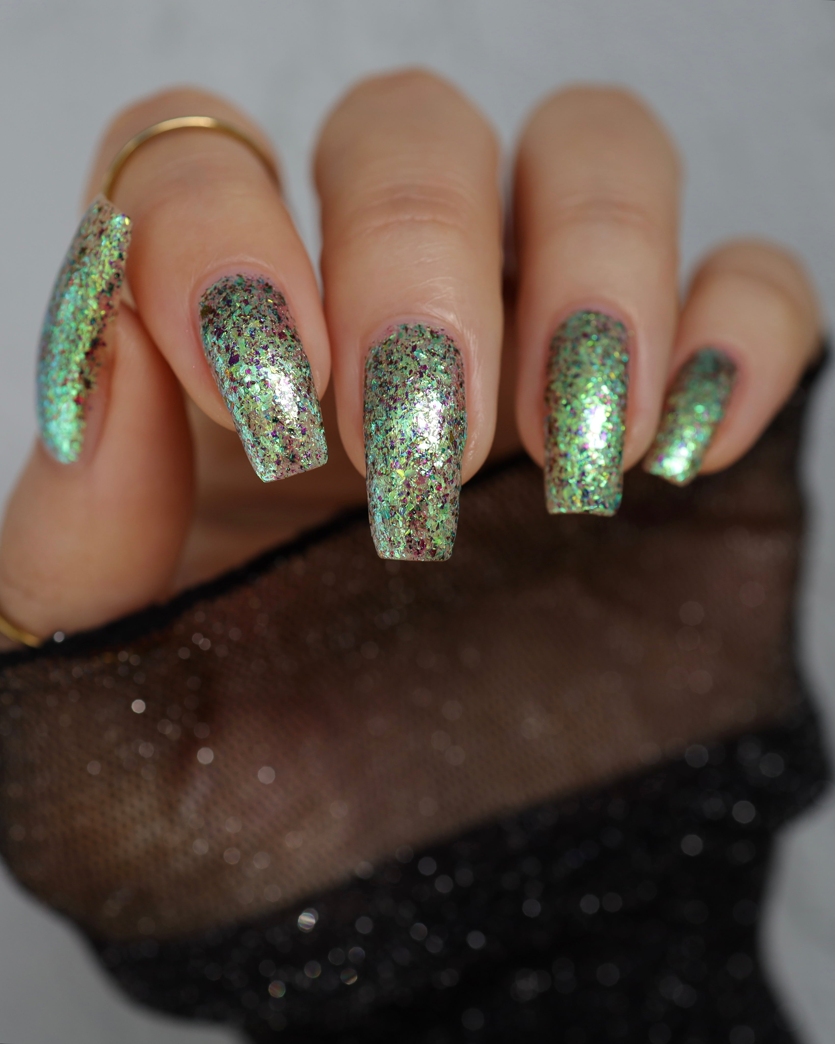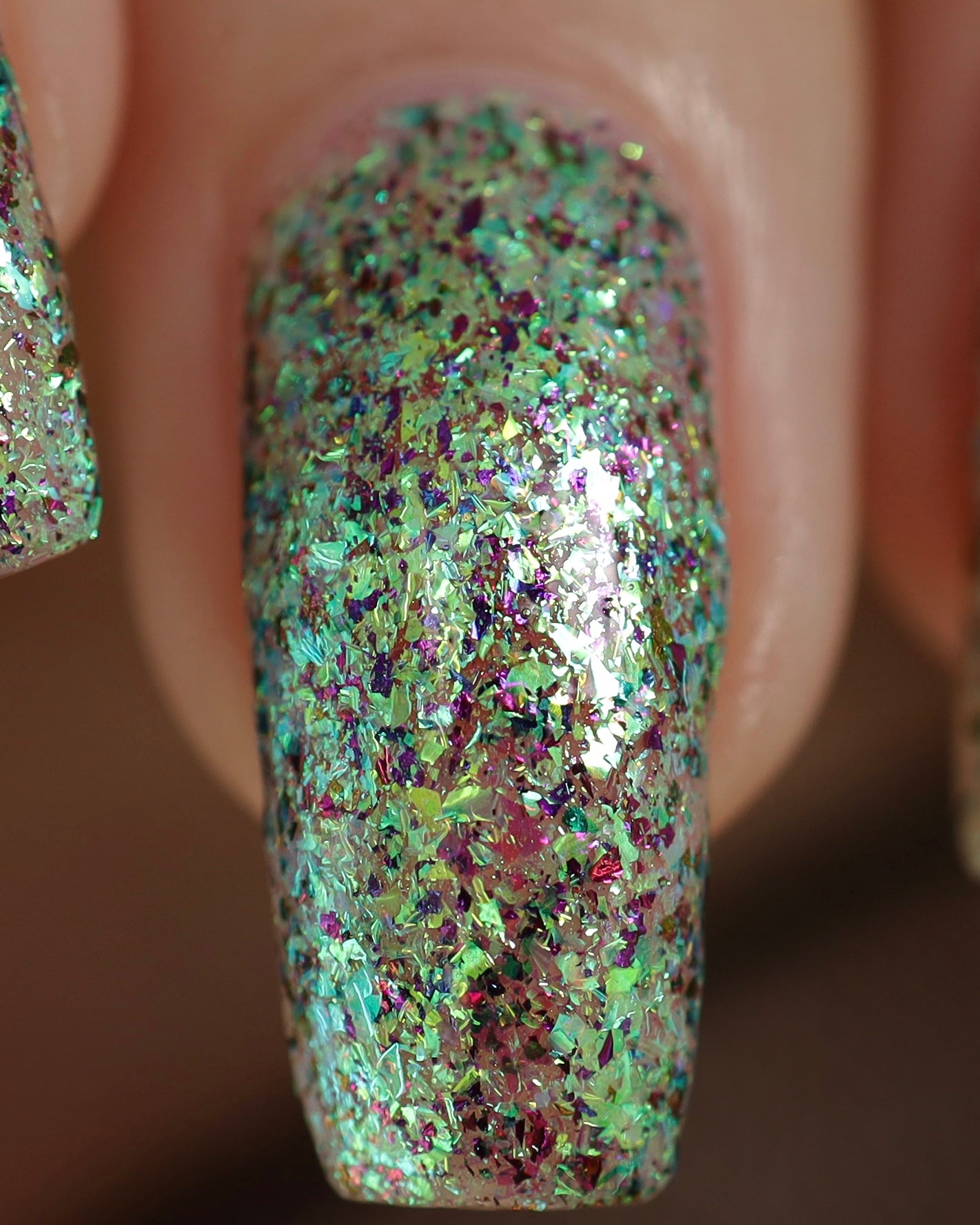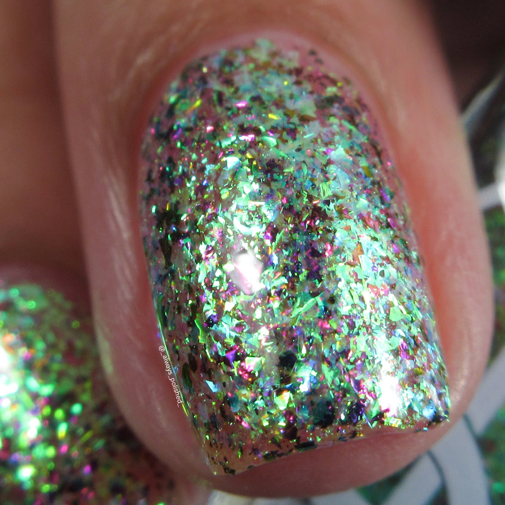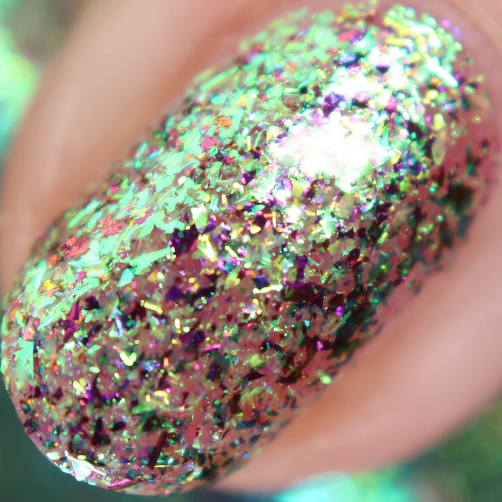 Diamond of the season – a muted turquoise base with large particle pink to orange shimmer