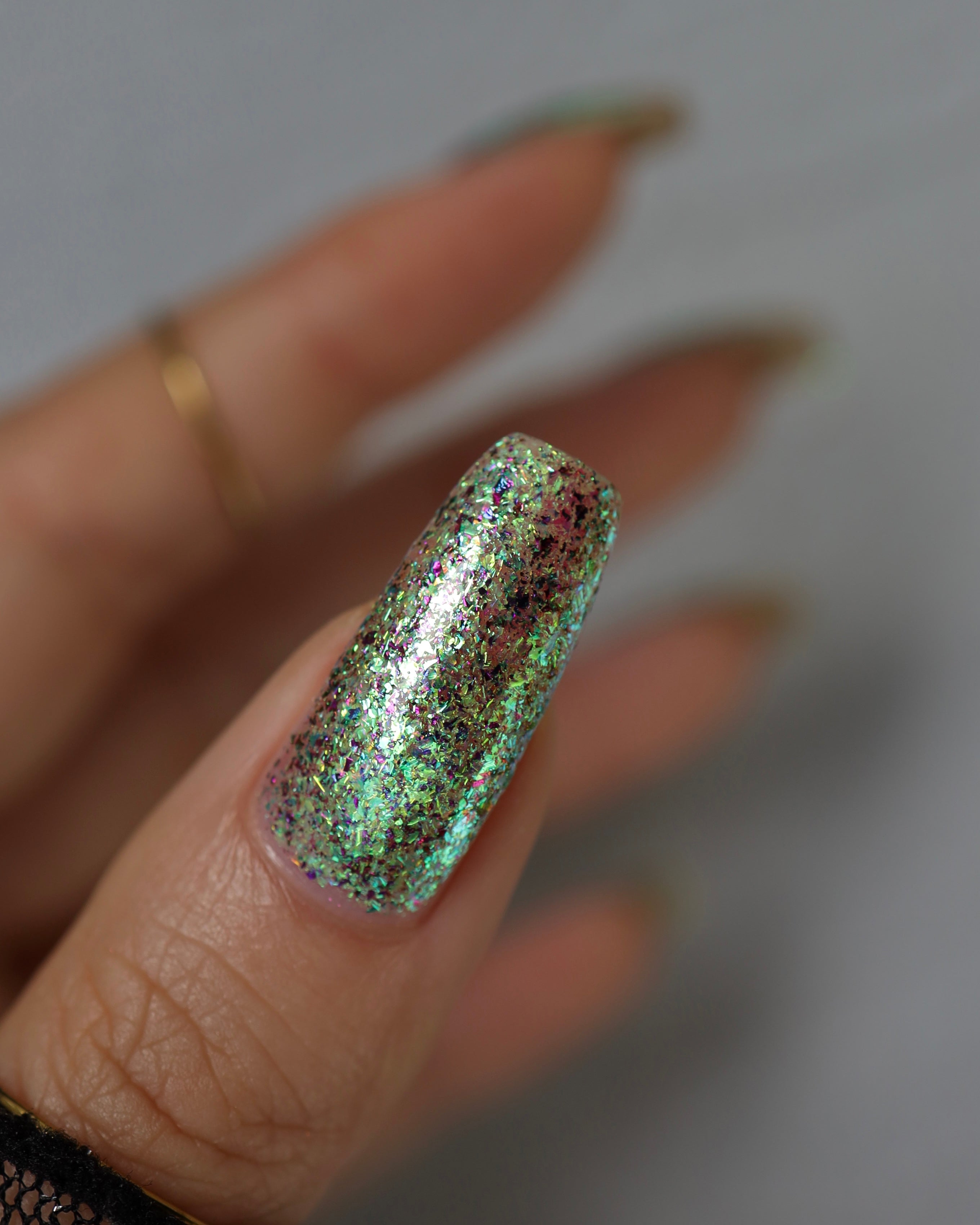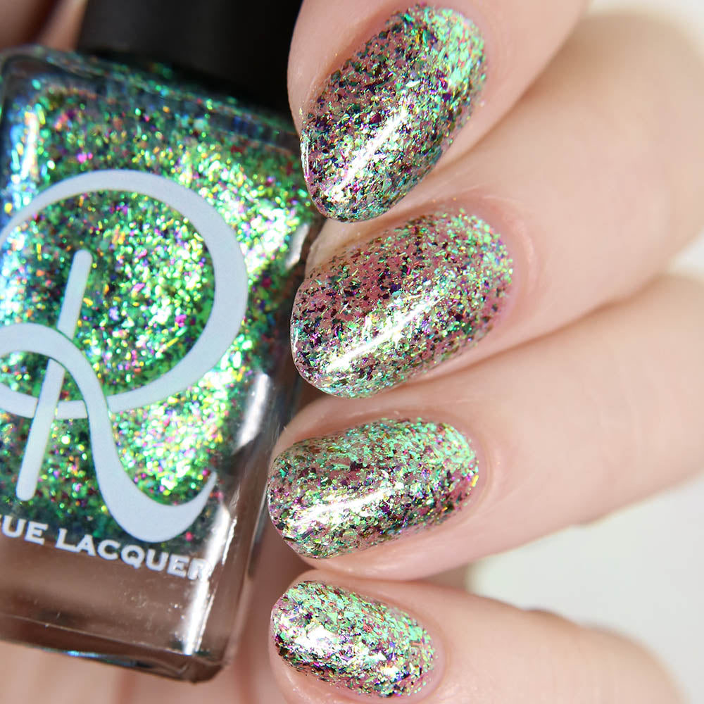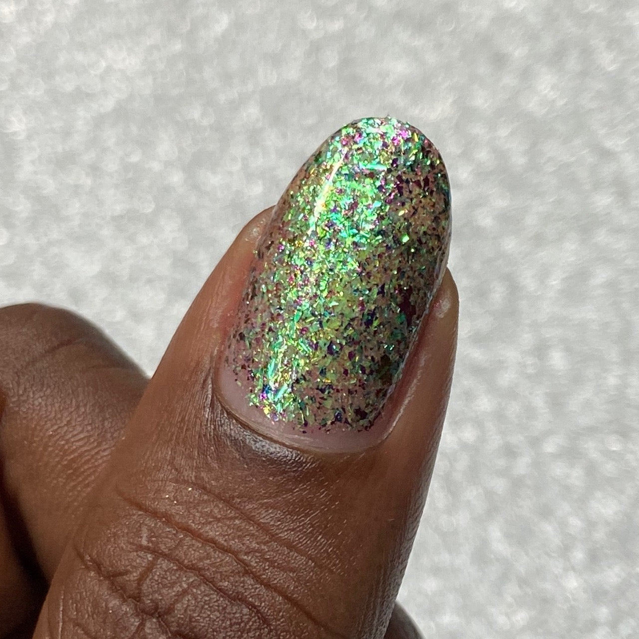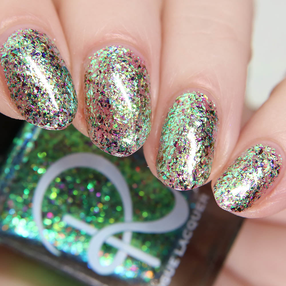 Diamond of the season – a muted turquoise base with large particle pink to orange shimmer