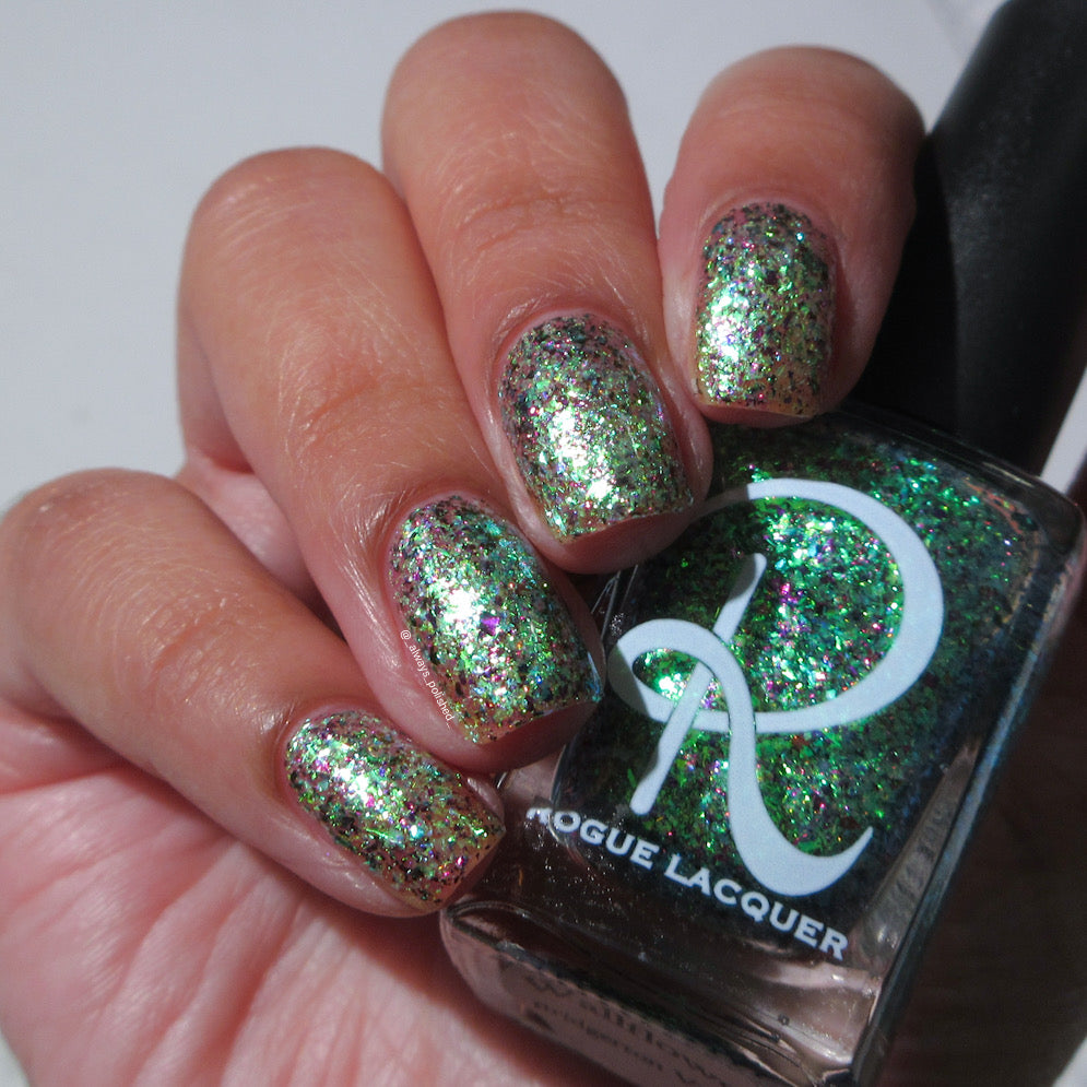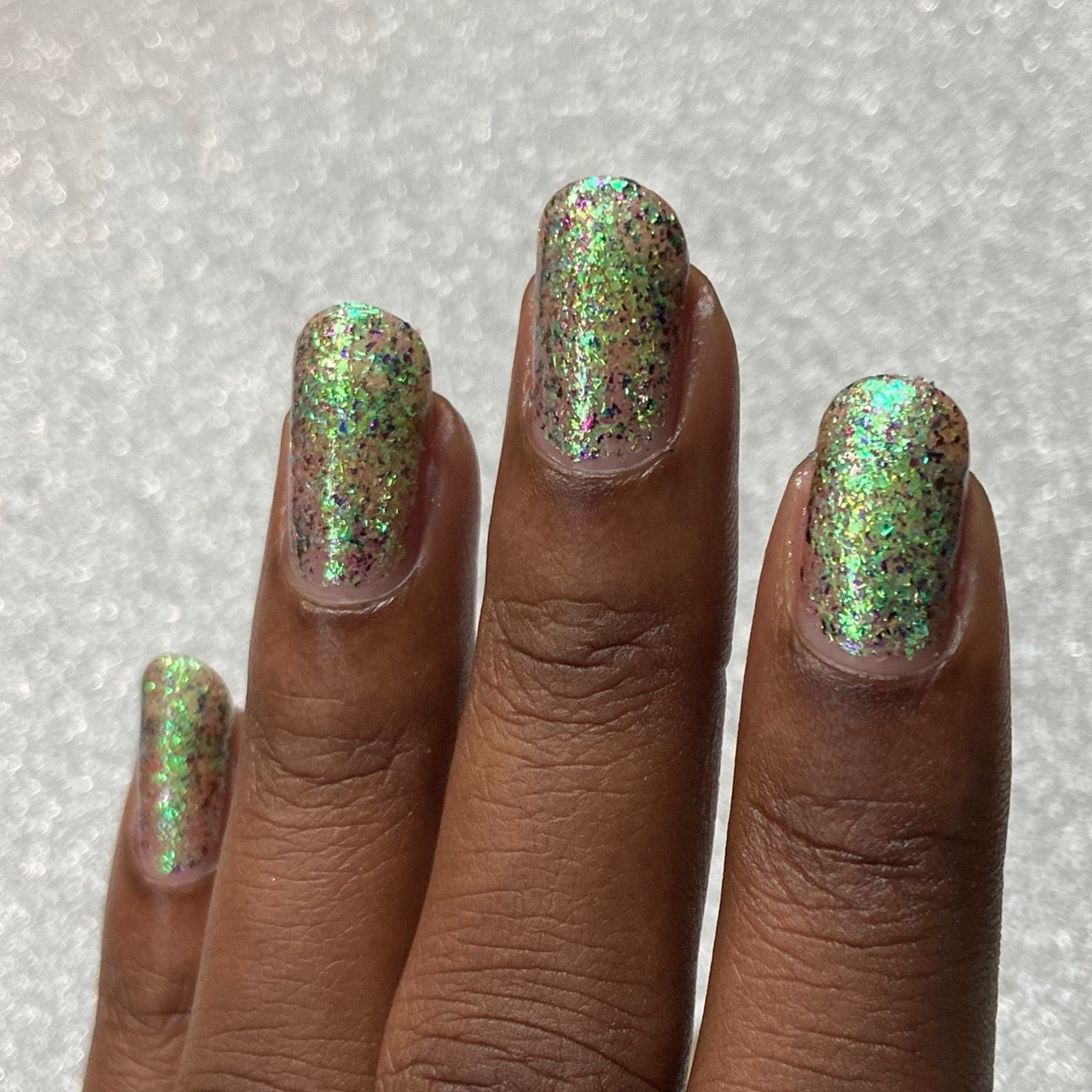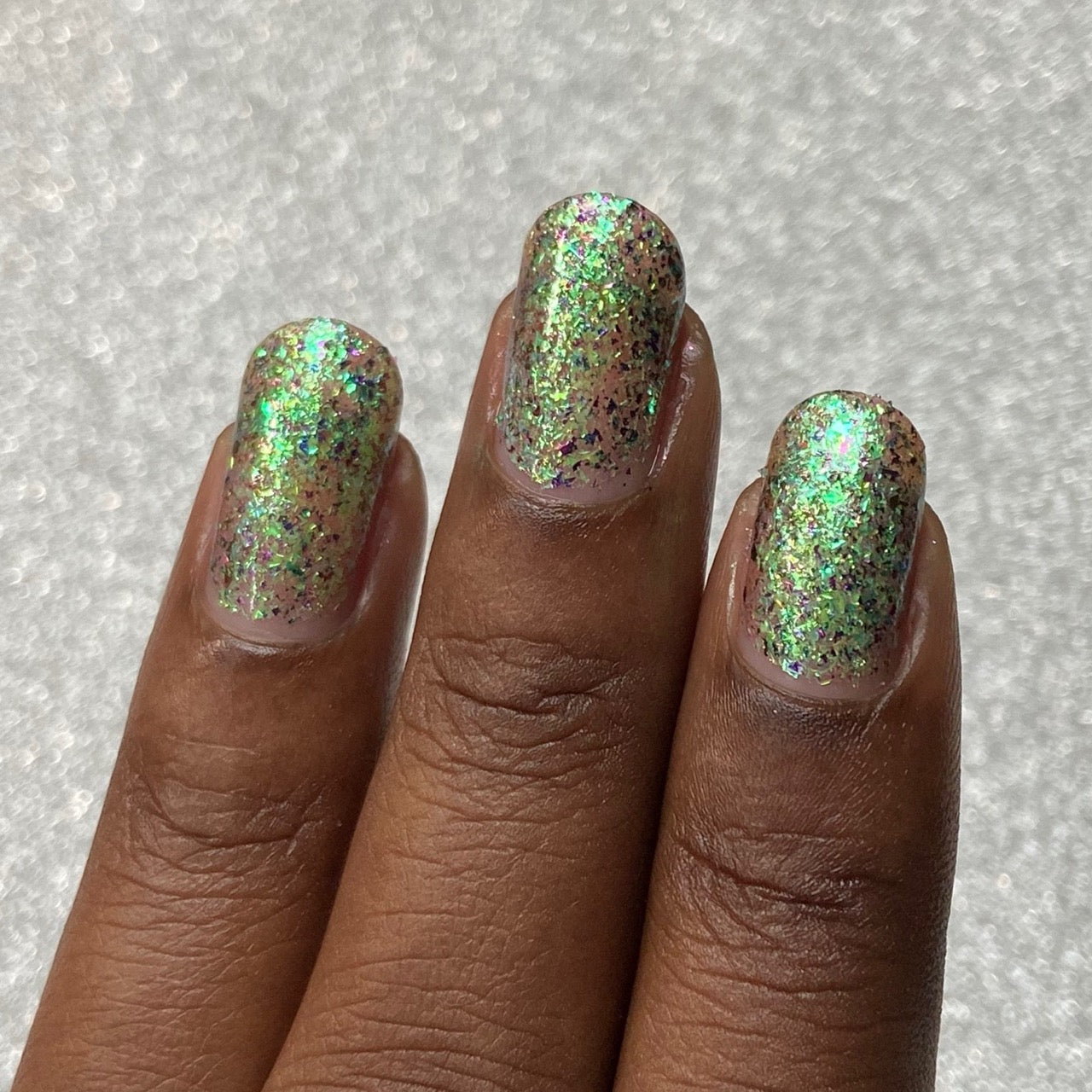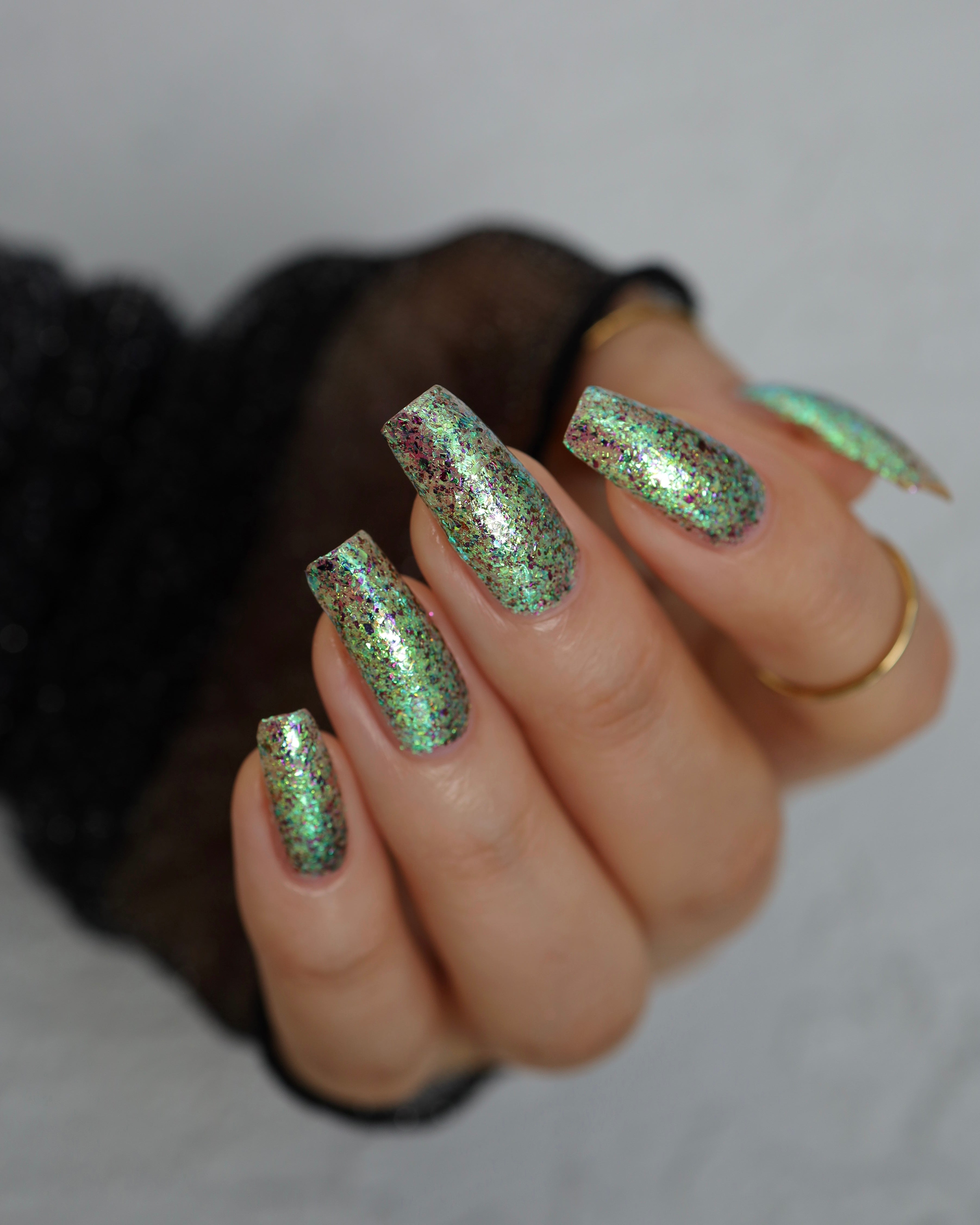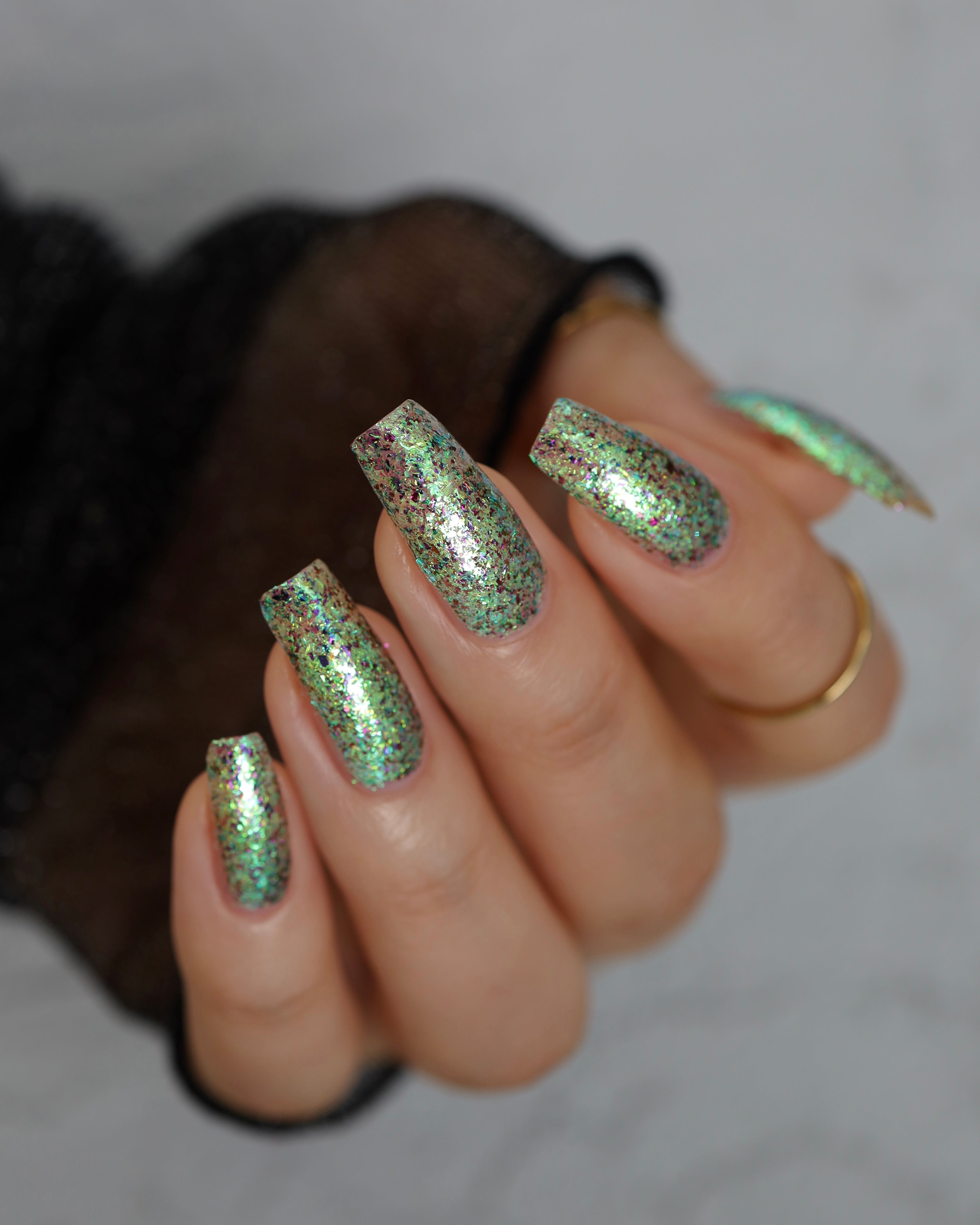 Diamond of the season – a muted turquoise base with large particle pink to orange shimmer