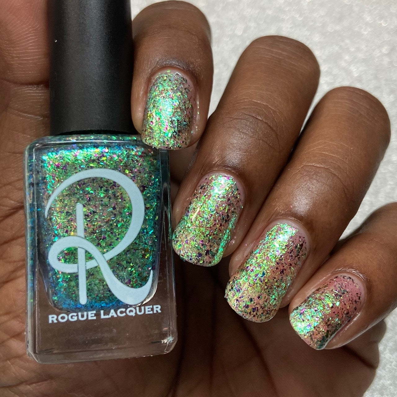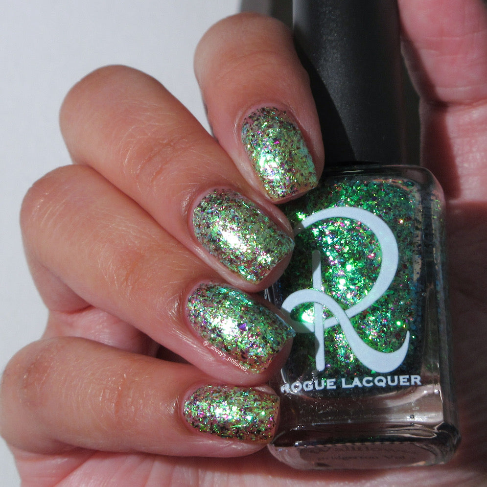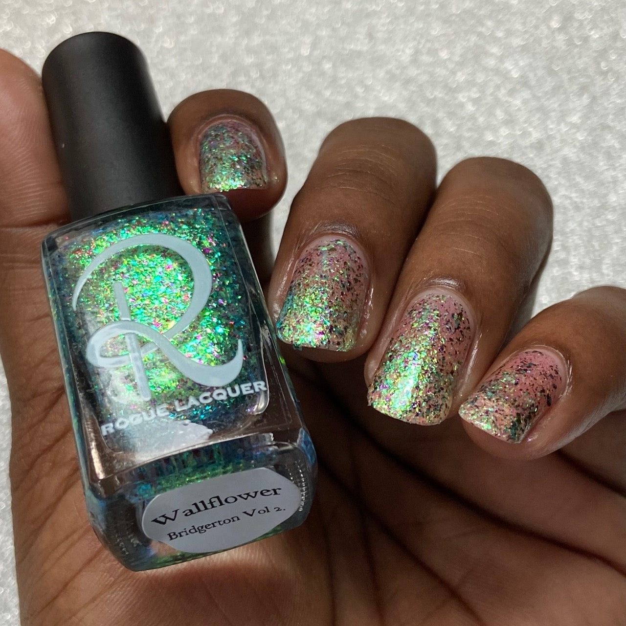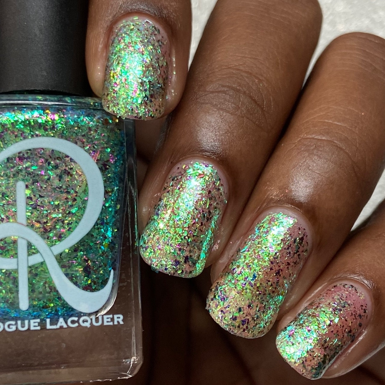 Diamond of the season – a muted turquoise base with large particle pink to orange shimmer